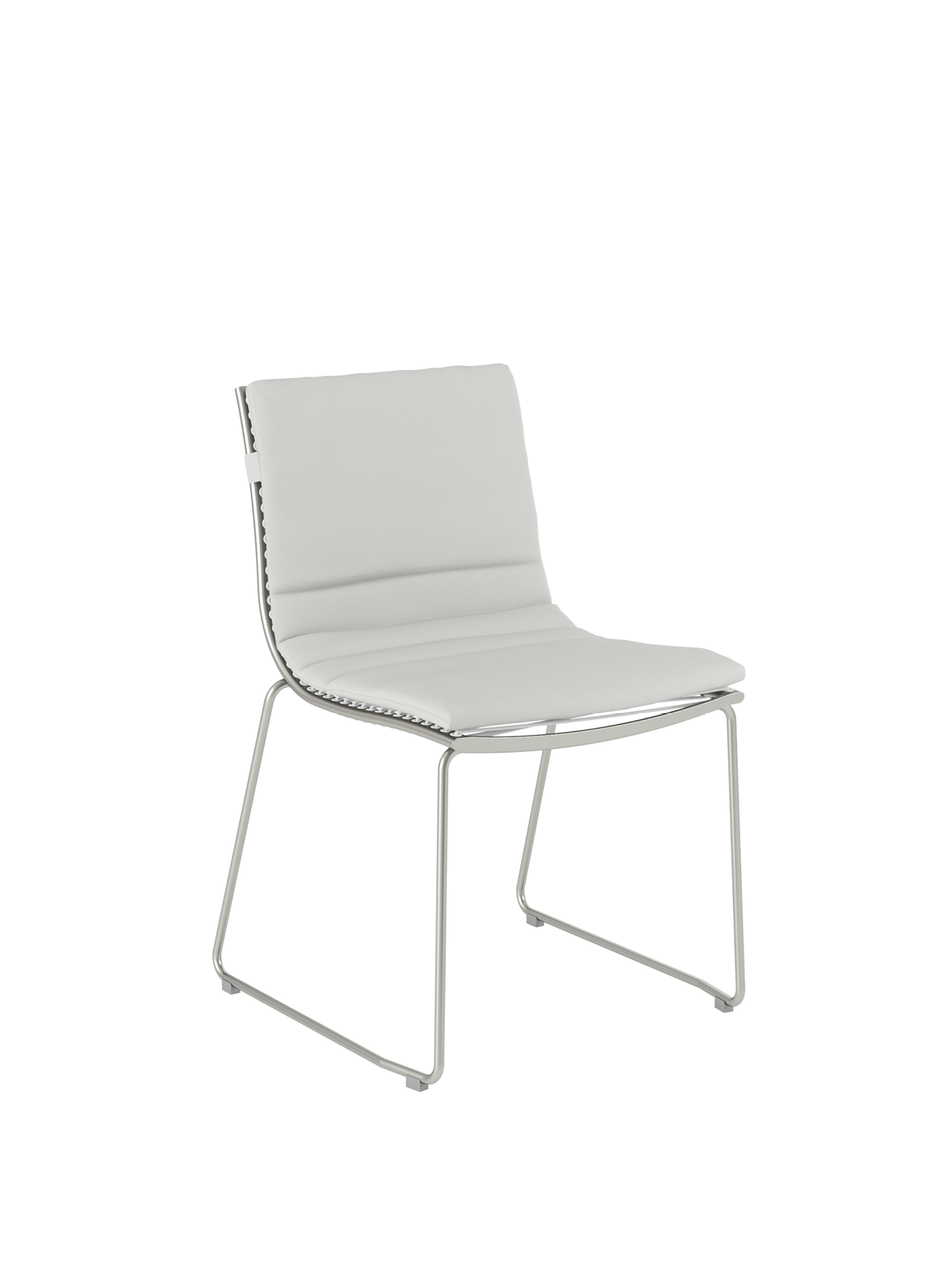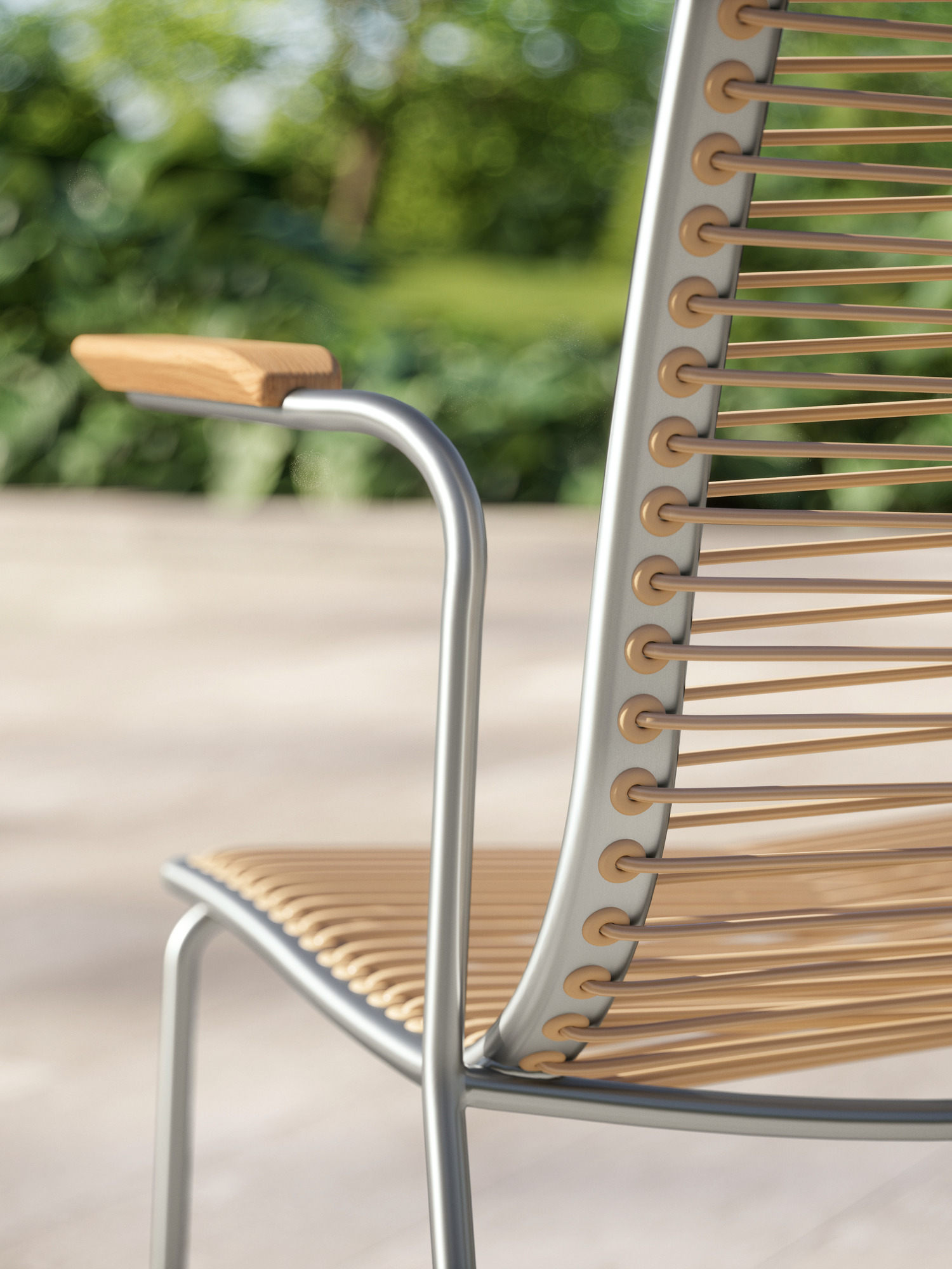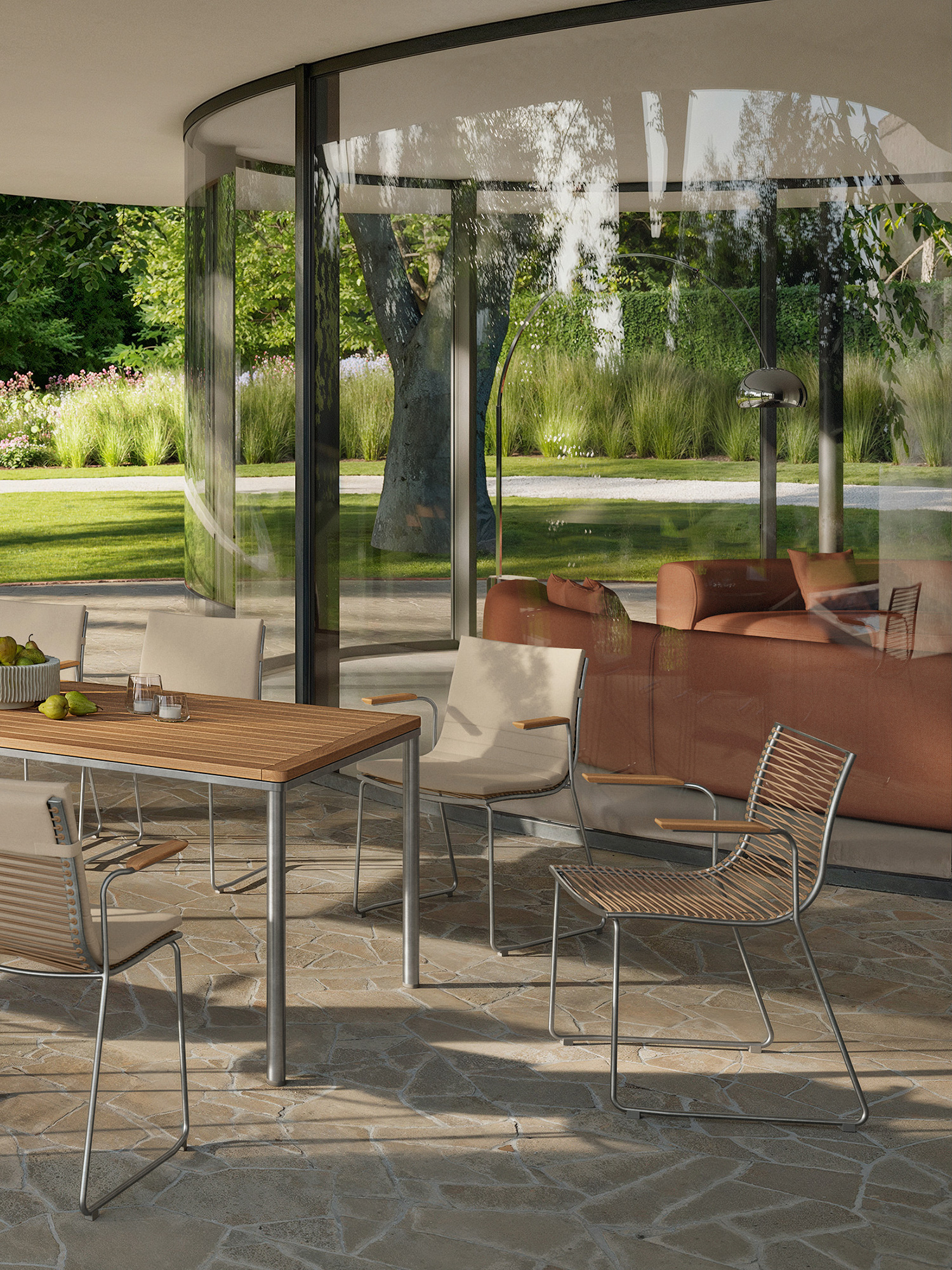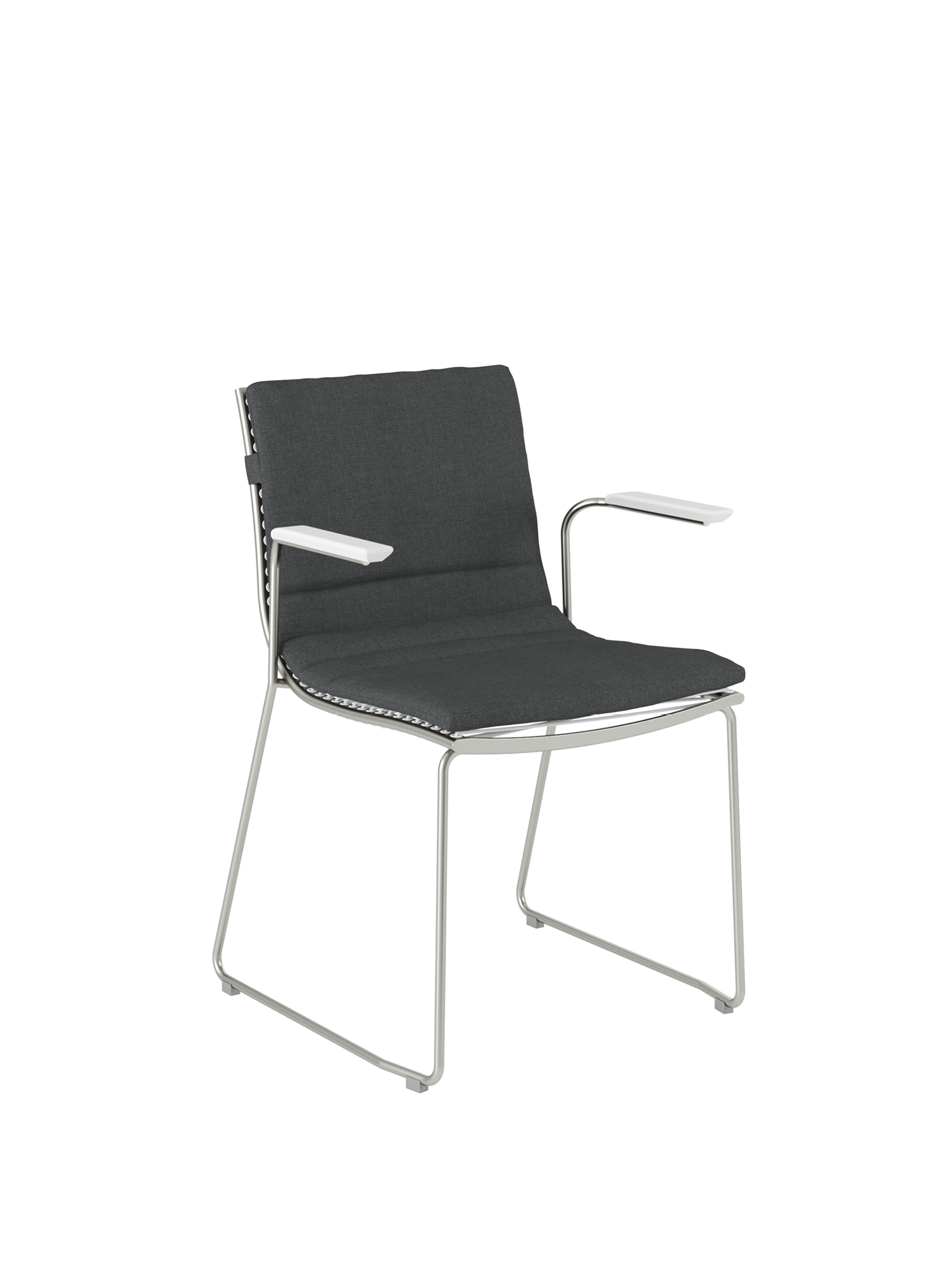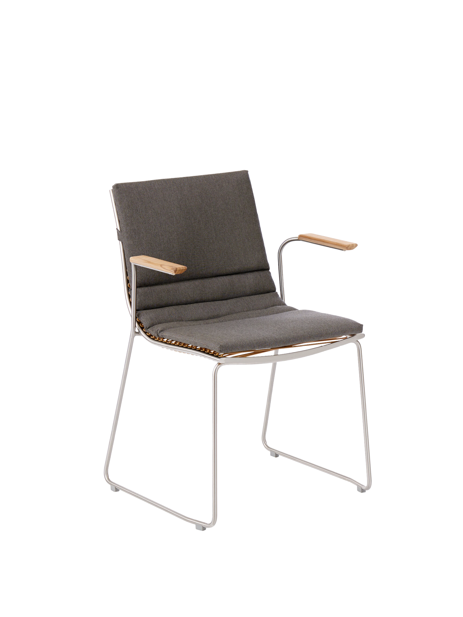 Pan wirkt luftig wie eine leichte Brise. Die eleganten, stapelbaren Stühle mit einem Edelstahlgestell sind mit einer dauerelastischen Faser bespannt, die sich bequem der Körperkontur anpasst.