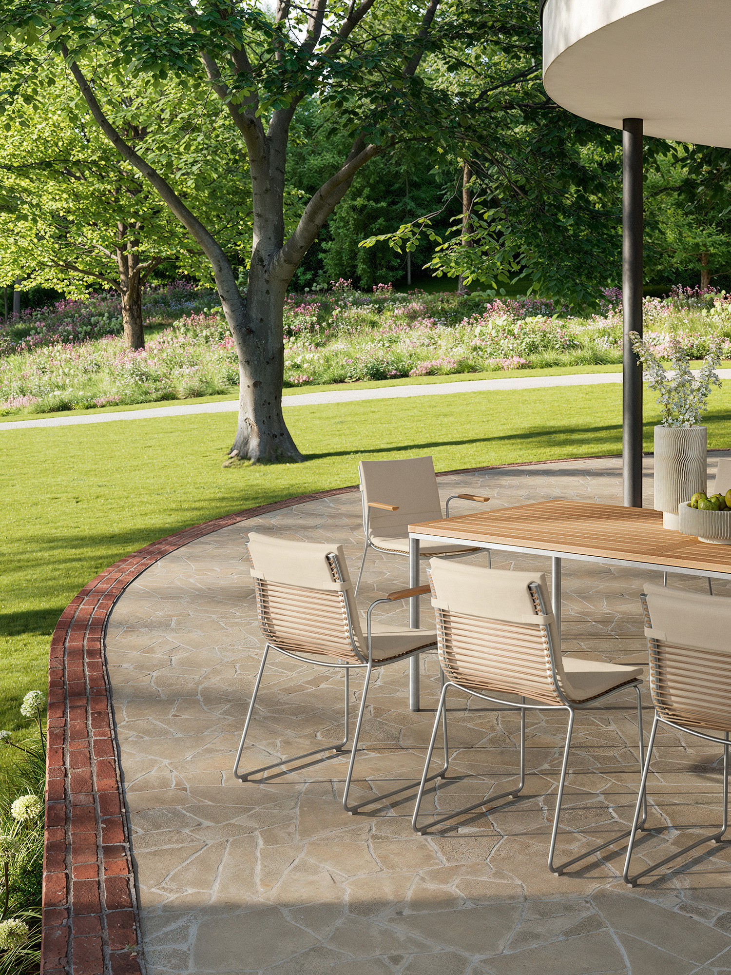 Markantes Merkmal der modernen Sitzmöbel ist ihre Schnürung, die durch dekorative Ösen im Rahmen geführt wird. Die Kunststofffaser ist UV- und frostbeständig und bleibt auch bei Dauergebrauch gut in Form.
