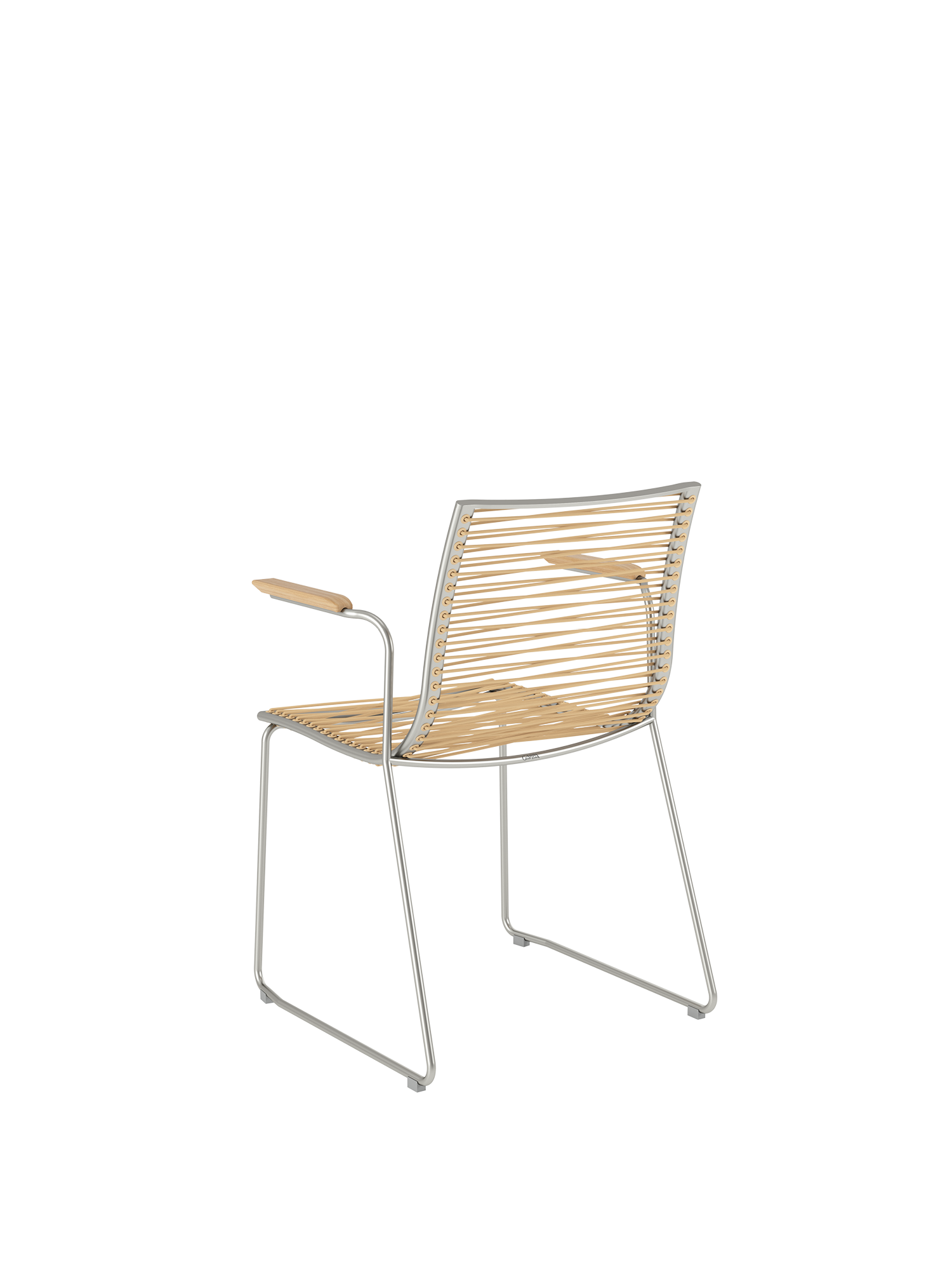 Pan wirkt luftig wie eine leichte Brise. Die stapelbaren Stühle haben Gestelle aus Edelstahl und Armlehnen aus Teakholz. Sie sind mit einer dauerelastischen Faser bespannt, die sich bequem der Körperkontur anpasst.