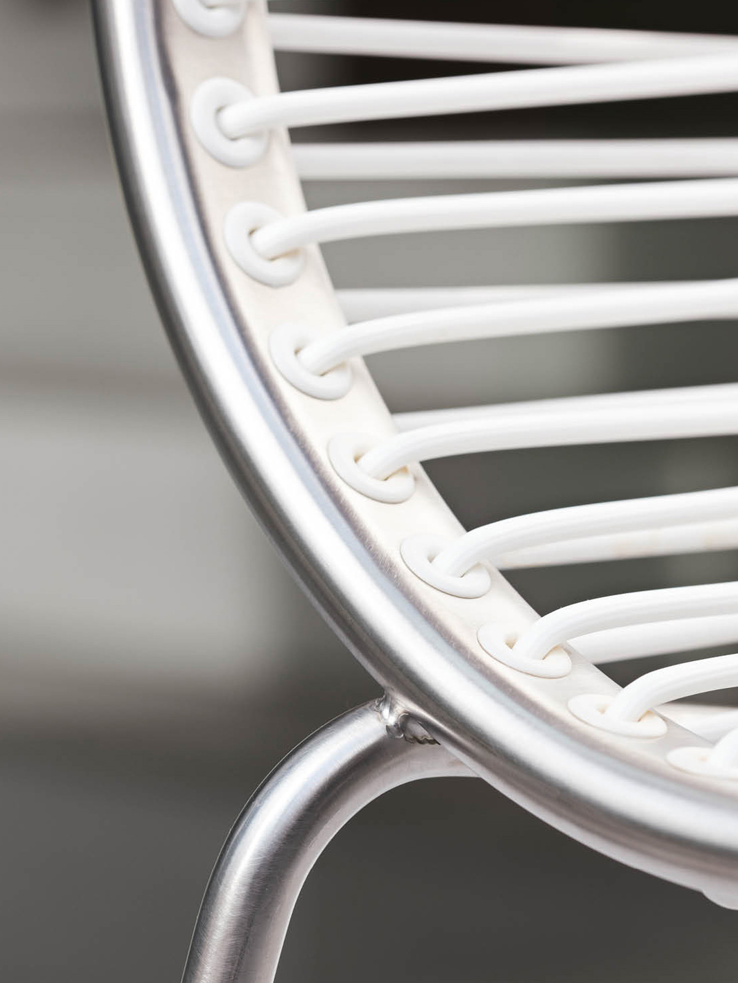 Markantes Merkmal der modernen Sitzmöbel ist ihre Schnürung, die durch dekorative Ösen im Rahmen geführt wird. Die Kunststofffaser ist UV- und frostbeständig und bleibt auch bei Dauergebrauch gut in Form.