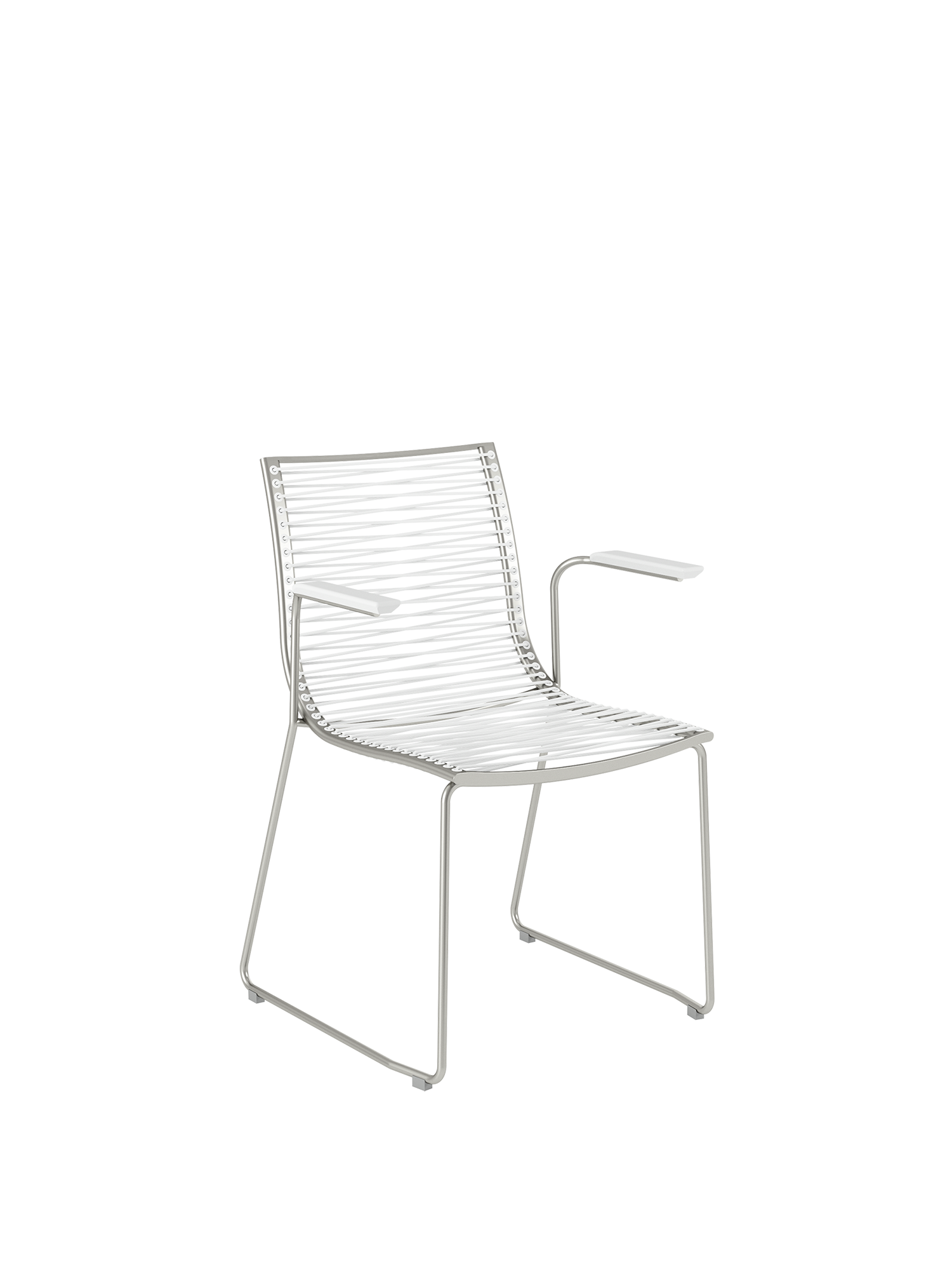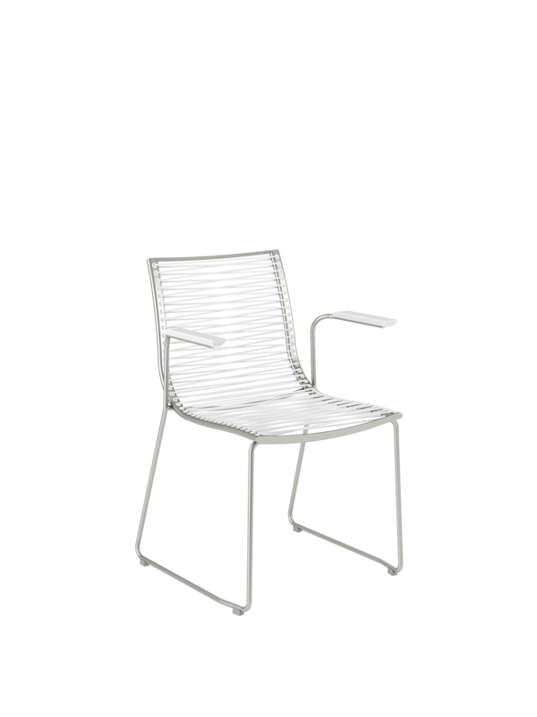 Pan wirkt luftig wie eine leichte Brise. Die eleganten, stapelbaren Stühle mit einem Edelstahlgestell sind mit einer dauerelastischen Faser bespannt, die sich bequem der Körperkontur anpasst.