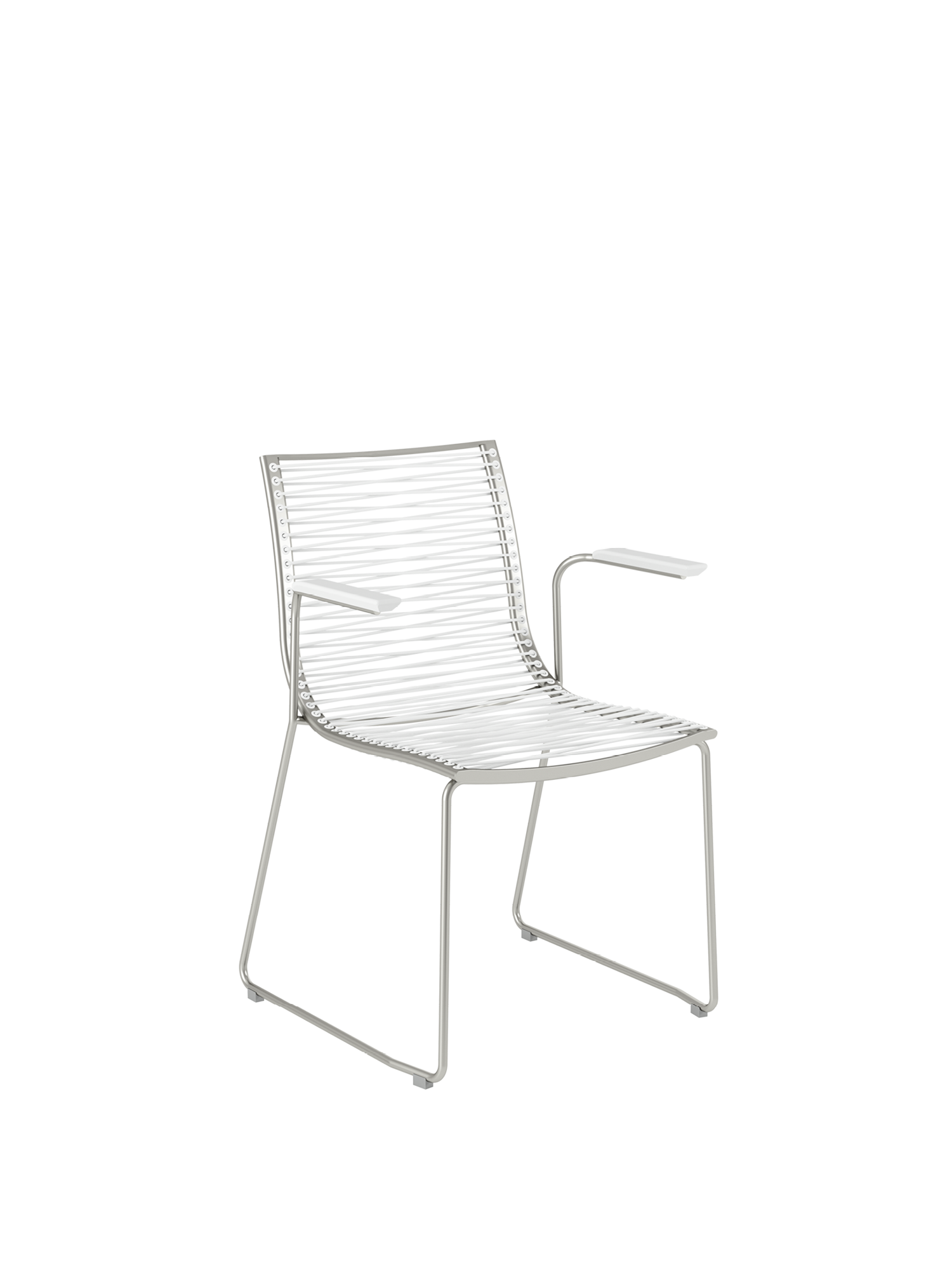 Pan wirkt luftig wie eine leichte Brise. Die stapelbaren Stühle haben Gestelle aus Edelstahl und Armlehnen aus Kunststoff. Sie sind mit einer dauerelastischen Faser bespannt, die sich bequem der Körperkontur anpasst.