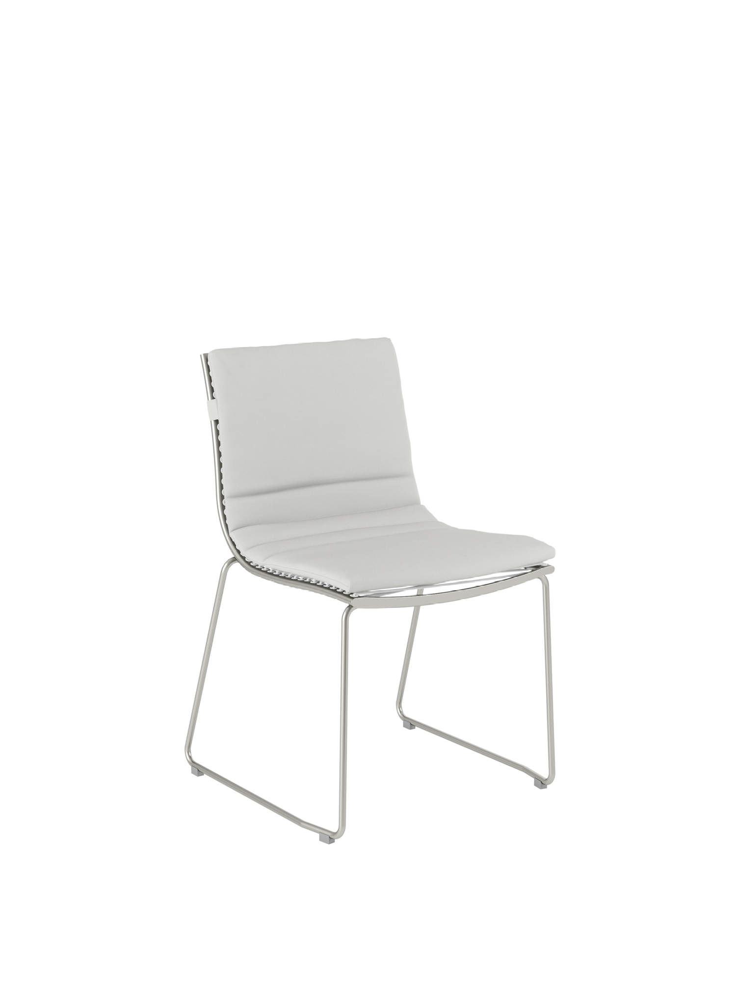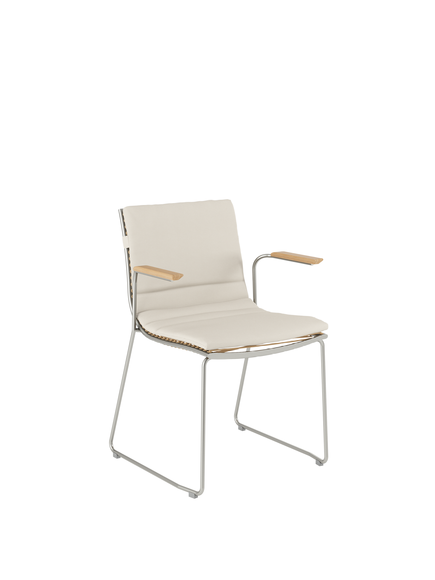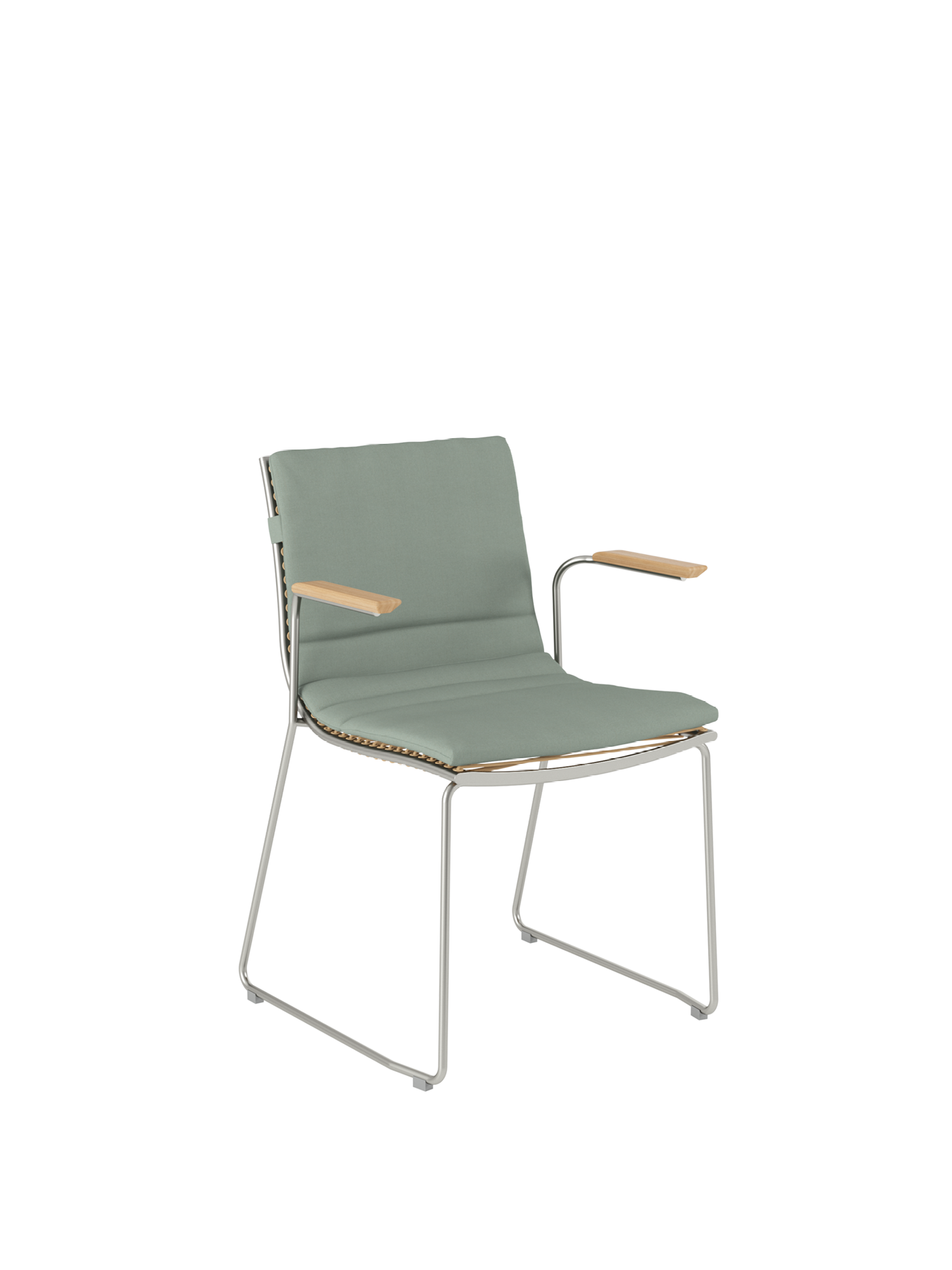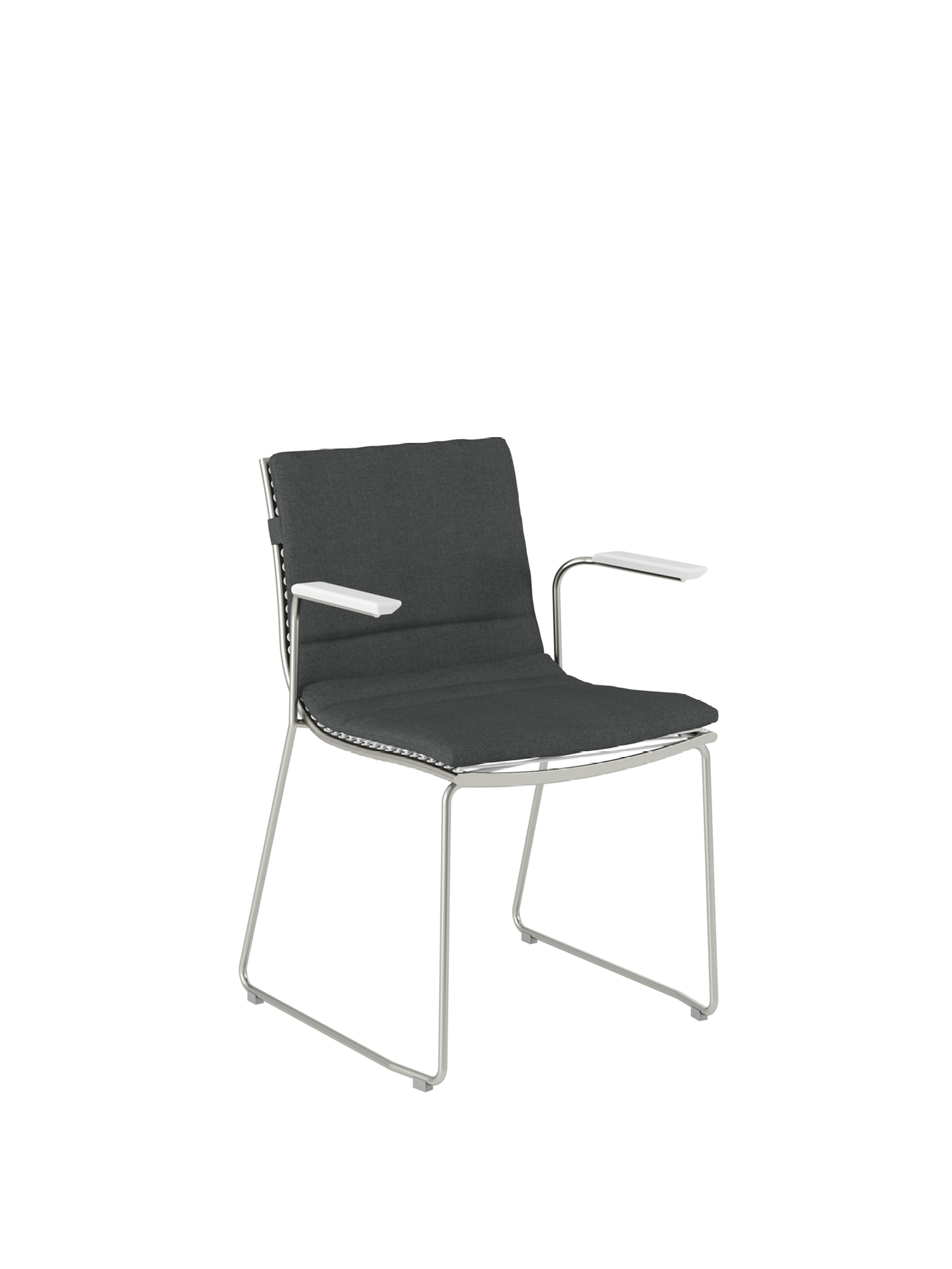 Pan wirkt luftig wie eine leichte Brise. Die eleganten, stapelbaren Stühle mit einem Edelstahlgestell sind mit einer dauerelastischen Faser bespannt, die sich bequem der Körperkontur anpasst.
