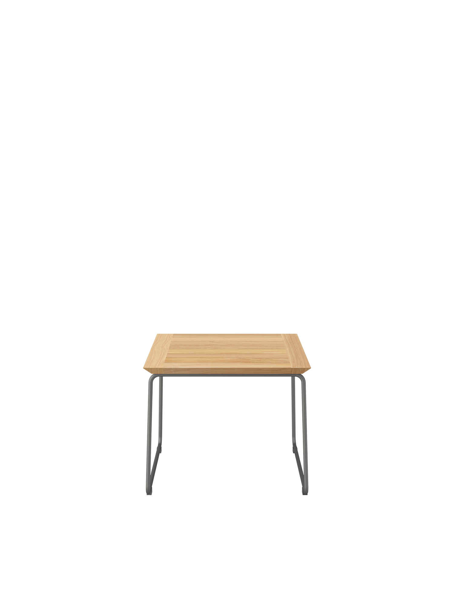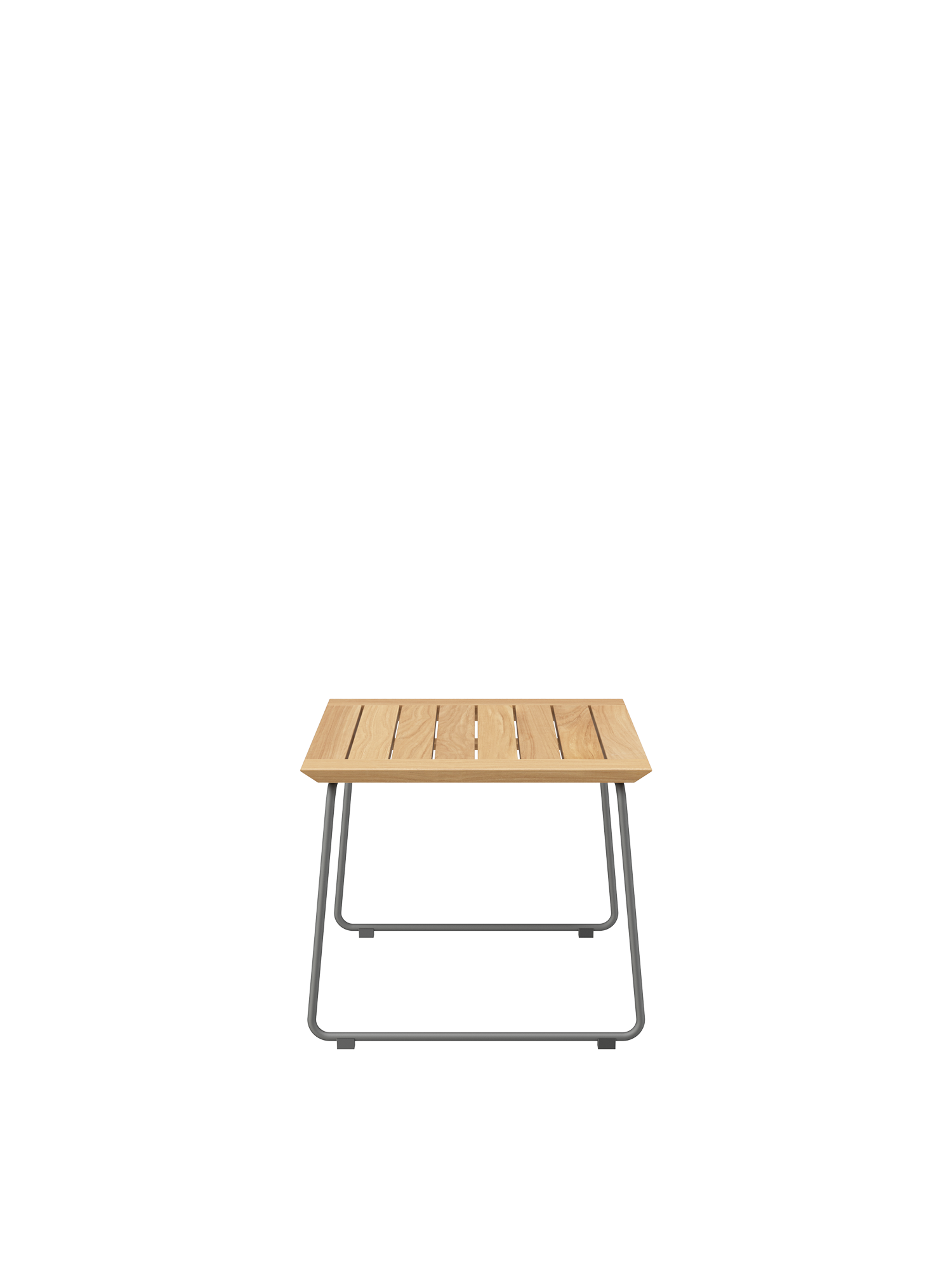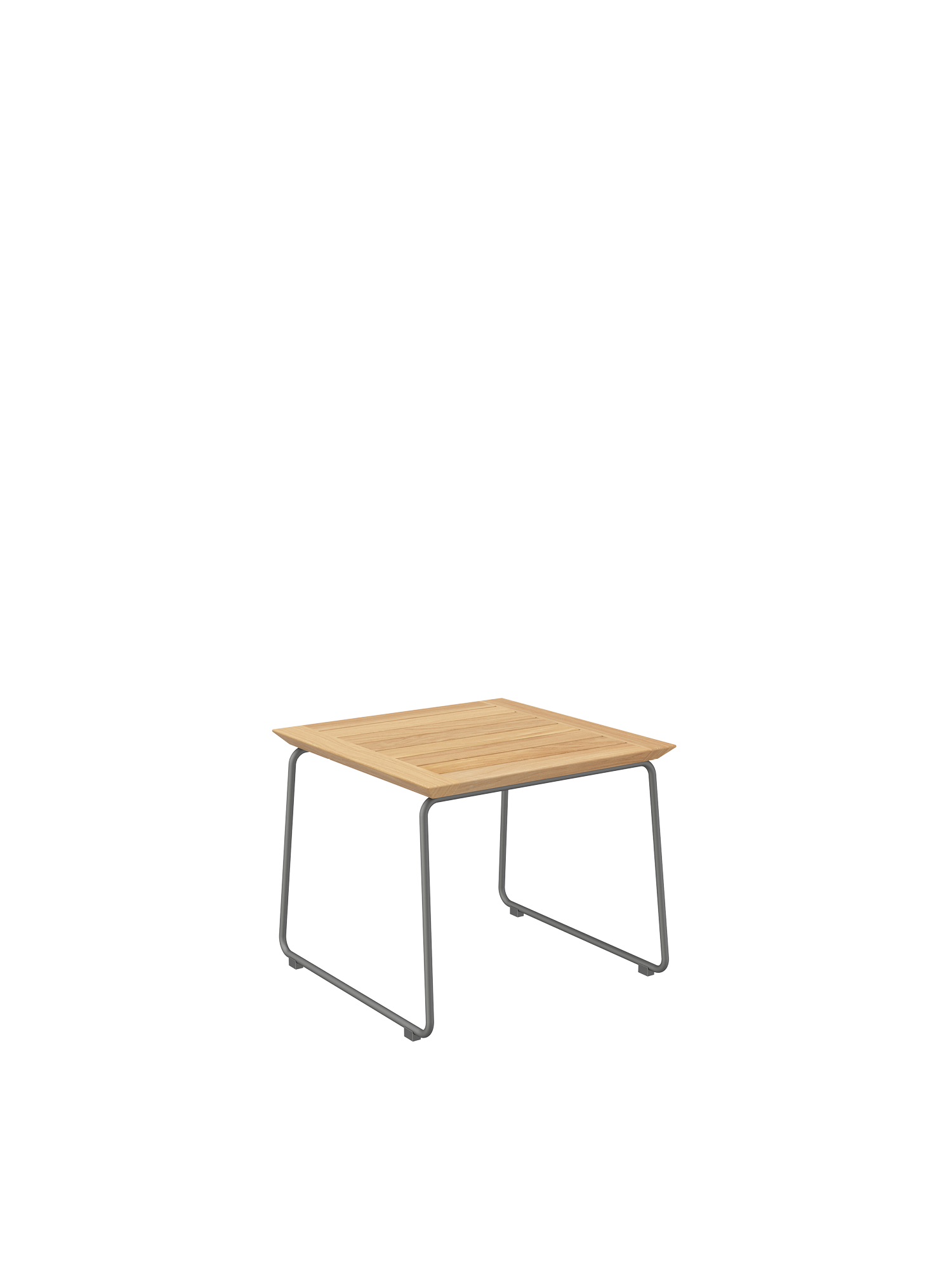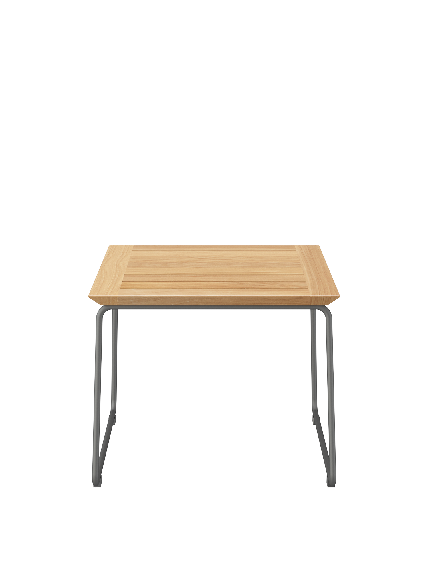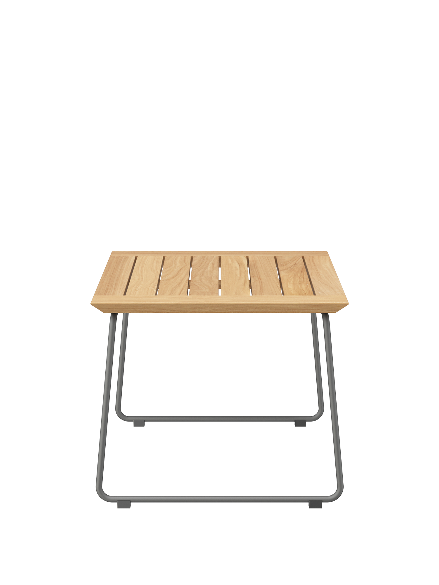 Der moderne Beistelltisch hat ein Gestell aus graphitgrau pulverbeschichtetem Edelstahl und eine Tischplatte aus Teakleisten.