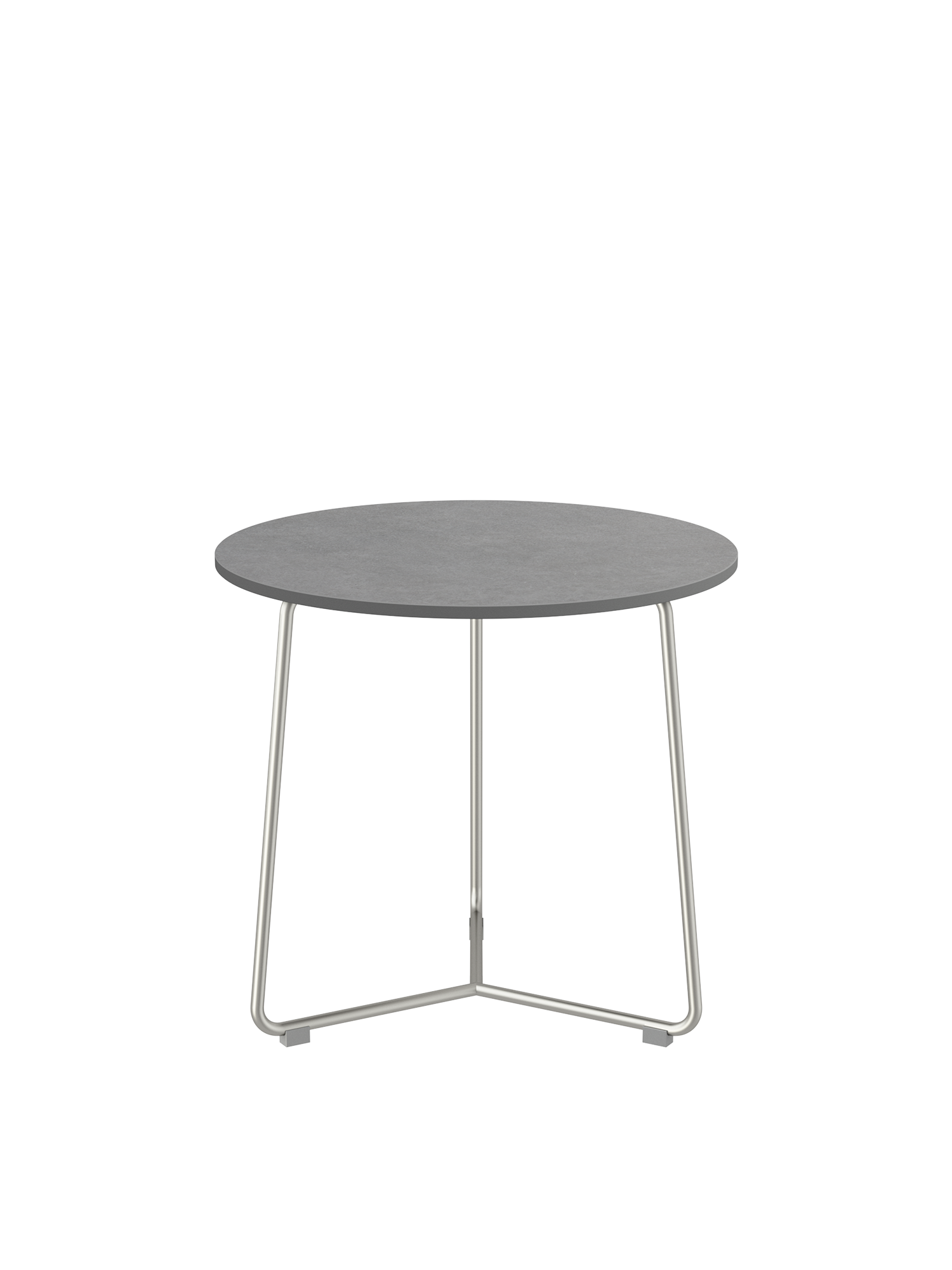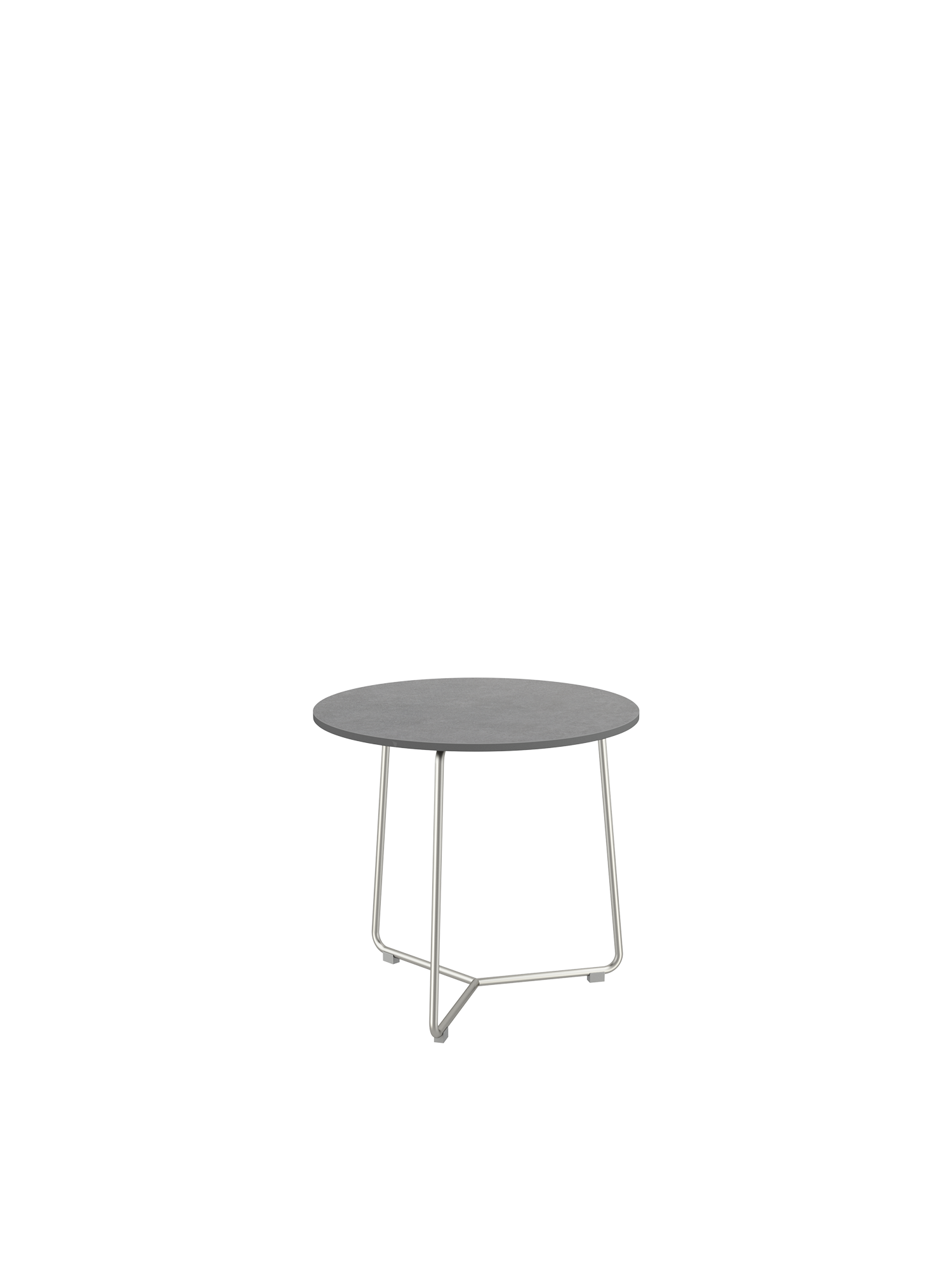 Der runde Beistelltisch mit einem Gestell aus Edelstahl trägt eine Platte aus Kunstharz in einem eleganten Grauton. Das hochwertige Material ist wetter- und UV-beständig.
