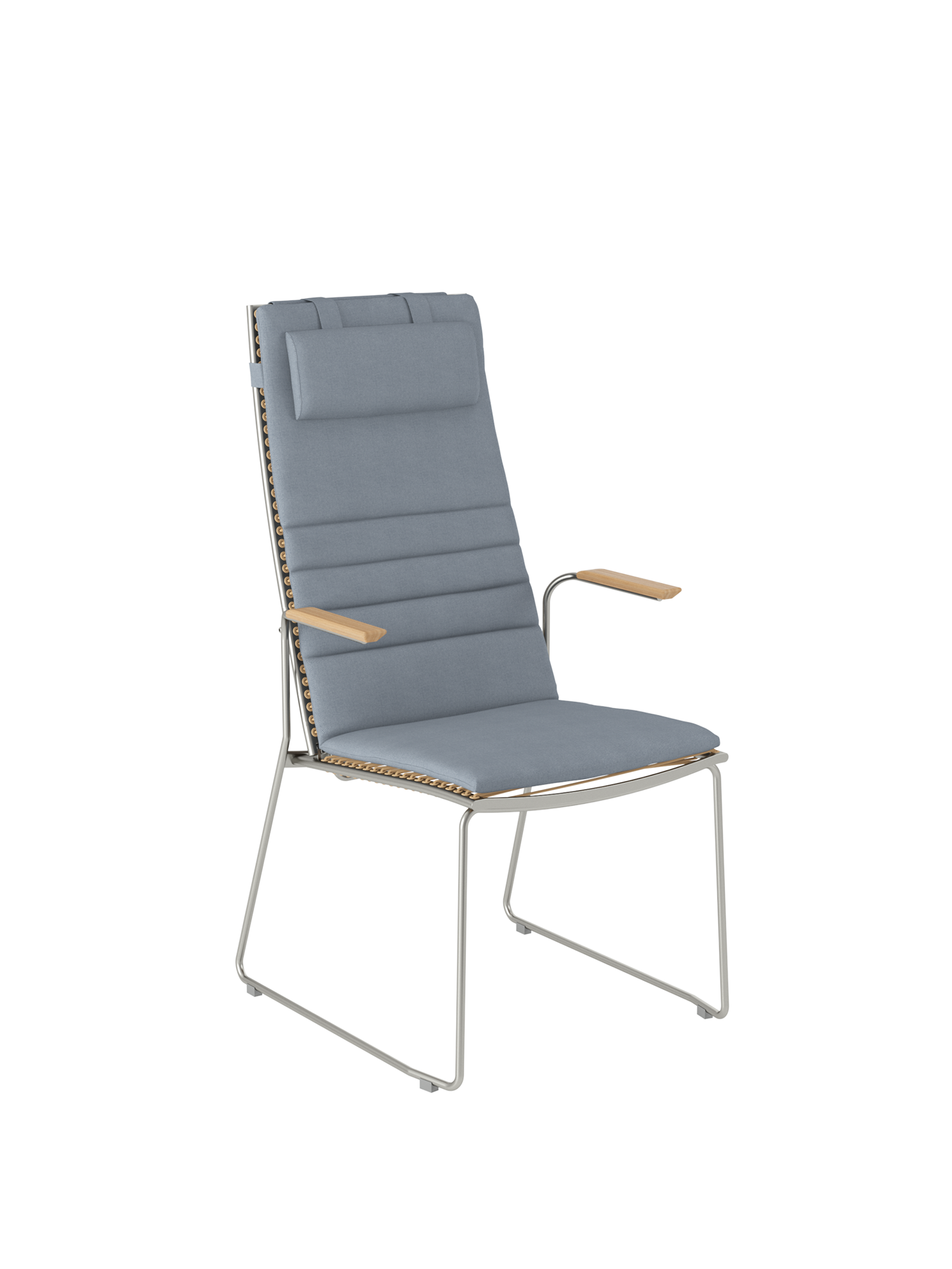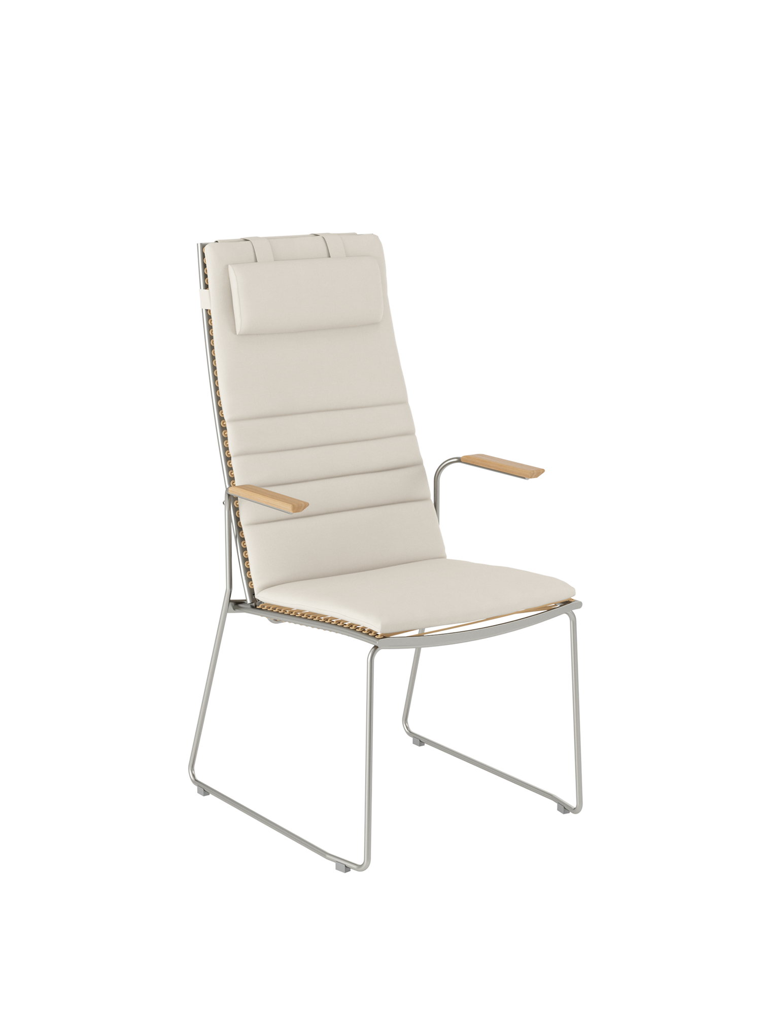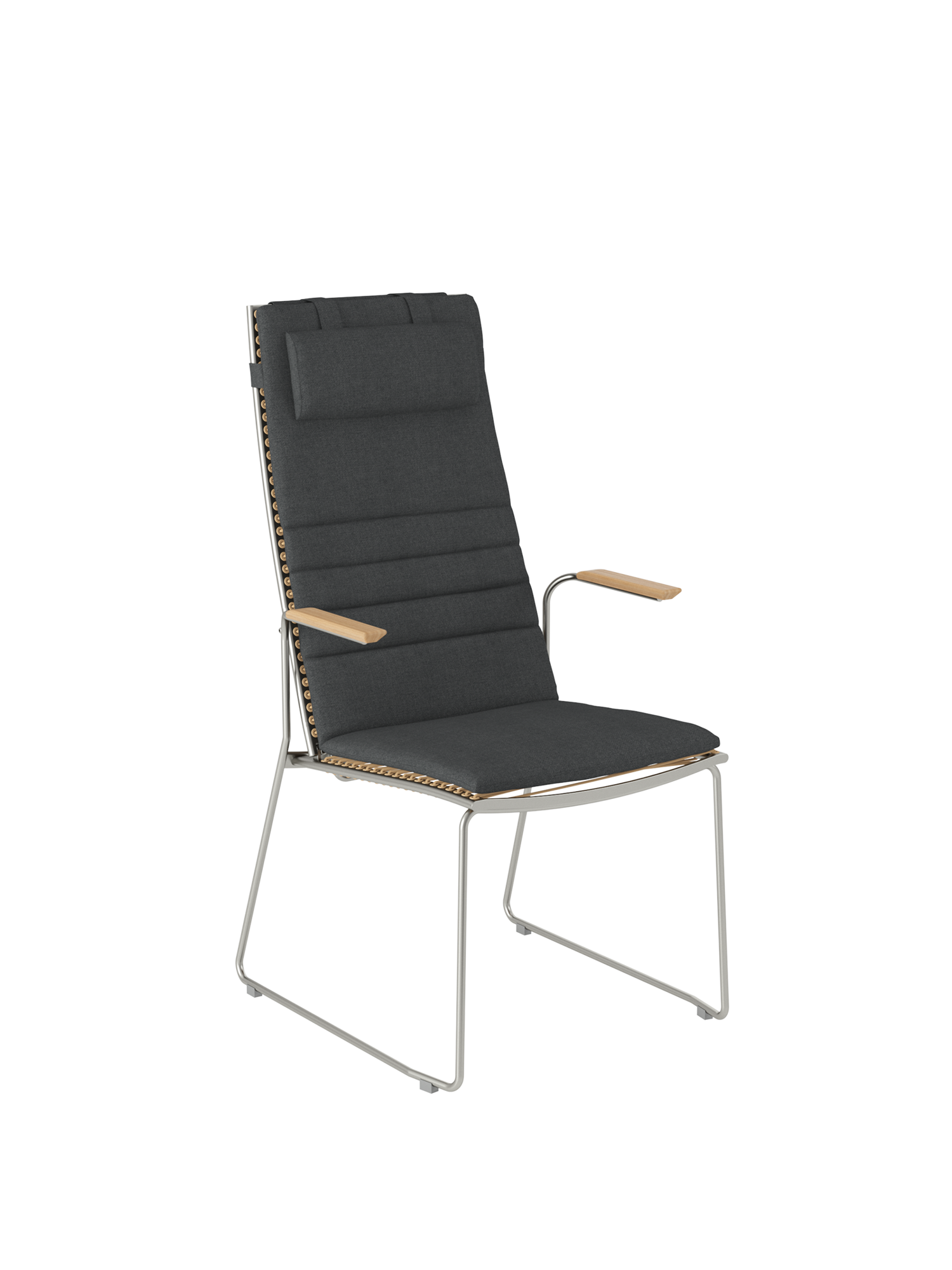Pan wirkt luftig wie eine leichte Brise. Die eleganten Hochlehner mit einem Edelstahlgestell sind mit einer dauerelastischen Faser bespannt, die sich bequem der Körperkontur anpasst. Die Stühle mit der hohen Rückenlehne lassen sich ideal mit dem passenden Hocker kombinieren.