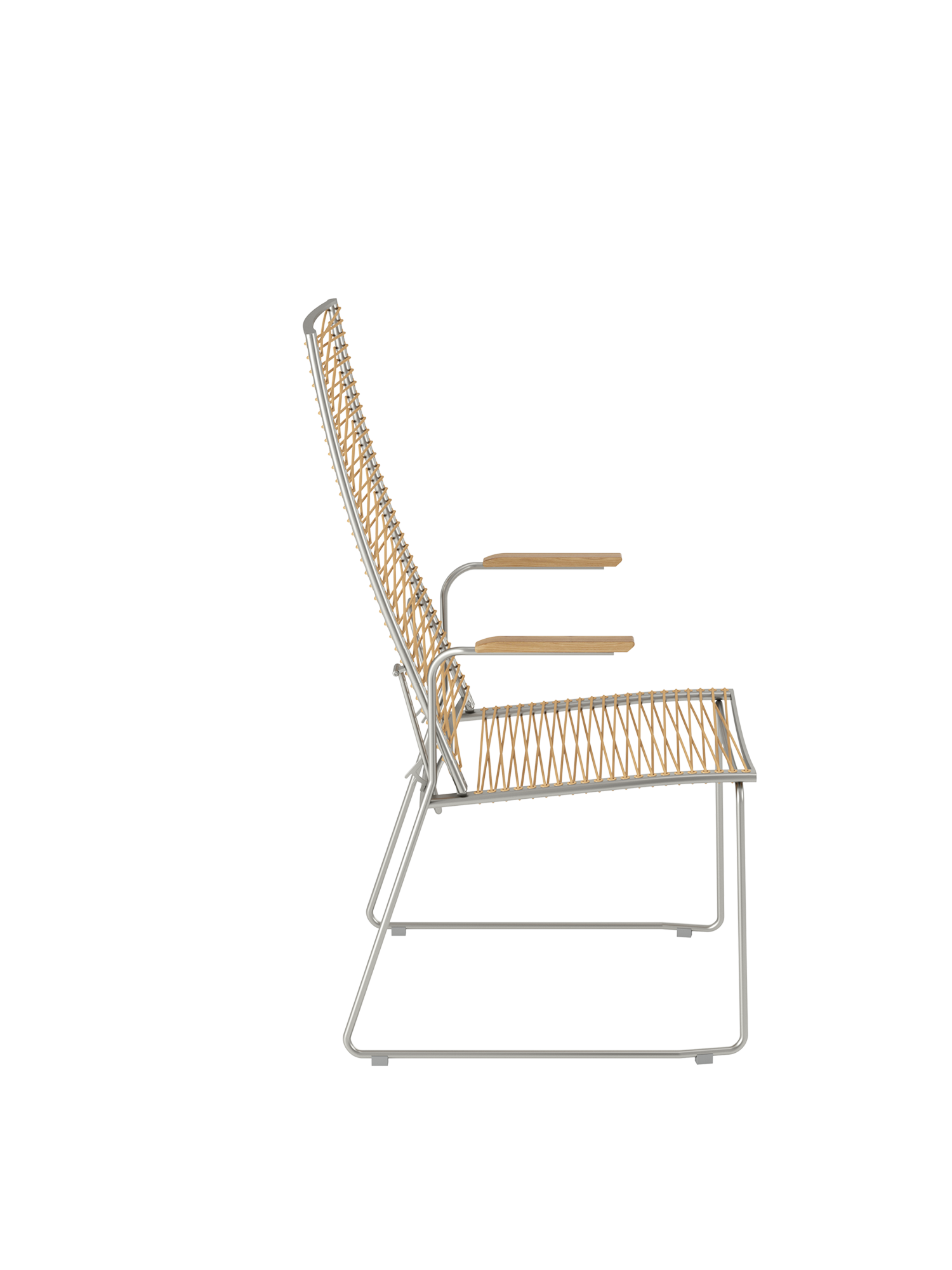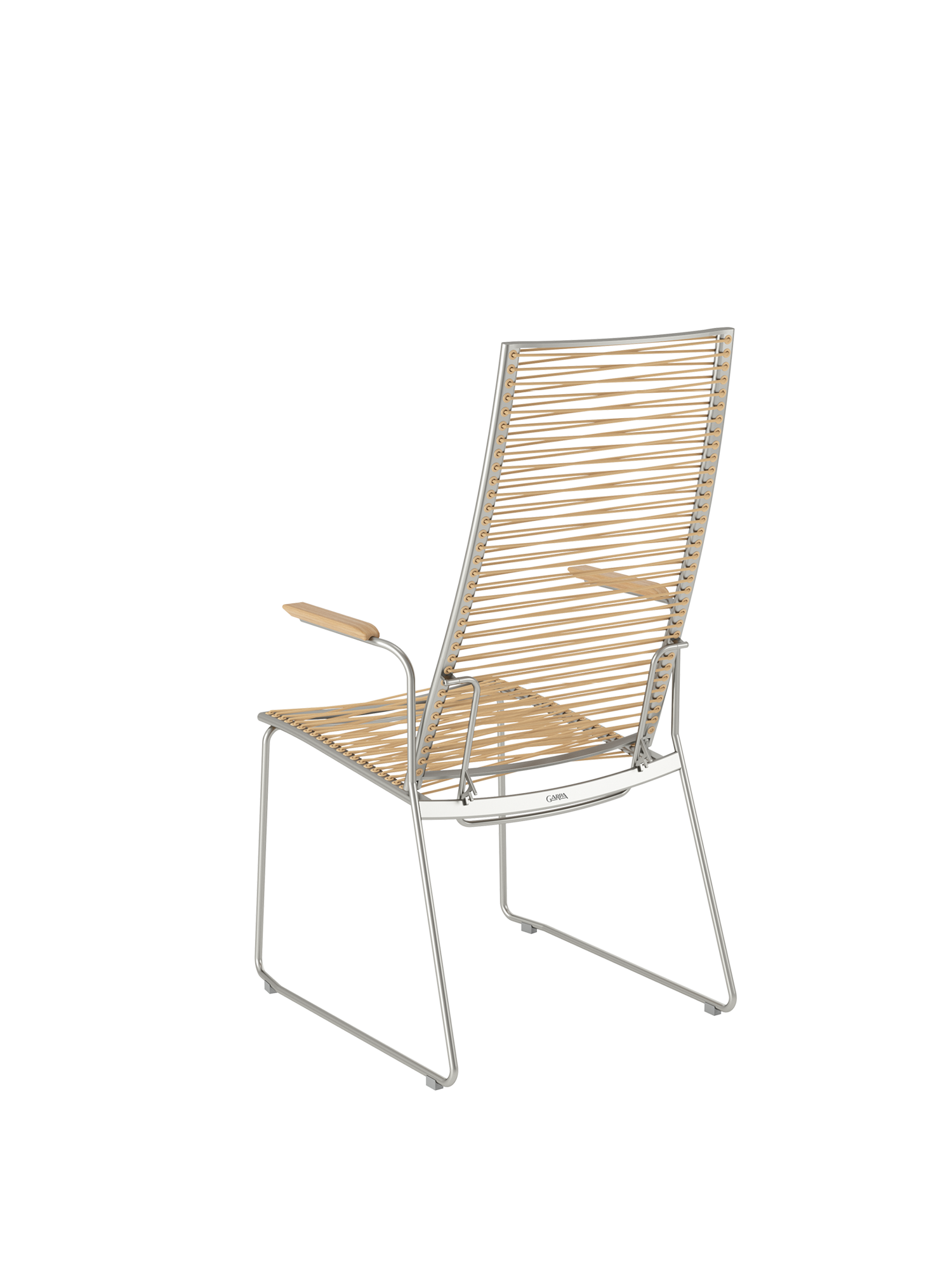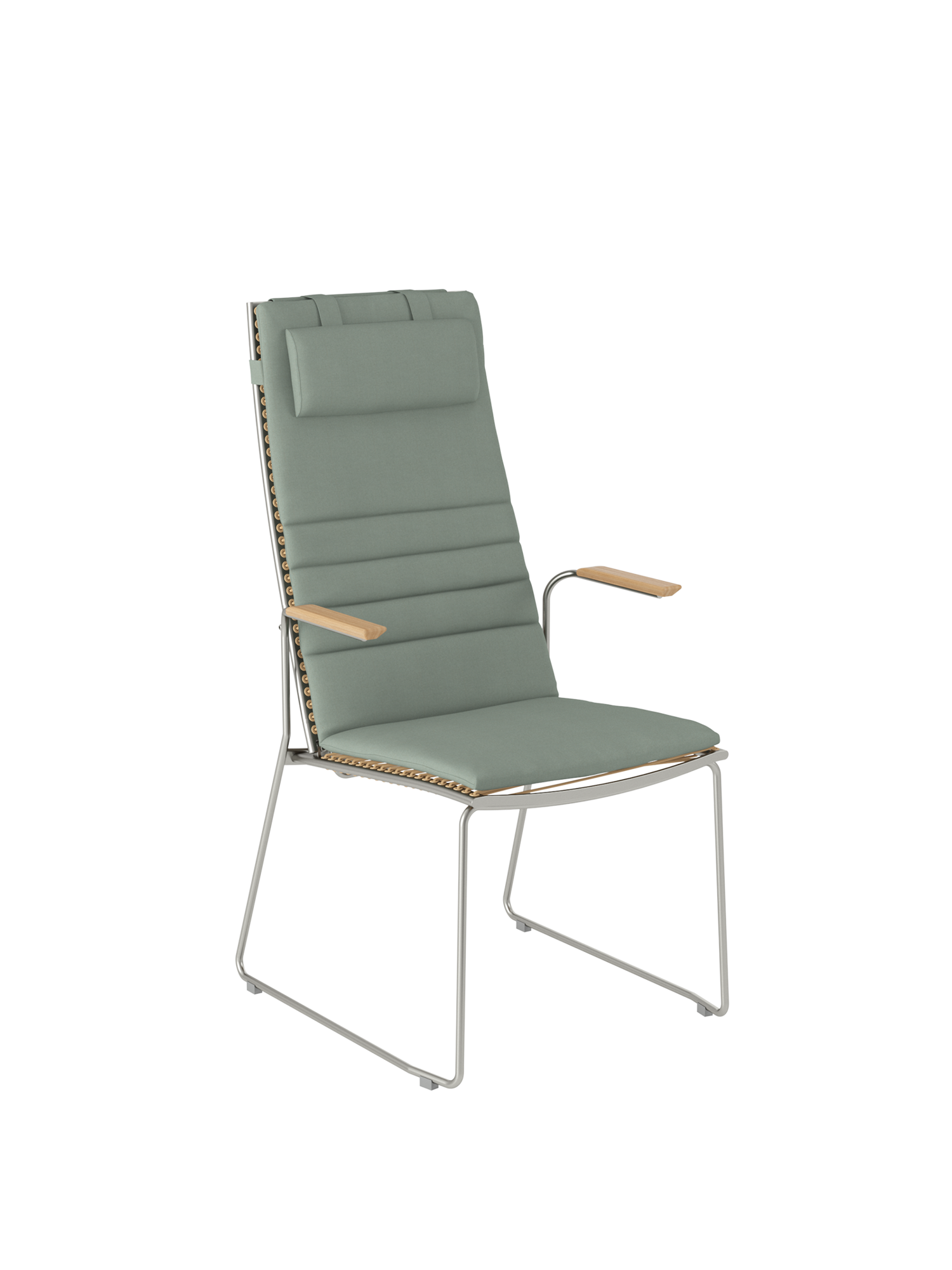 Pan wirkt luftig wie eine leichte Brise. Die eleganten Hochlehner mit einem Edelstahlgestell sind mit einer dauerelastischen Faser bespannt, die sich bequem der Körperkontur anpasst. Die Stühle mit der hohen Rückenlehne lassen sich ideal mit dem passenden Hocker kombinieren.