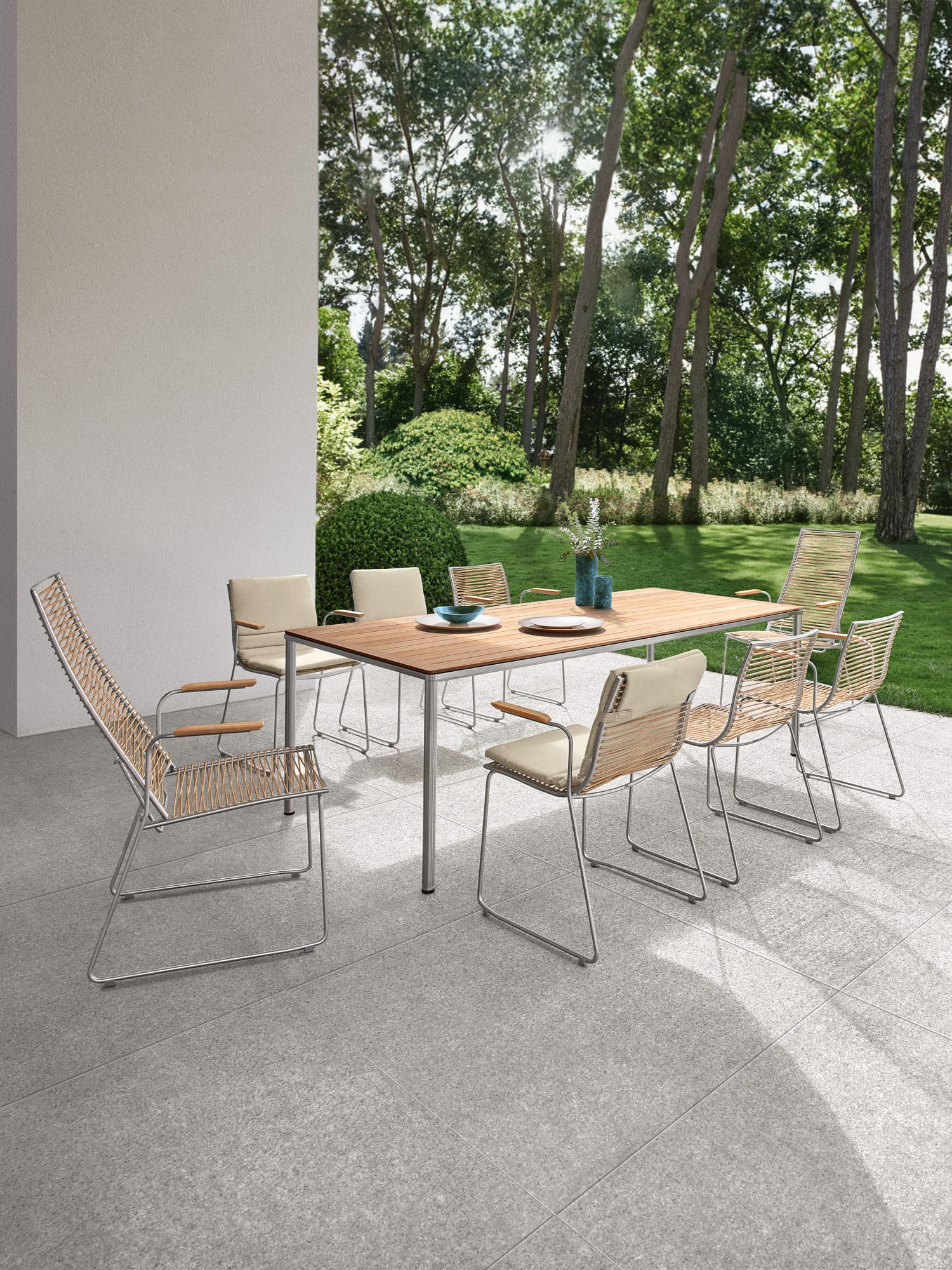 Zur Komplettierung der Sitzgruppe stehen passende Tische in verschiedenen Ausführungen zur Verfügung. Ihre Tischplatten bestehen aus Teakleisten oder Kunstharz. Mit ihrer reduzierten Eleganz passen die Pan Stühle auch gut zu den anderen modernen Tischen unseres Sortiments. Zur Auswahl klicken Sie bitte auf den Link "Passende Tische" weiter unten auf dieser Seite.