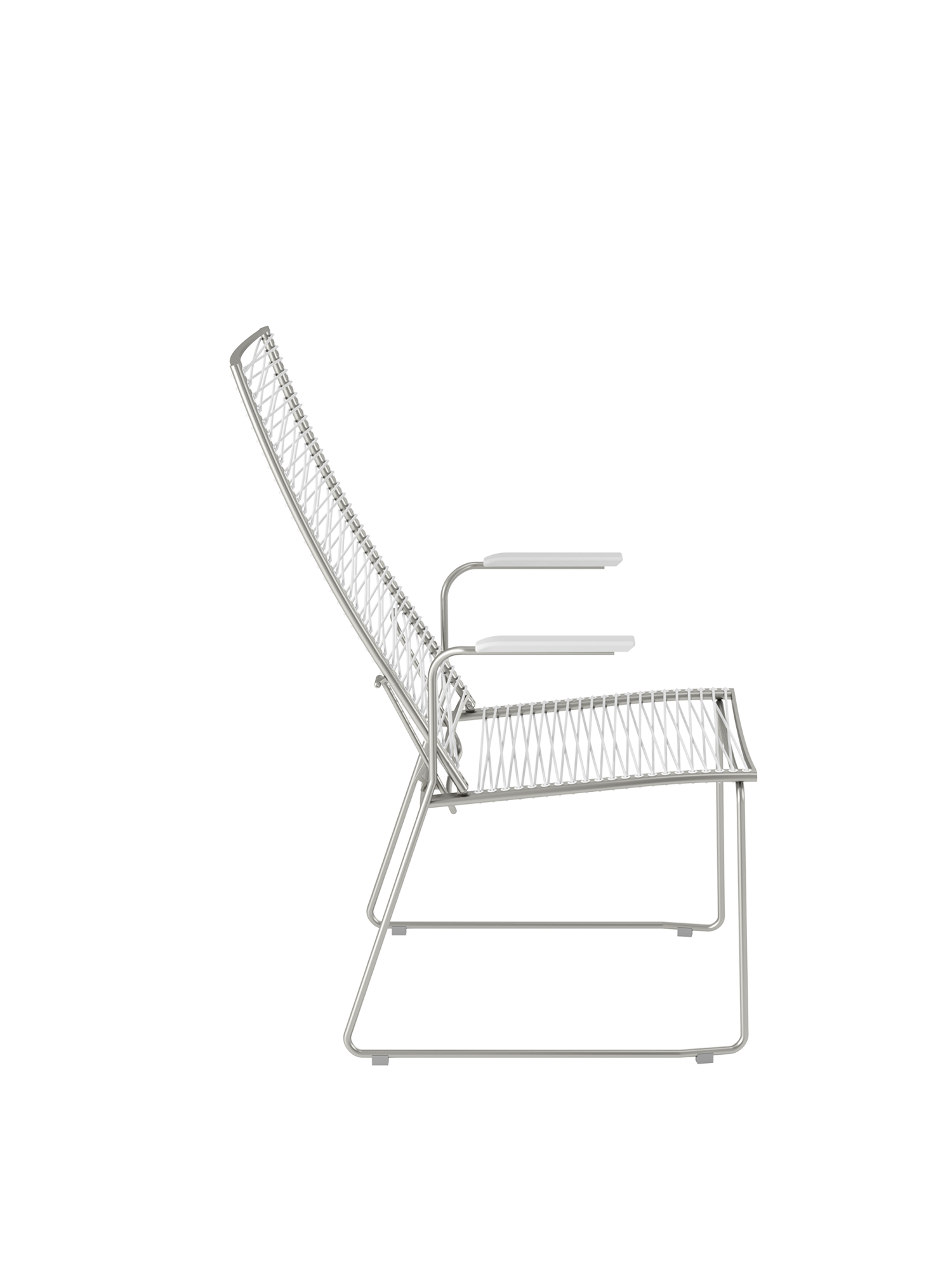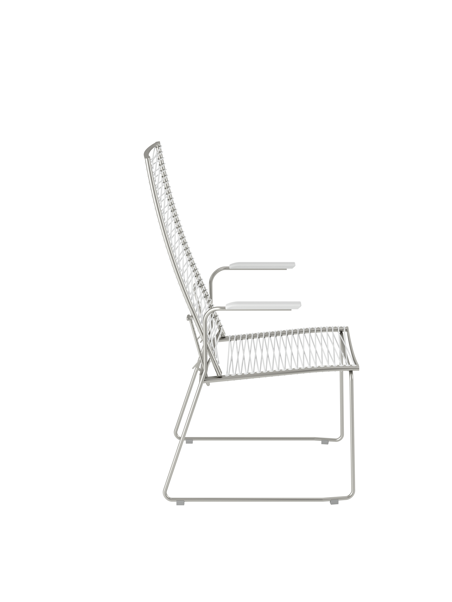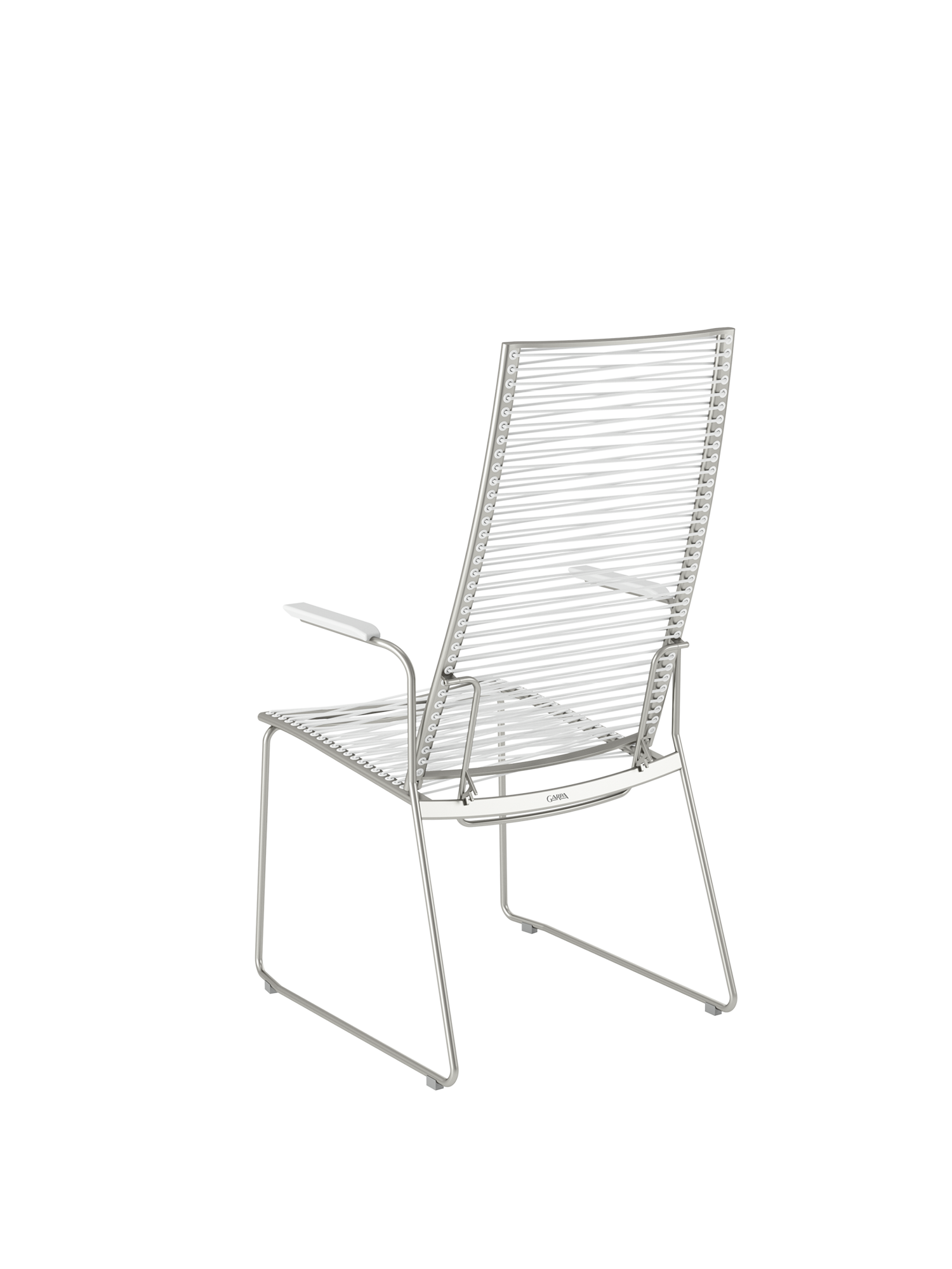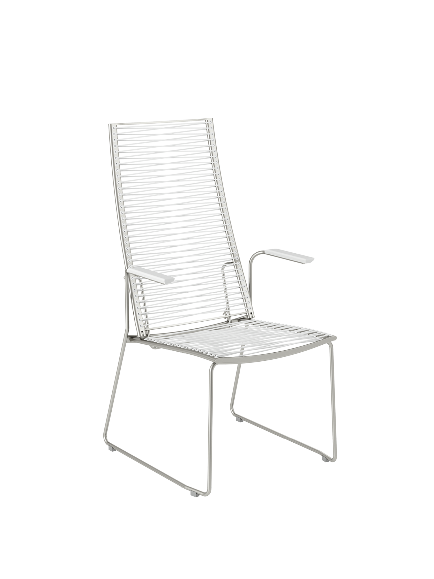 Pan wirkt luftig wie eine leichte Brise. Die eleganten Hochlehner mit einem Edelstahlgestell sind mit einer dauerelastischen Faser bespannt, die sich bequem der Körperkontur anpasst. Die Stühle mit der hohen Rückenlehne lassen sich ideal mit dem passenden Hocker kombinieren.
