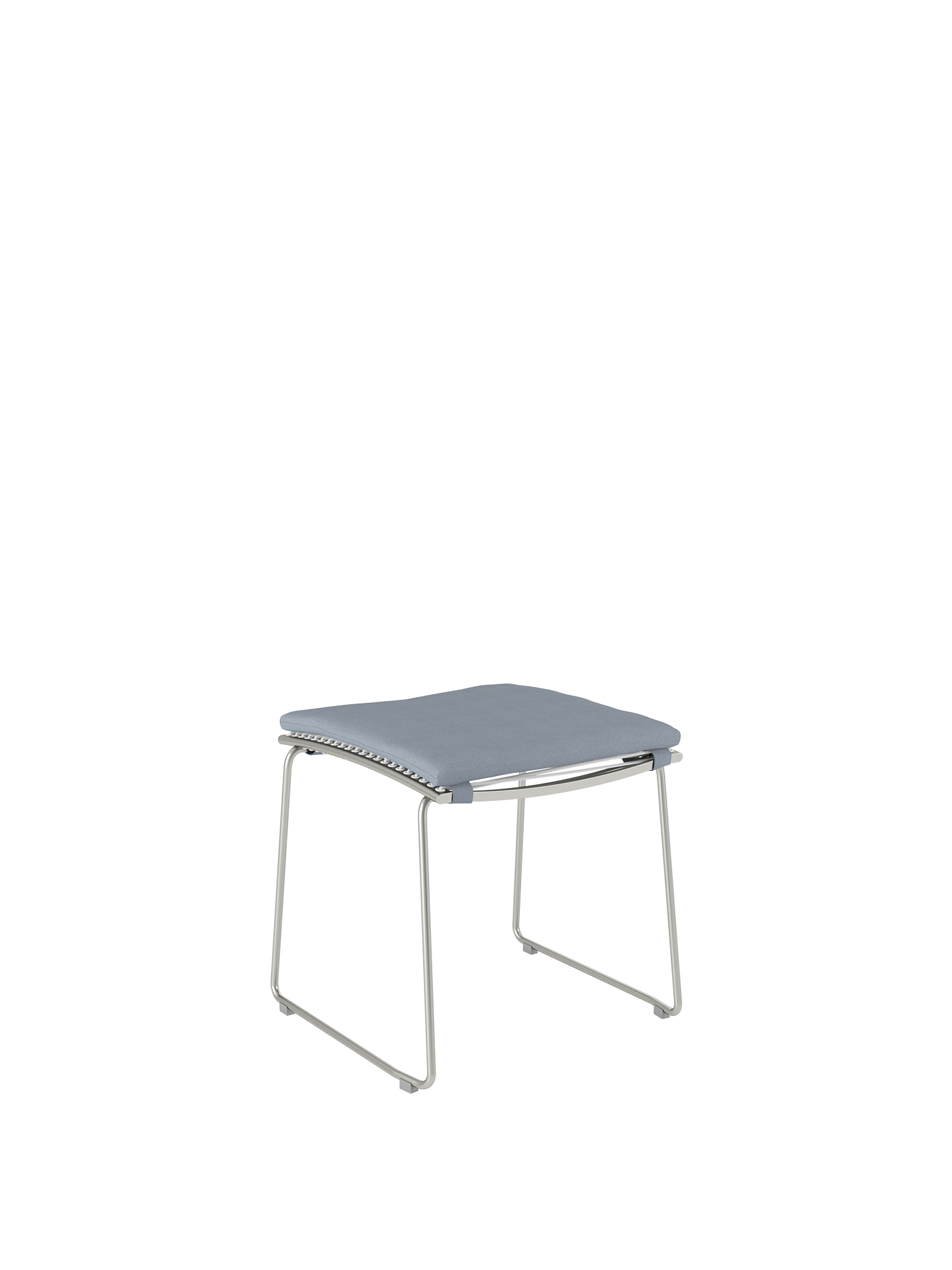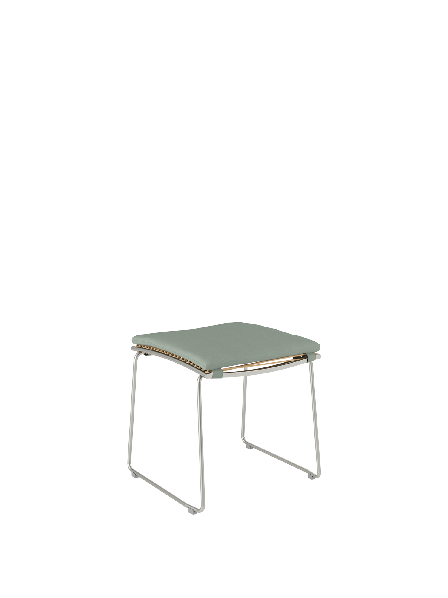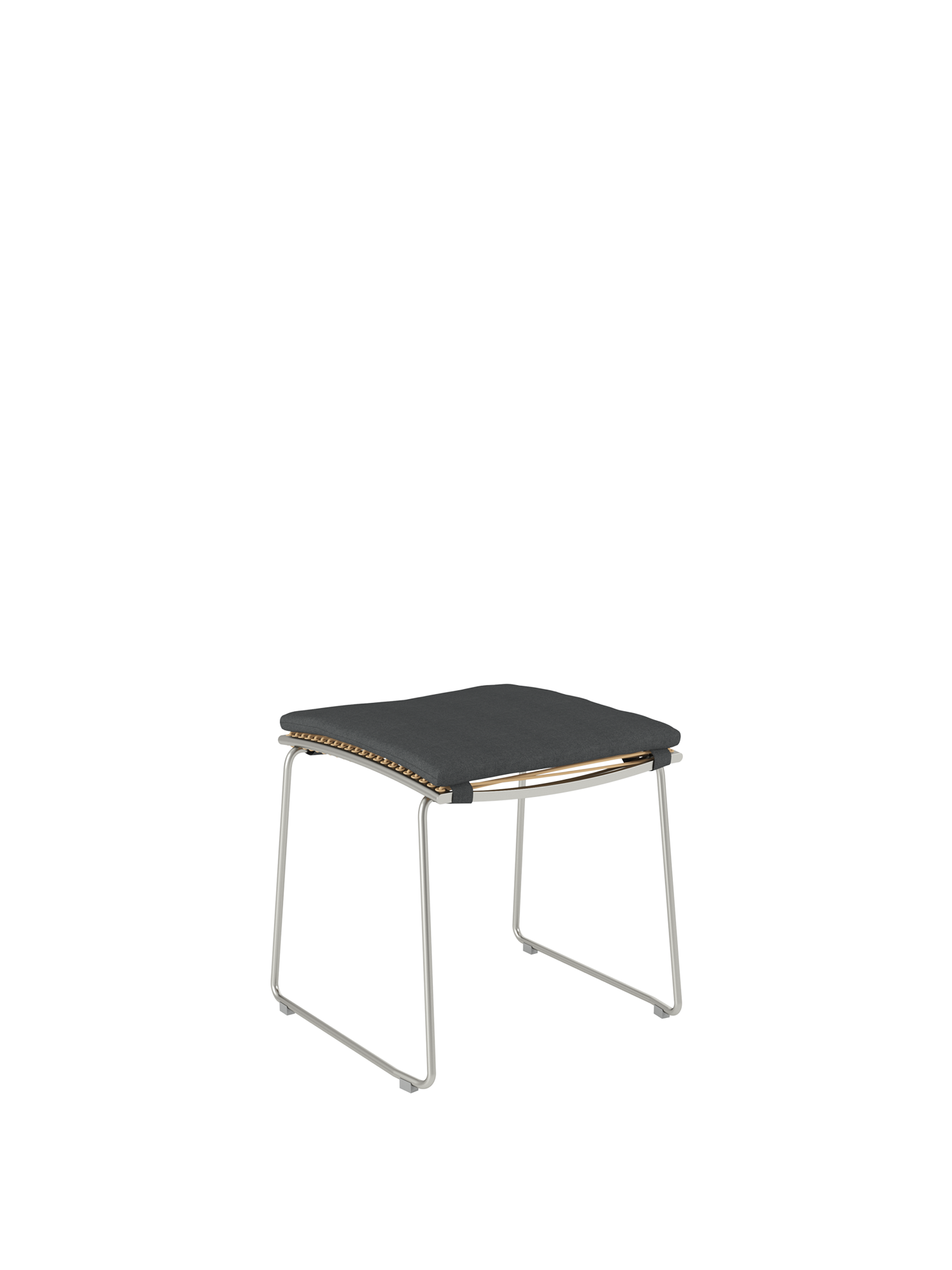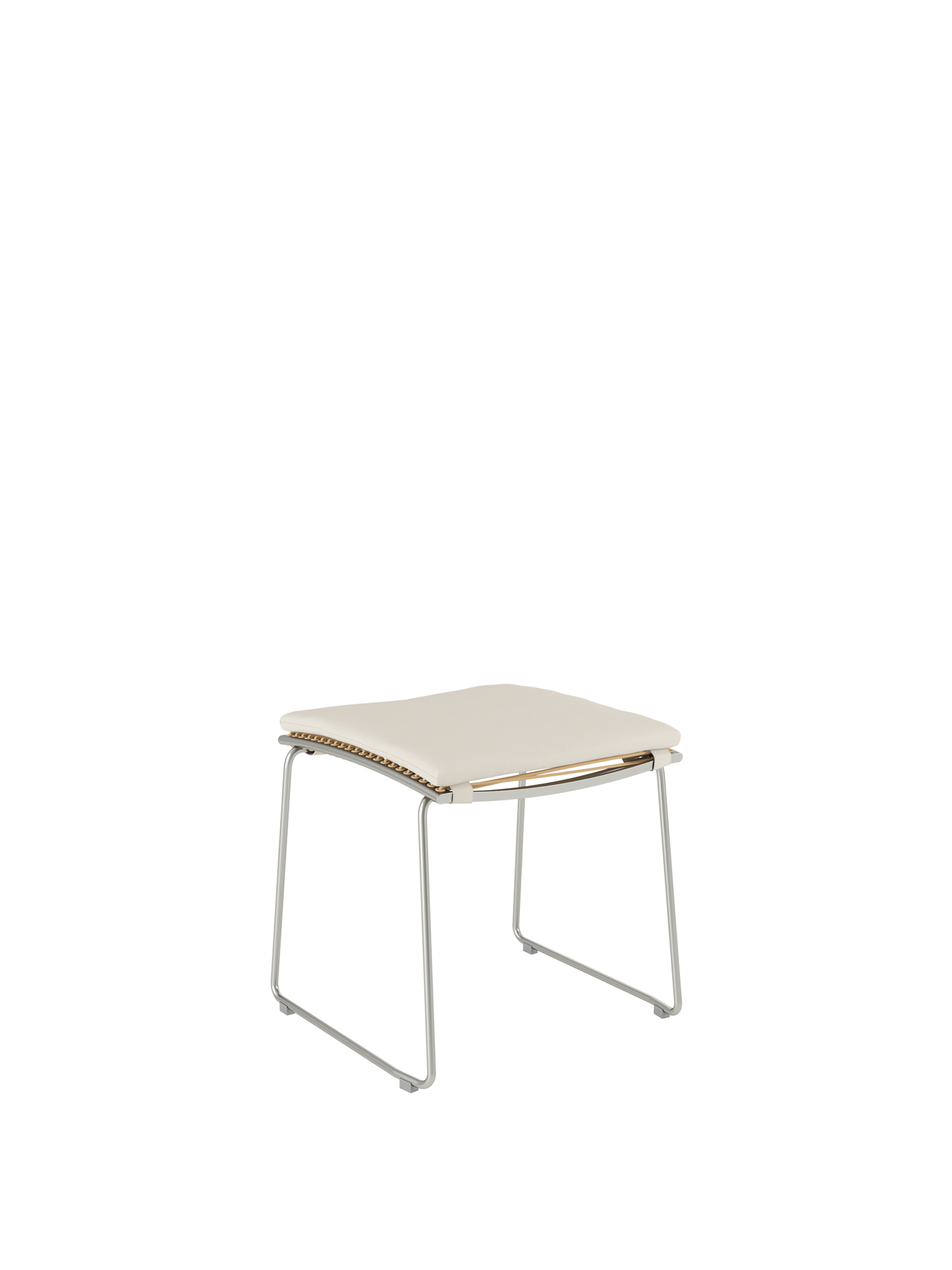 Der passende Hocker zu den Stühlen und Hochlehnern der Pan Serie hat ein Gestell aus Edelstahl und eine Bespannung aus hochwertiger, wetterfester Kunststofffaser. Er ist schnell dazugestellt und entlastet angenehm die Beine.