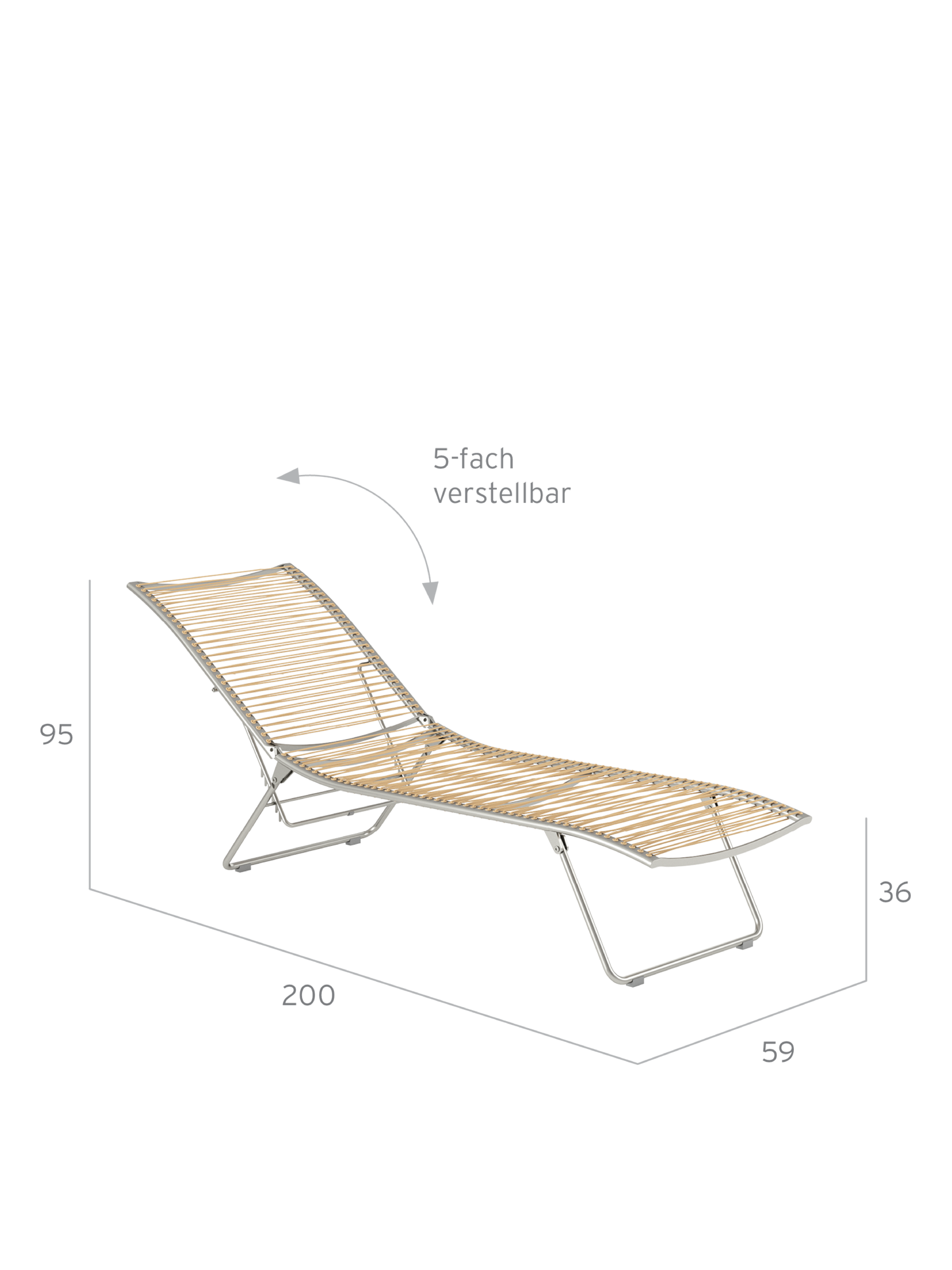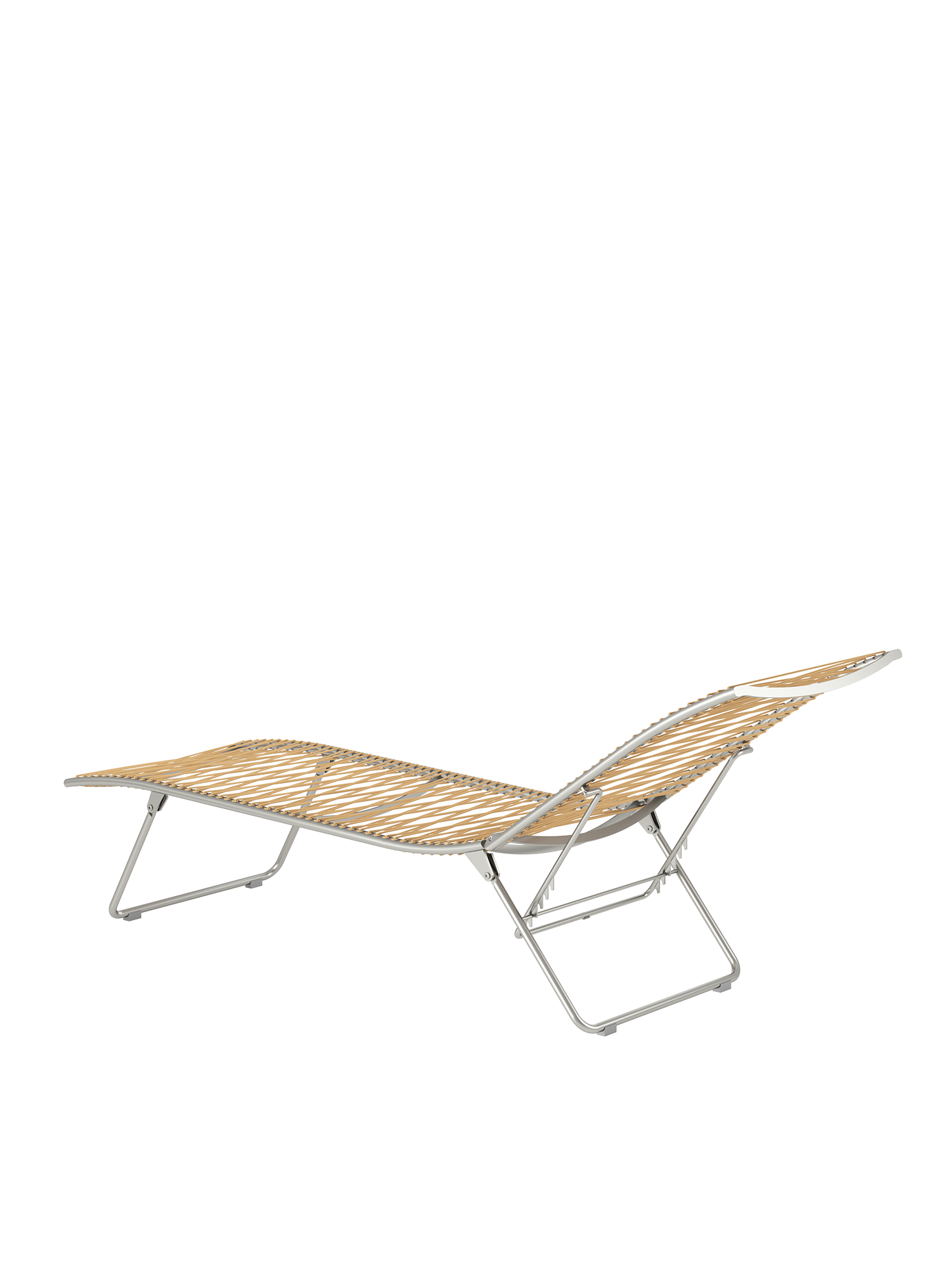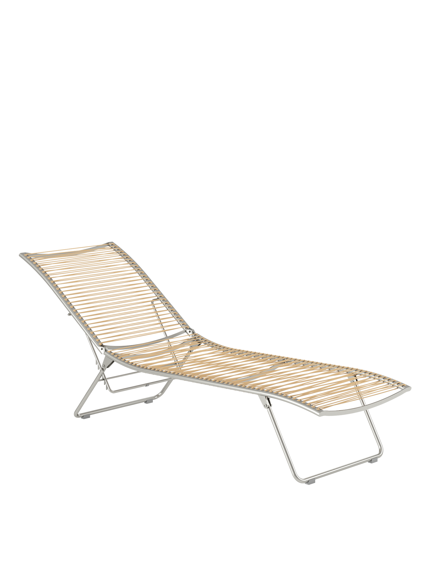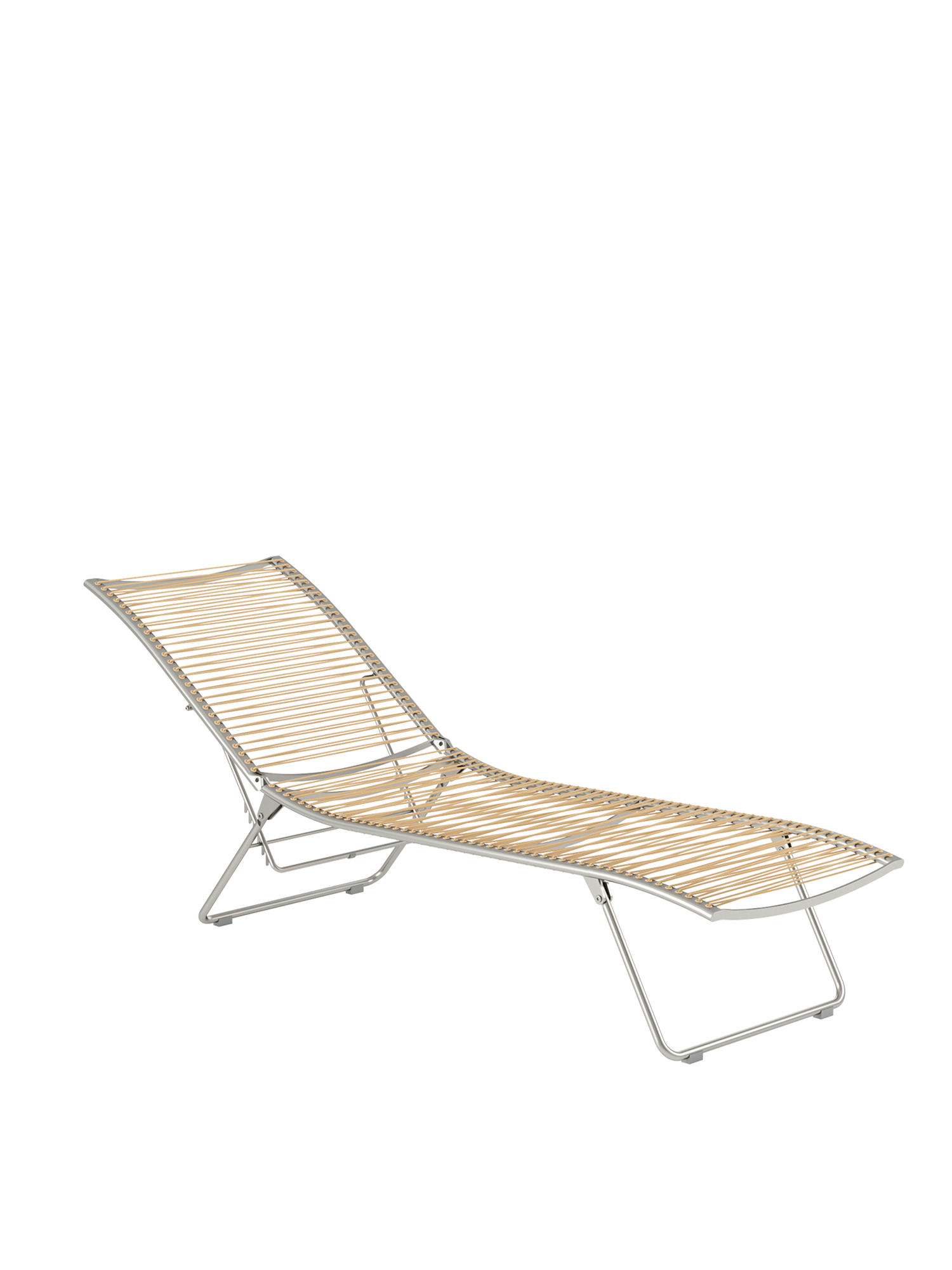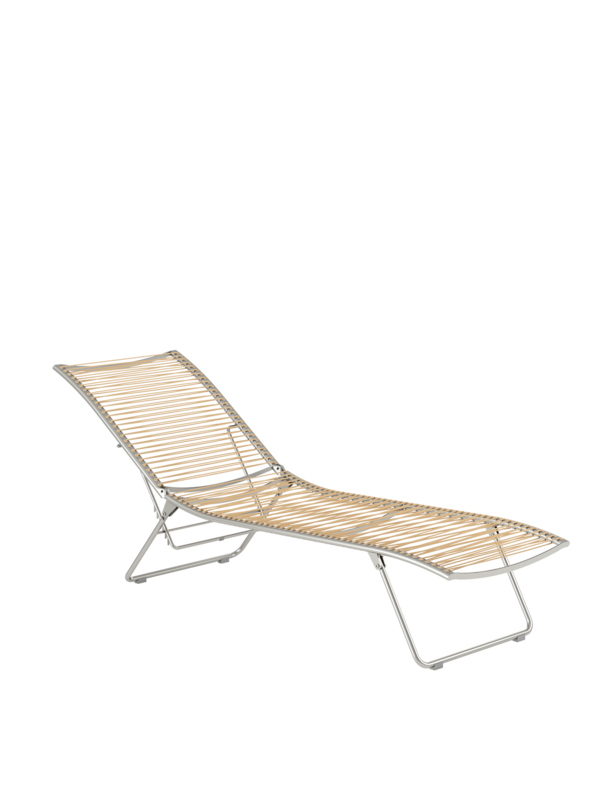 Aus einem einzigen geschwungenen Strich entstand diese Liege aus der Feder des Designers. Die Idee, sie flach zusammenfalten zu können, macht sie perfekt. Das elastische Kunststoffgeflecht auf einem eleganten Edelstahlgestell passt sich der Körperkontur an, die fünffach verstellbare Rückenlehne macht das Sonnen auch in der Bauchlage möglich.