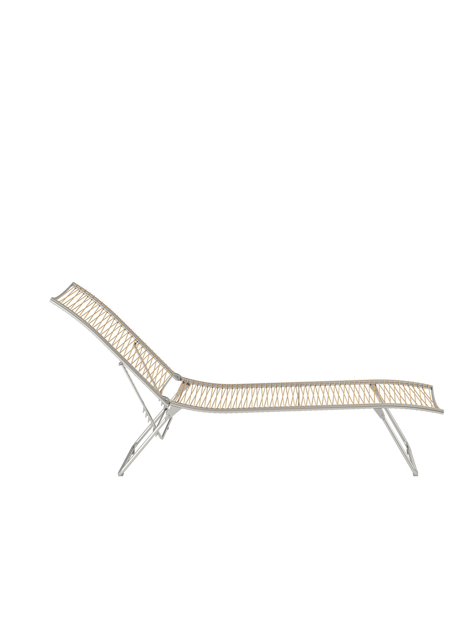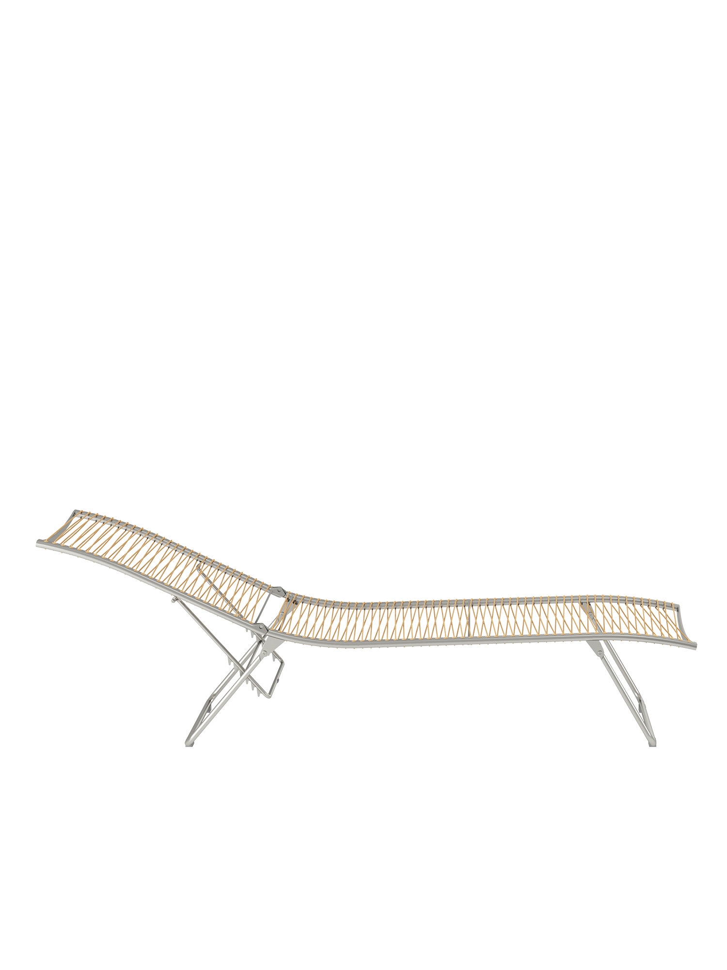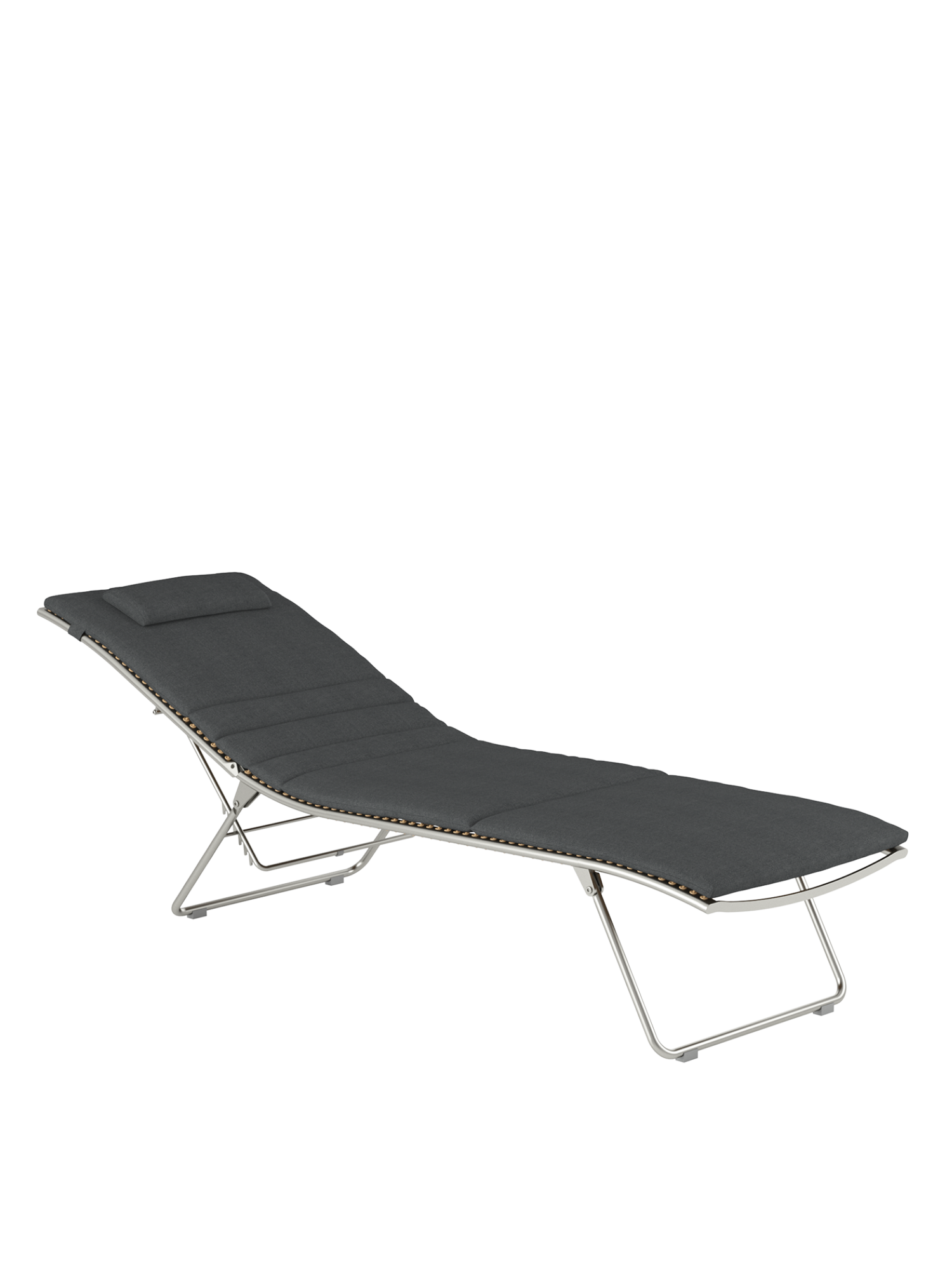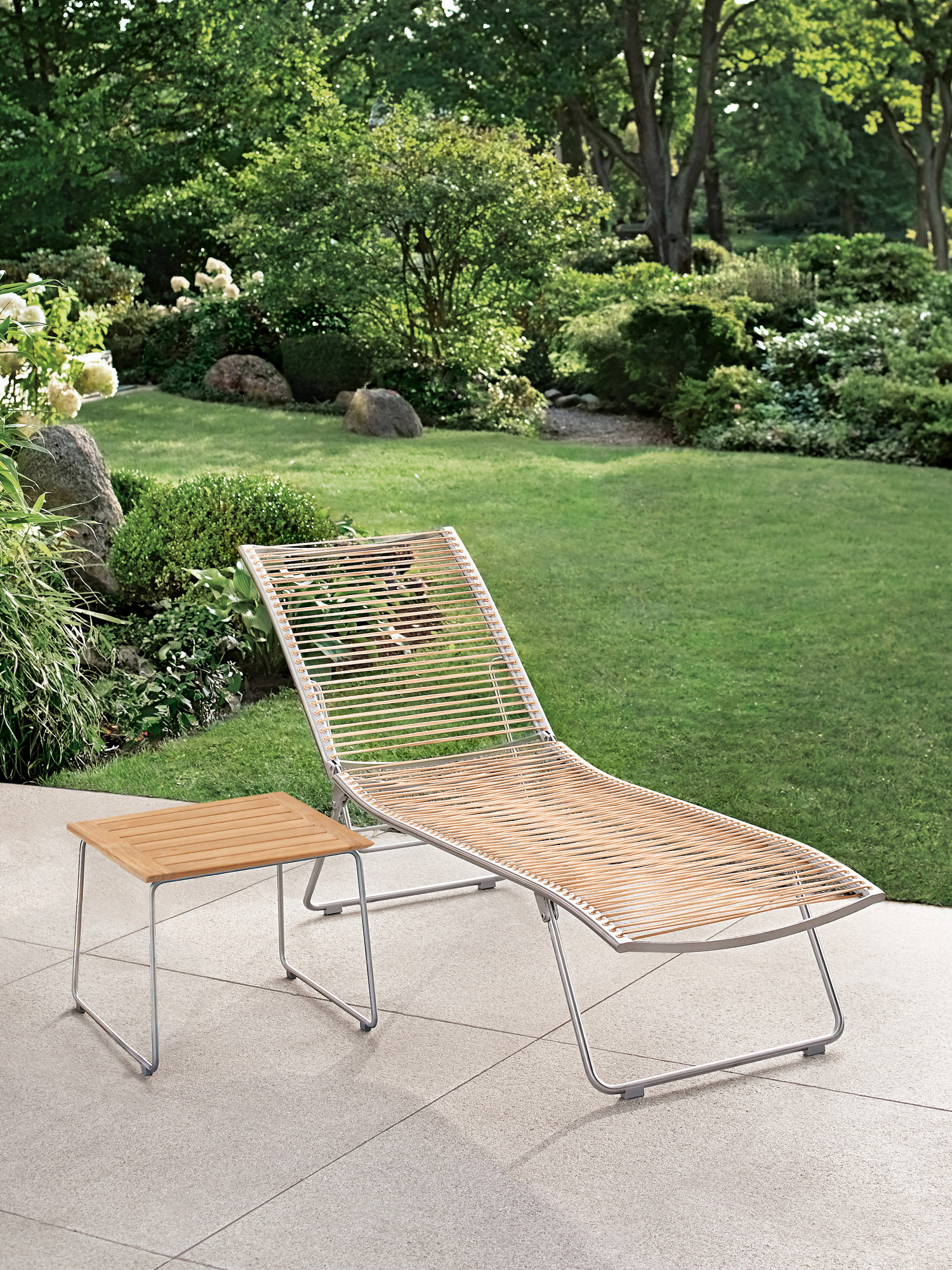 Aus einem einzigen geschwungenen Strich entstand diese Liege aus der Feder des Designers. Die Idee, sie flach zusammenfalten zu können, macht sie perfekt. Das elastische Kunststoffgeflecht auf einem eleganten Edelstahlgestell passt sich der Körperkontur an, die fünffach verstellbare Rückenlehne macht das Sonnen auch in der Bauchlage möglich.