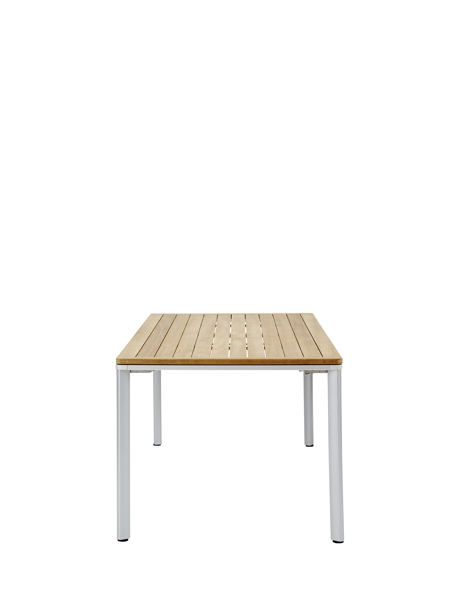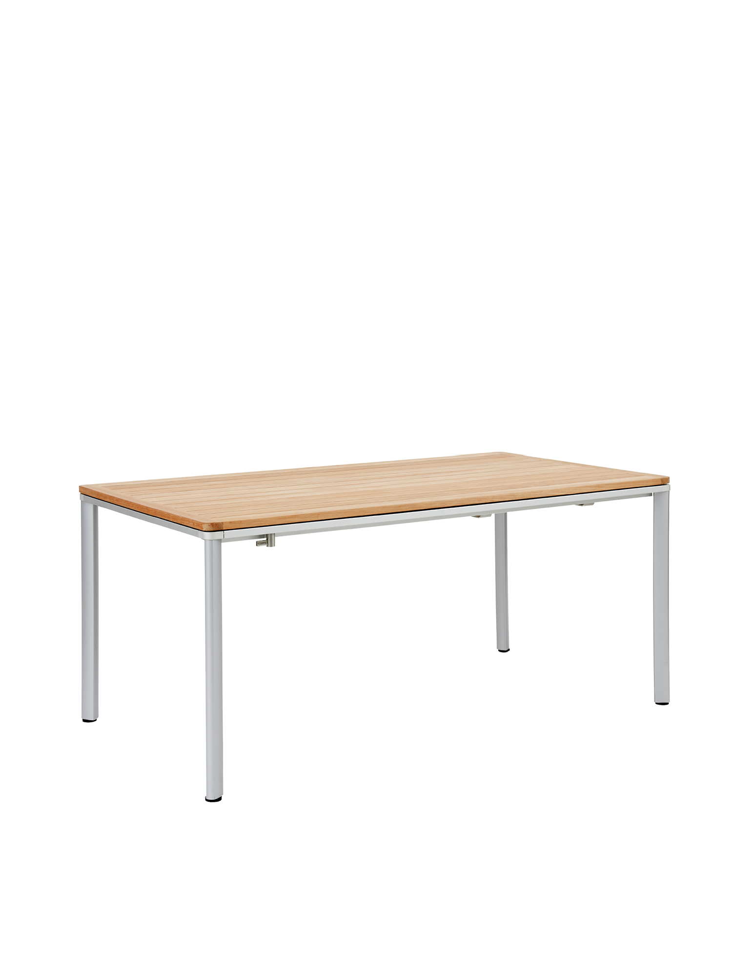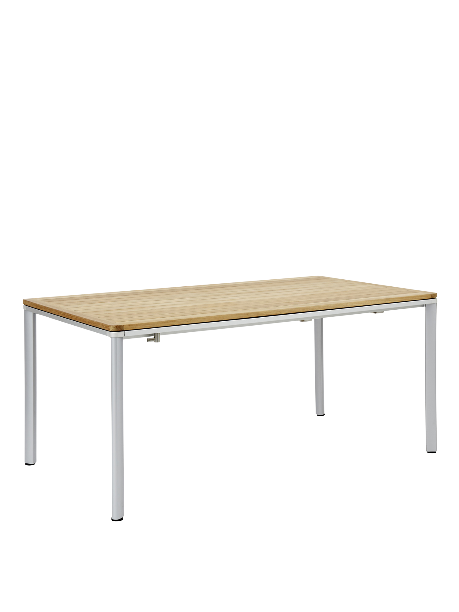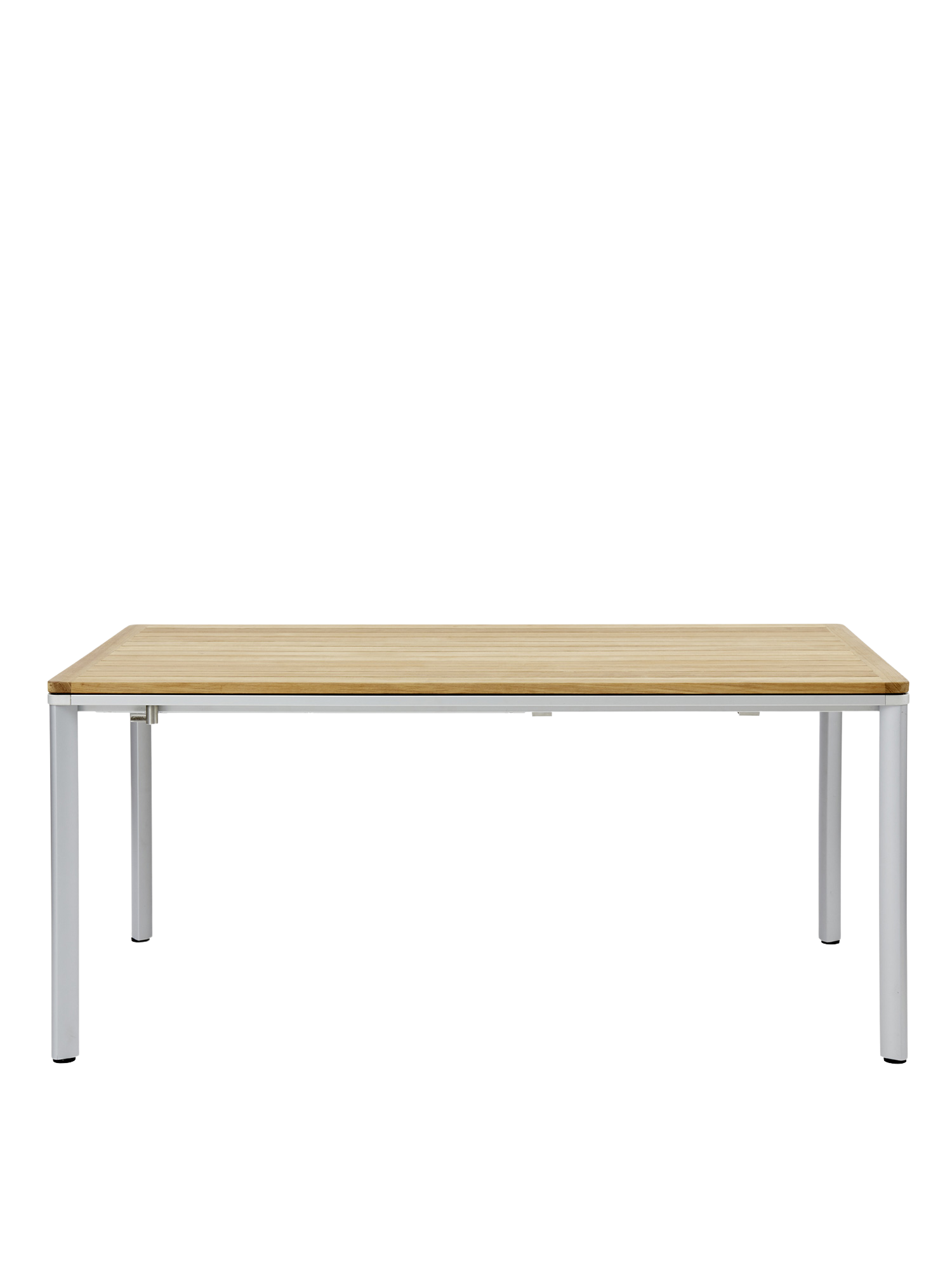 Eine umlaufende Zarge mit sanfter Rundung prägt das Design der vierbeinigen Portland Tische. Dabei lässt sie genügend Raum, um auch Stühle mit Armlehnen unter die Tischplatte zu schieben. Mit einer Tischoberfläche aus Teakleisten und einem Aluminiumgestell sind sie stilsichere Begleiter zu Stühlen der Serie Monterey.