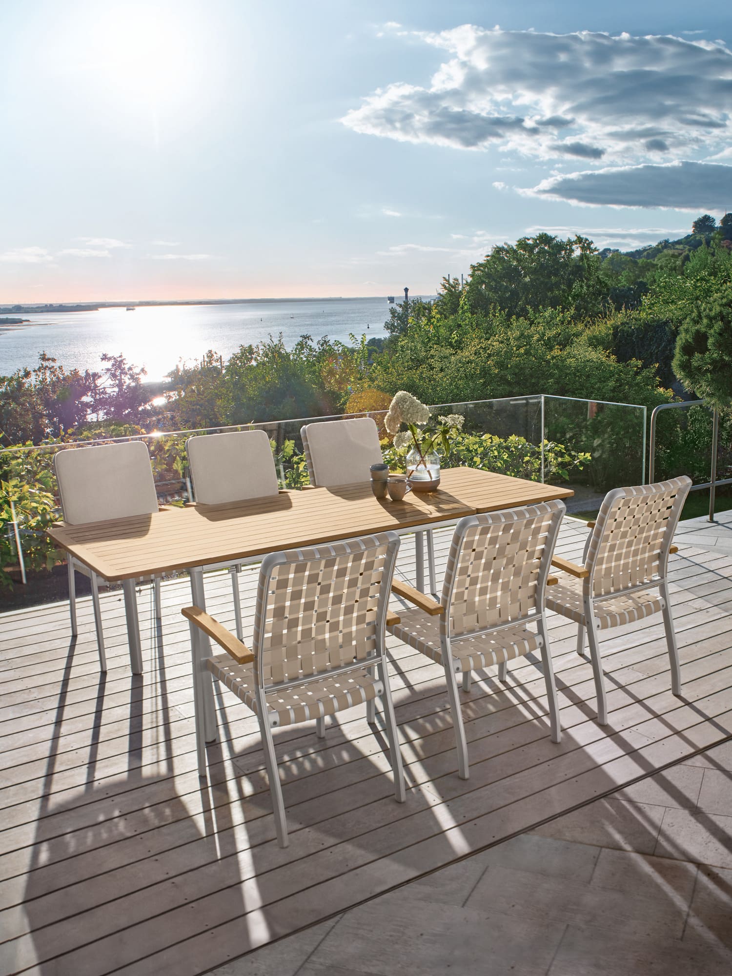 Die hochwertige Kombination aus massiven Teakleisten und eloxierten Aluminiumprofilen ermöglicht einen ganzjährigen Einsatz im Freien.