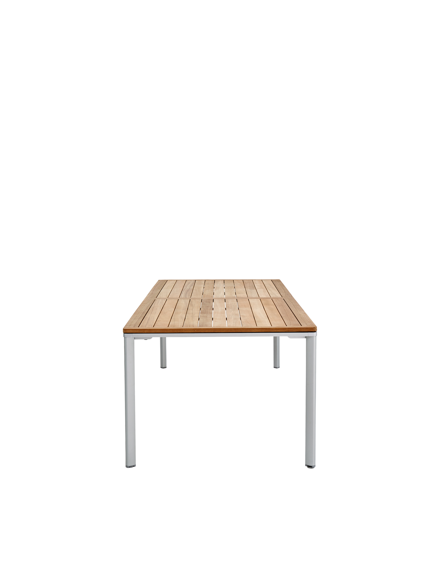 Eine umlaufende Zarge mit sanfter Rundung prägt das Design der vierbeinigen Portland Tische. Dabei lässt sie genügend Raum, um auch Stühle mit Armlehnen unter die Tischplatte zu schieben. Mit einer Tischoberfläche aus Teakleisten und einem Aluminiumgestell sind sie stilsichere Begleiter zu Stühlen der Serie Monterey.