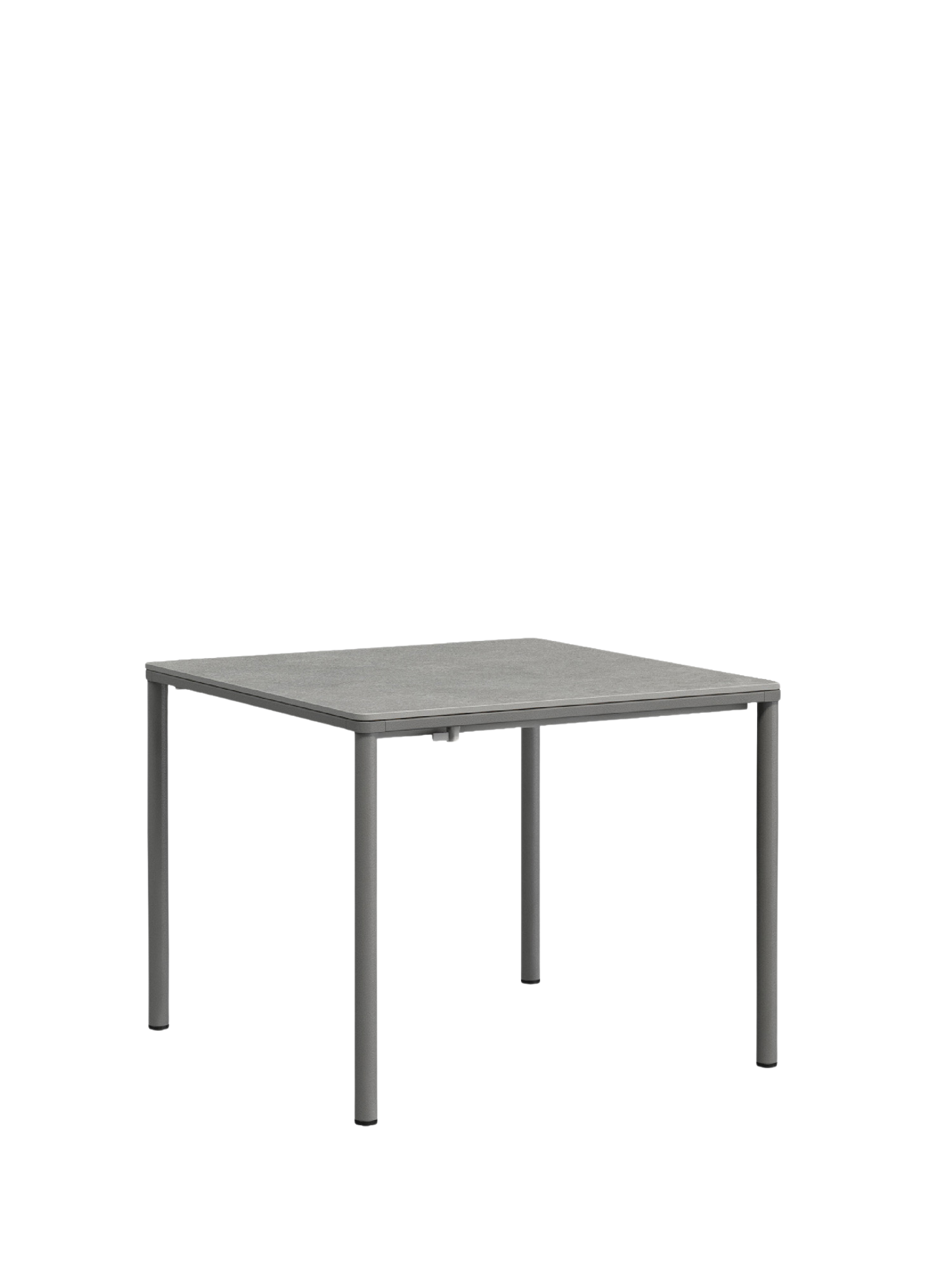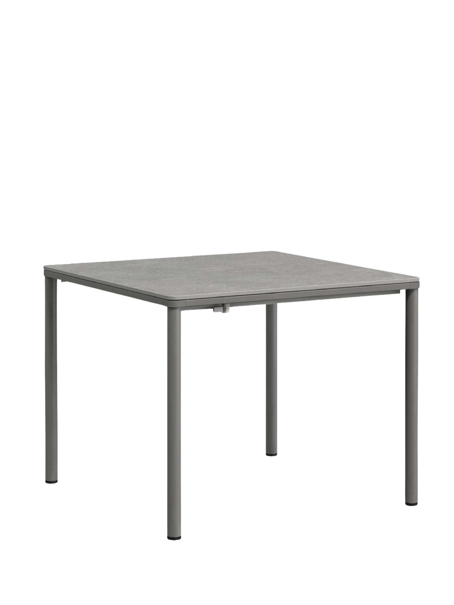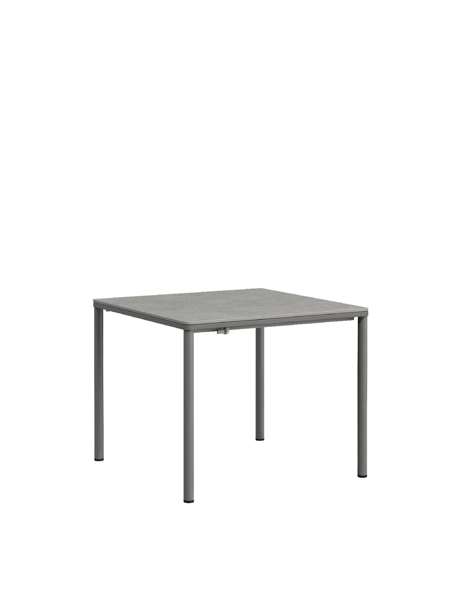 Das graphitgrau pulverbeschichtete Edelstahlgestell der Portland Tische verbindet diese mit allen Stühlen aus gleichem Material. Vier schlanke Beine tragen eine Platte, die mit der Zarge darunter wie aus einem Guss wirkt und in den Ecken der Rundung der Beine folgt. Die Oberfläche besteht aus wetterfestem Kunstharz im Farbton Shade.