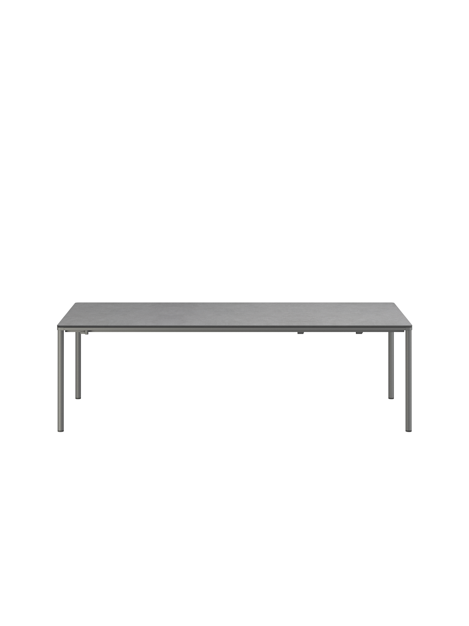 Das graphitgrau pulverbeschichtete Edelstahlgestell der Portland Tische verbindet diese mit allen Stühlen aus gleichem Material. Vier schlanke Beine tragen eine Platte, die mit der Zarge darunter wie aus einem Guss wirkt und in den Ecken der Rundung der Beine folgt. Die Oberfläche besteht aus wetterfestem Kunstharz im Farbton Shade.