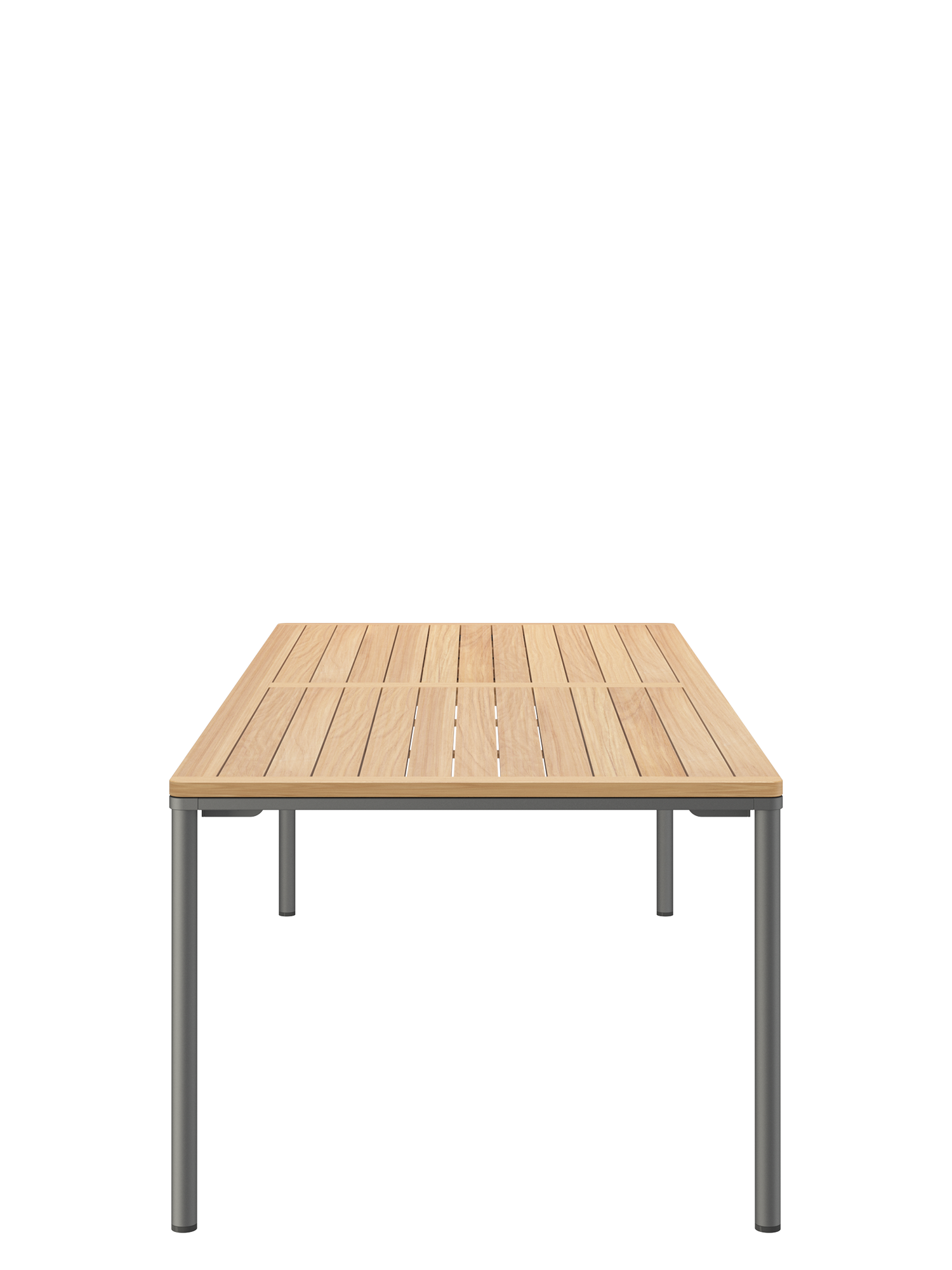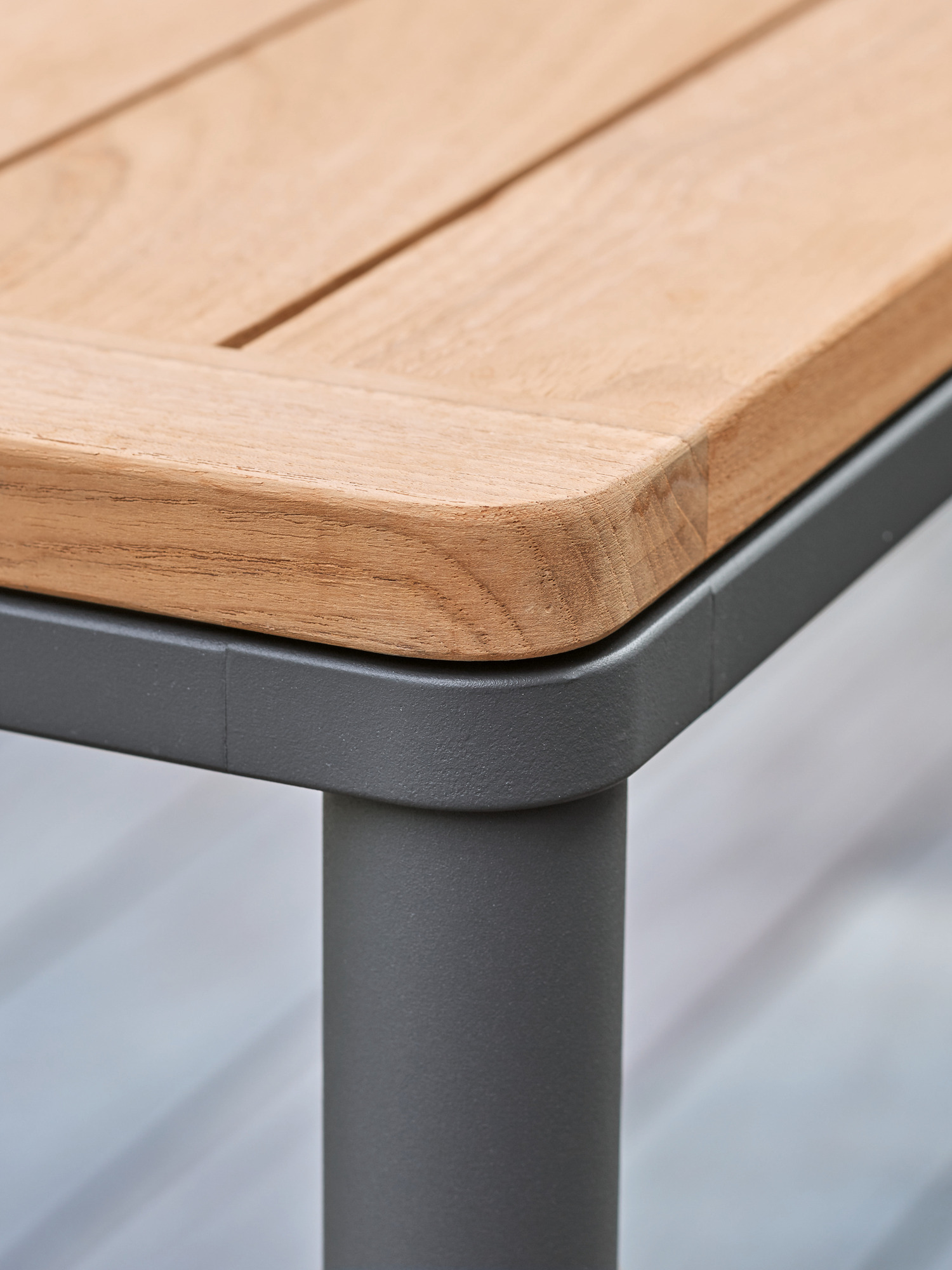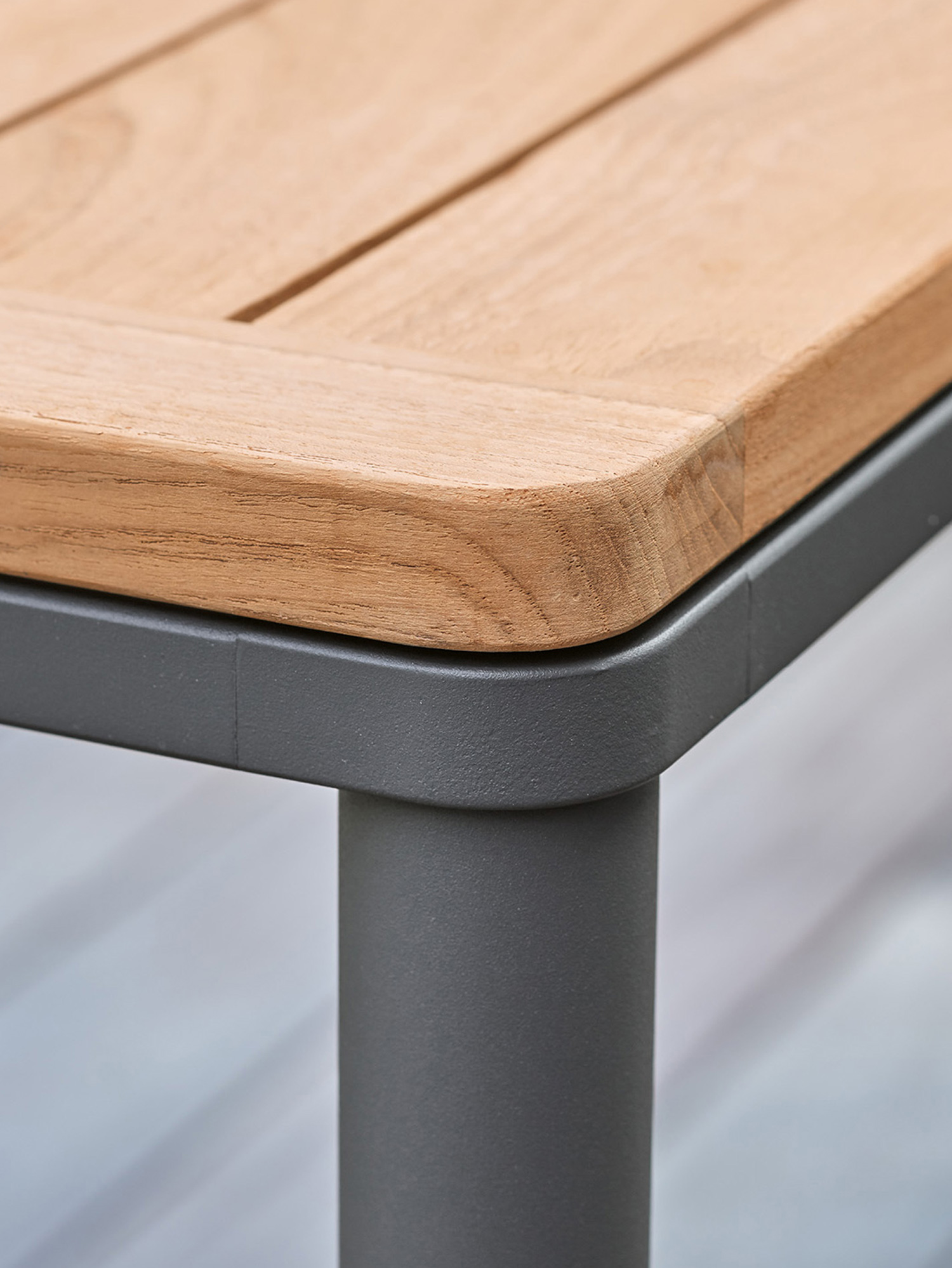 Das graphitgrau pulverbeschichtete Edelstahlgestell der Portland Tische verbindet diese mit allen Stühlen aus gleichem Material. Vier schlanke Beine tragen eine Platte, die mit der Zarge darunter wie aus einem Guss wirkt und in den Ecken der Rundung der Beine folgt. Die Oberfläche besteht aus hochwertigem Plantagenteak.
