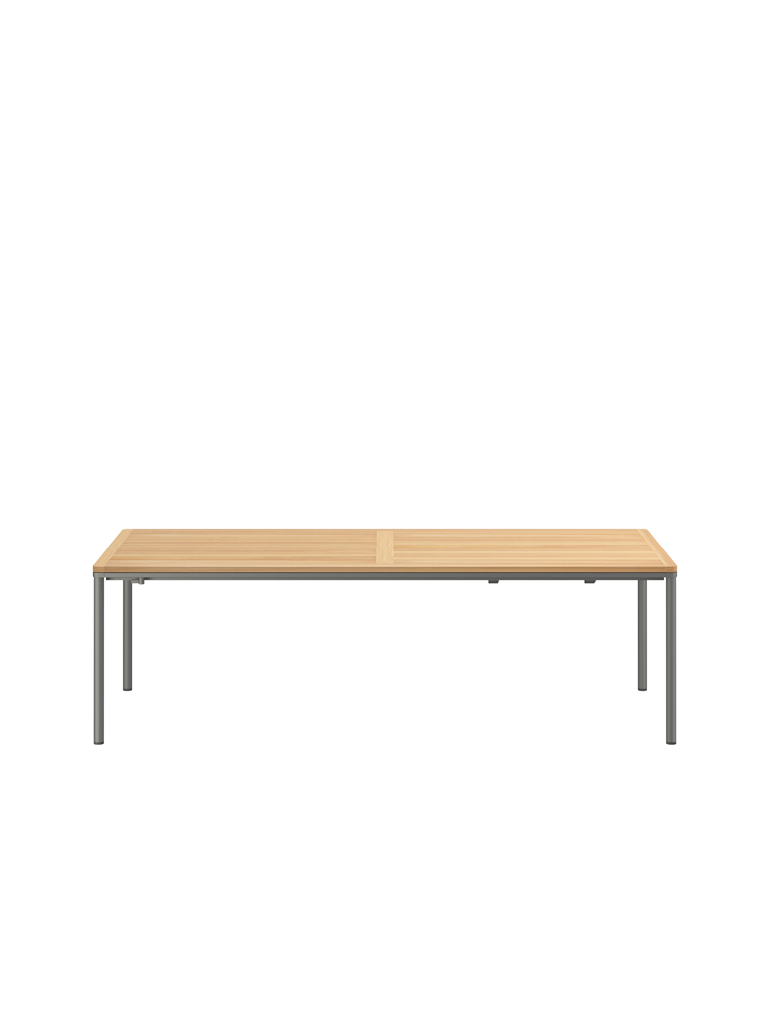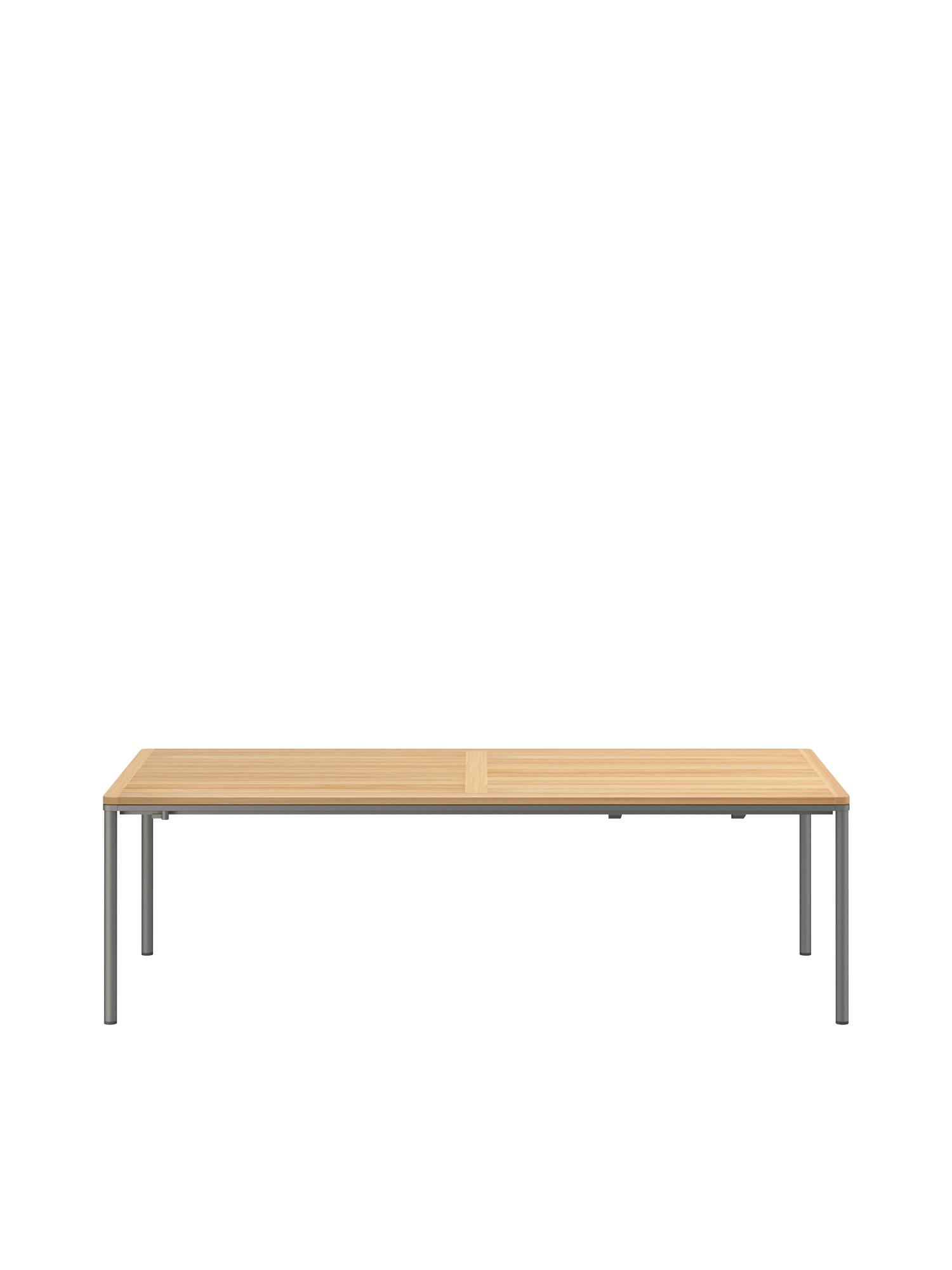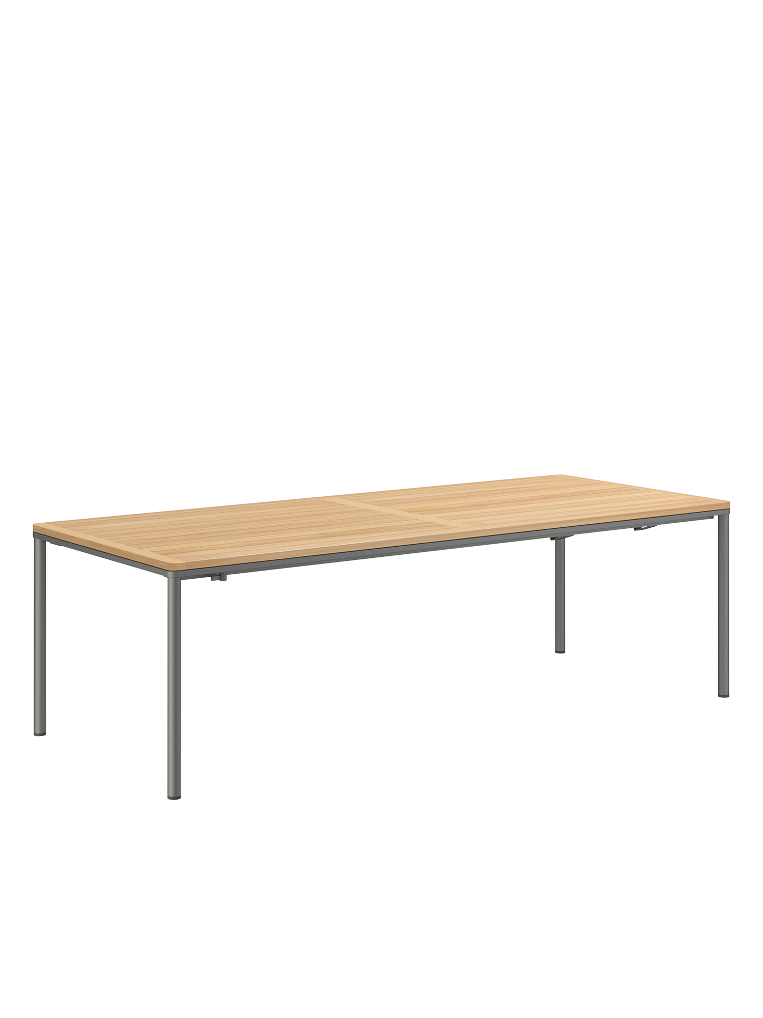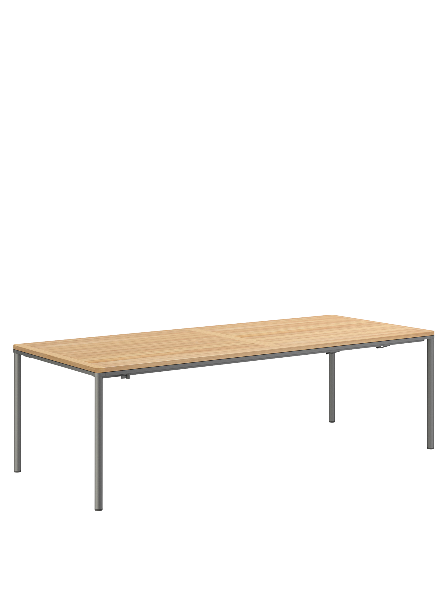 Das graphitgrau pulverbeschichtete Edelstahlgestell der Portland Tische verbindet diese mit allen Stühlen aus gleichem Material. Vier schlanke Beine tragen eine Platte, die mit der Zarge darunter wie aus einem Guss wirkt und in den Ecken der Rundung der Beine folgt. Die Oberfläche besteht aus hochwertigem Plantagenteak.