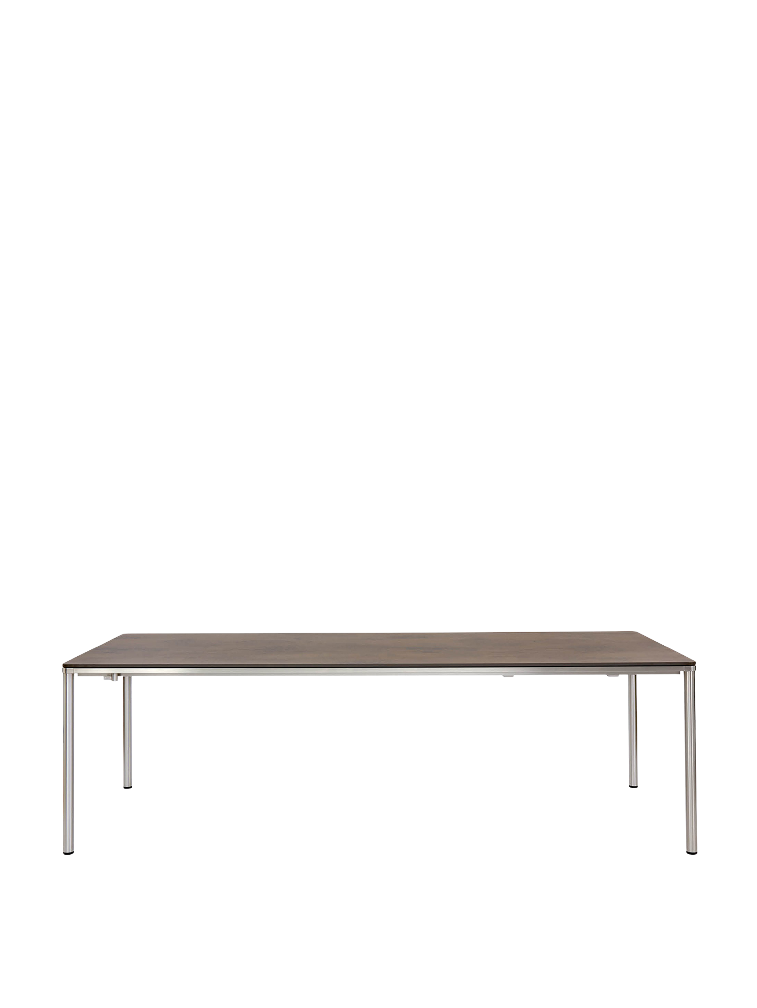 Das Edelstahlgestell der Portland Tische verbindet diese mit allen Stühlen aus gleichem Material. Vier schlanke Beine tragen eine Platte, die mit der Zarge darunter wie aus einem Guss wirkt und in den Ecken der Rundung der Beine folgt. Die Oberfläche besteht aus wetterfestem Kunstharz in einer patinierten Optik, die an verwittertes Eisen erinnert.