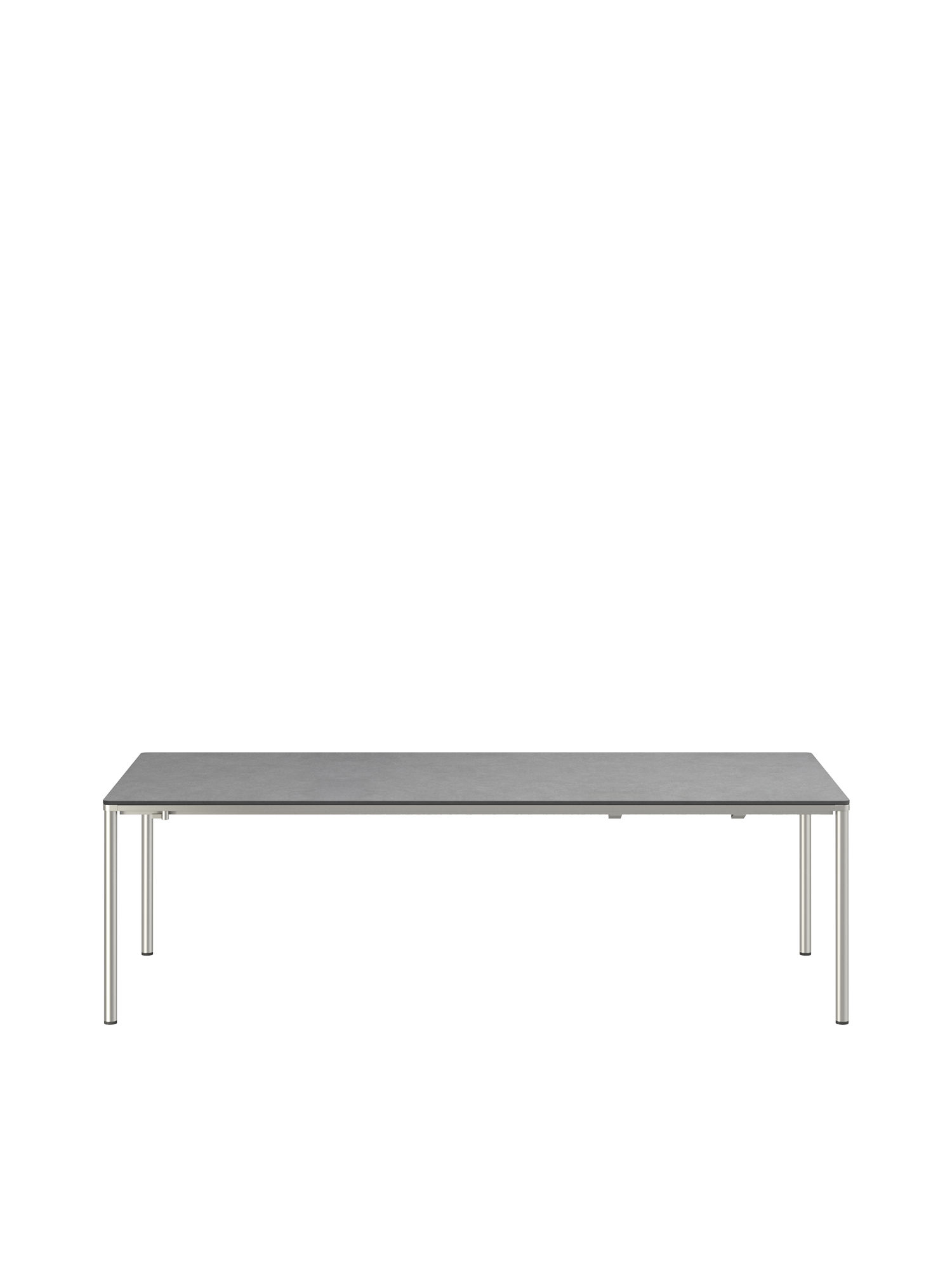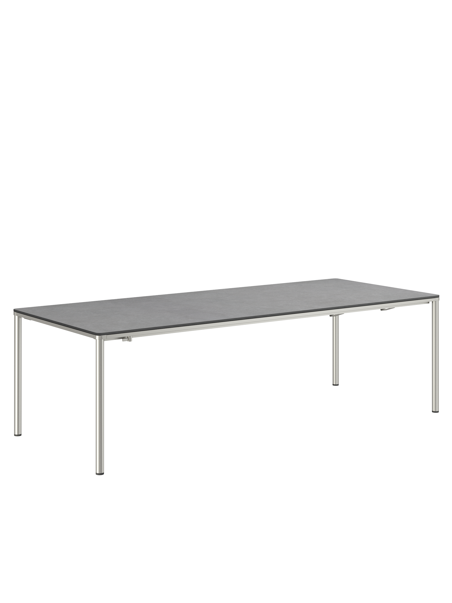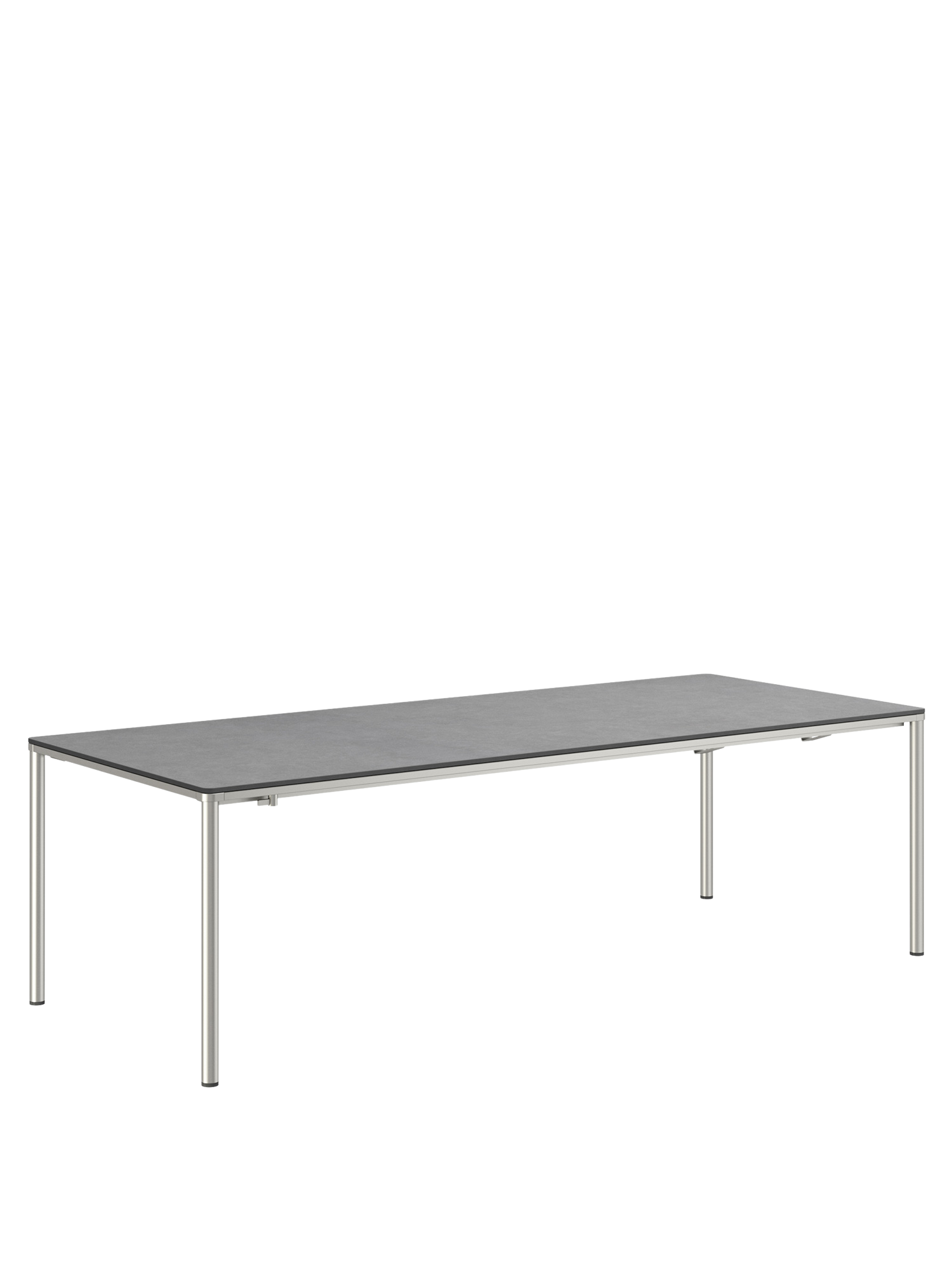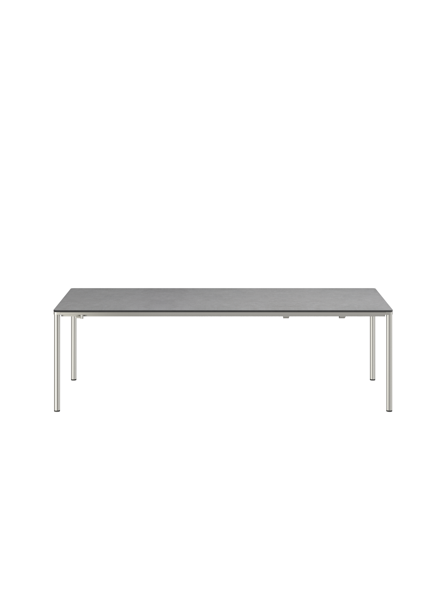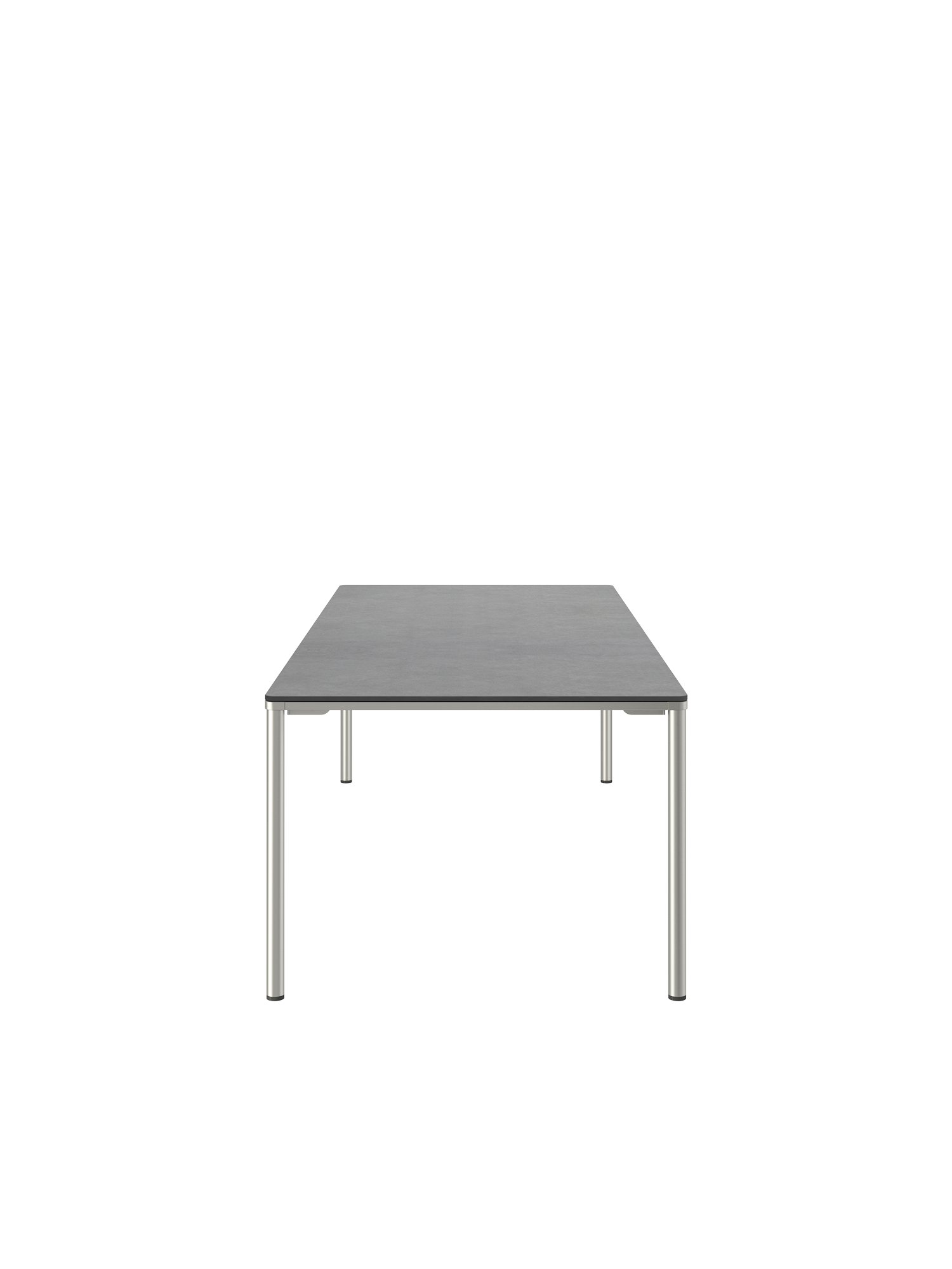 Das Edelstahlgestell der Portland Tische verbindet diese mit allen Stühlen aus gleichem Material. Vier schlanke Beine tragen eine Platte, die mit der Zarge darunter wie aus einem Guss wirkt und in den Ecken der Rundung der Beine folgt. Die Oberfläche besteht aus wetterfestem Kunstharz im Farbton Shade.