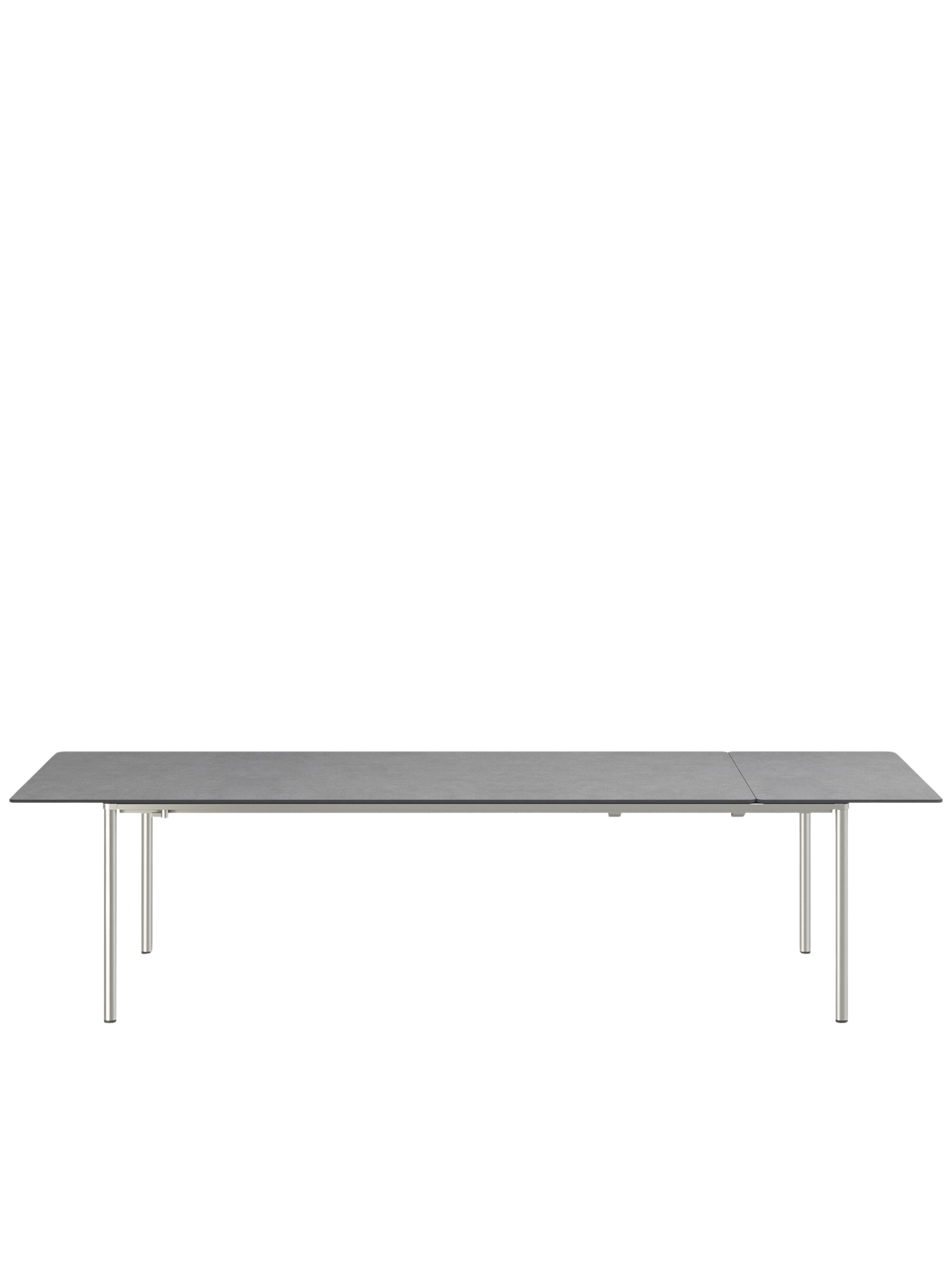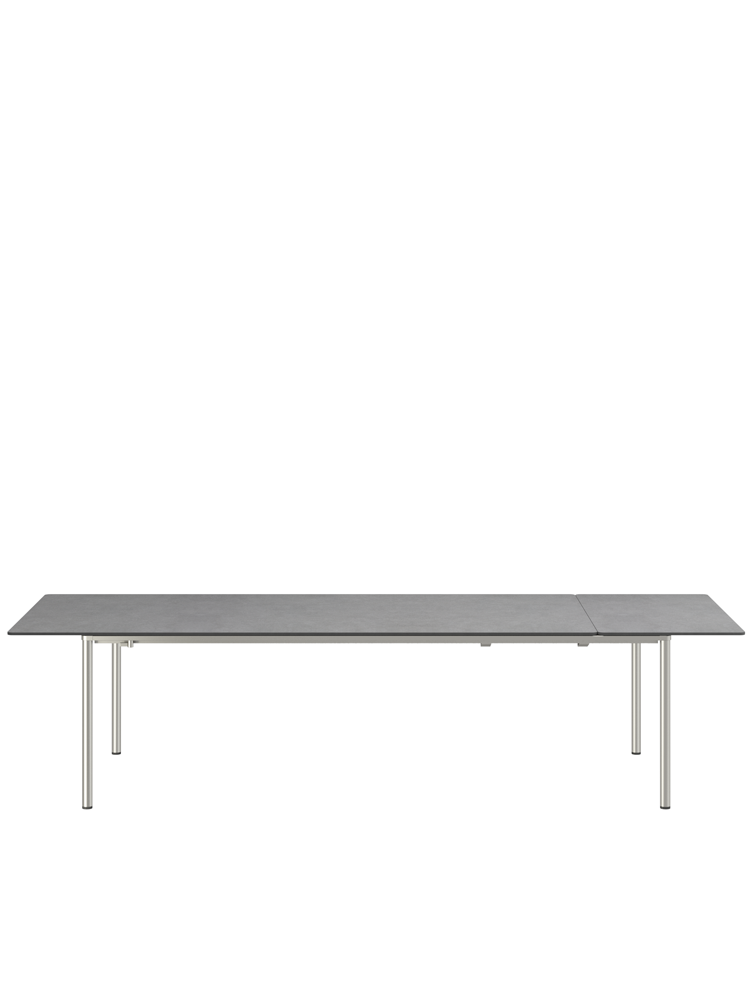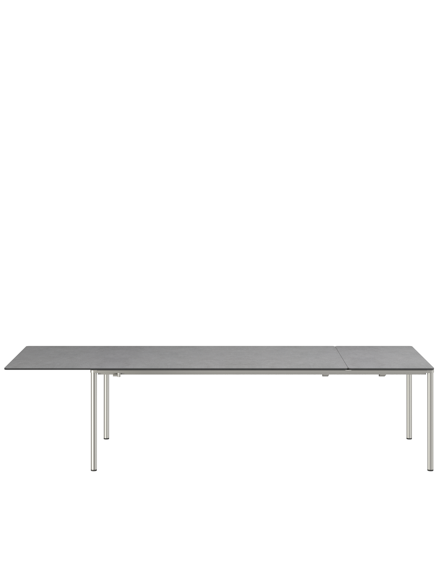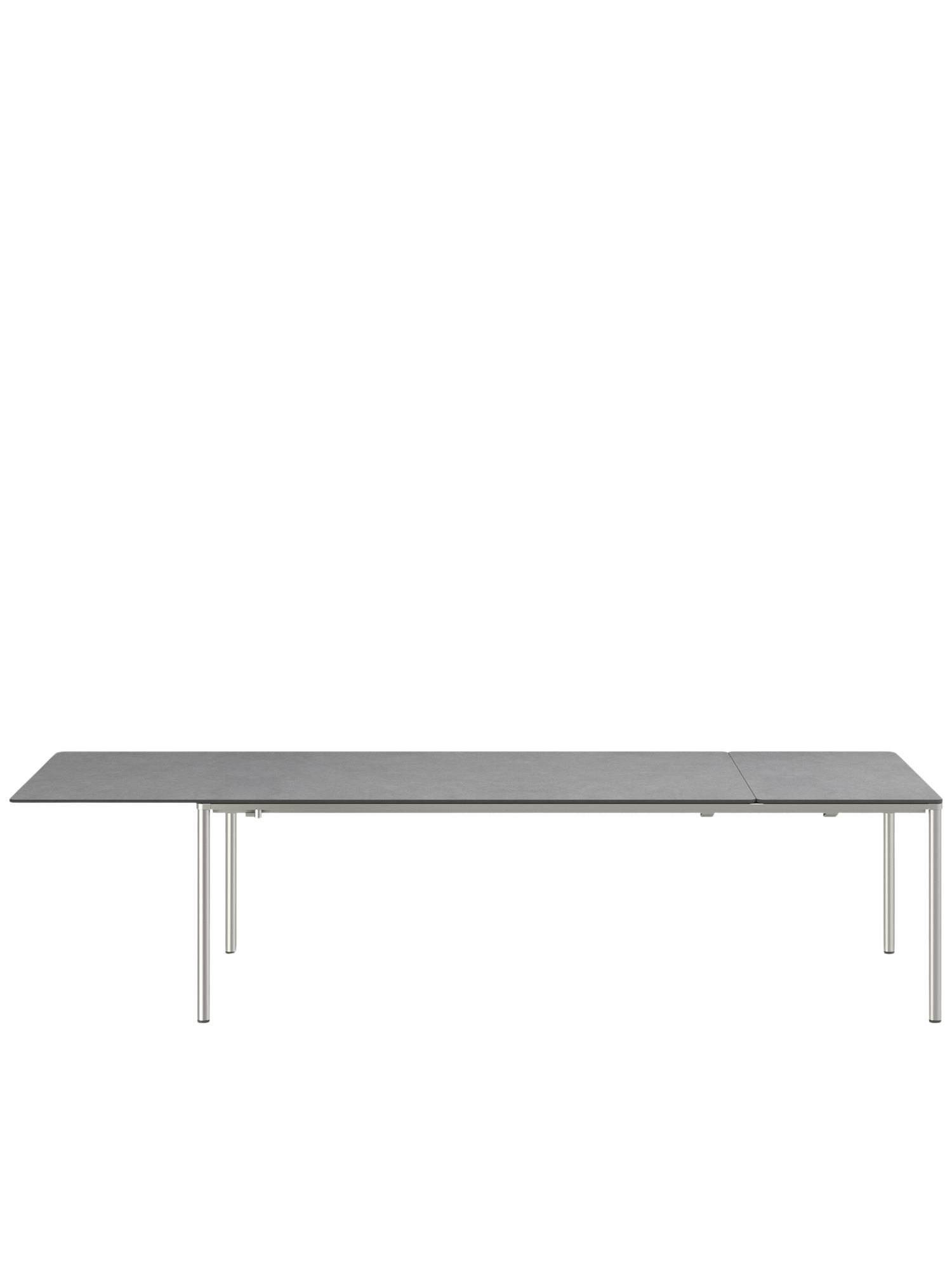 Die innovative und leichtgängige Ausziehmechanik der Portland Tische sorgt für einen fließenden Übergang vom Tisch zur Tafel. Beim mittleren und großen Modell der Serie lagert die Einlegeplatte im Tisch, beim kleinen Tisch wird sie in einer separaten Tasche verwahrt. Zur Erweiterung wird die Tischplatte leicht mit wenigen Handgriffen seitlich verschoben. Beim großen und mittleren Modell wird die Einlegeplatte so positioniert, dass die Tischplatte einen gleichen Überstand zu beiden Seiten hat oder aber auf einer Seite vollständig übersteht. In dieser Variante können alle Gäste längsseits sitzen und Beinfreiheit genießen. Beim kleinen Tisch ist die Platte immer mittig ausgerichtet.