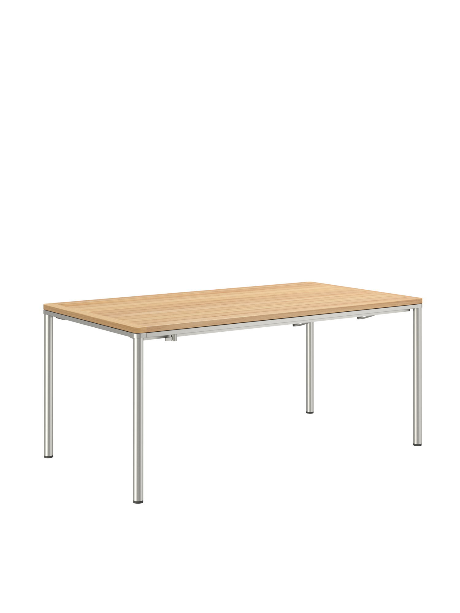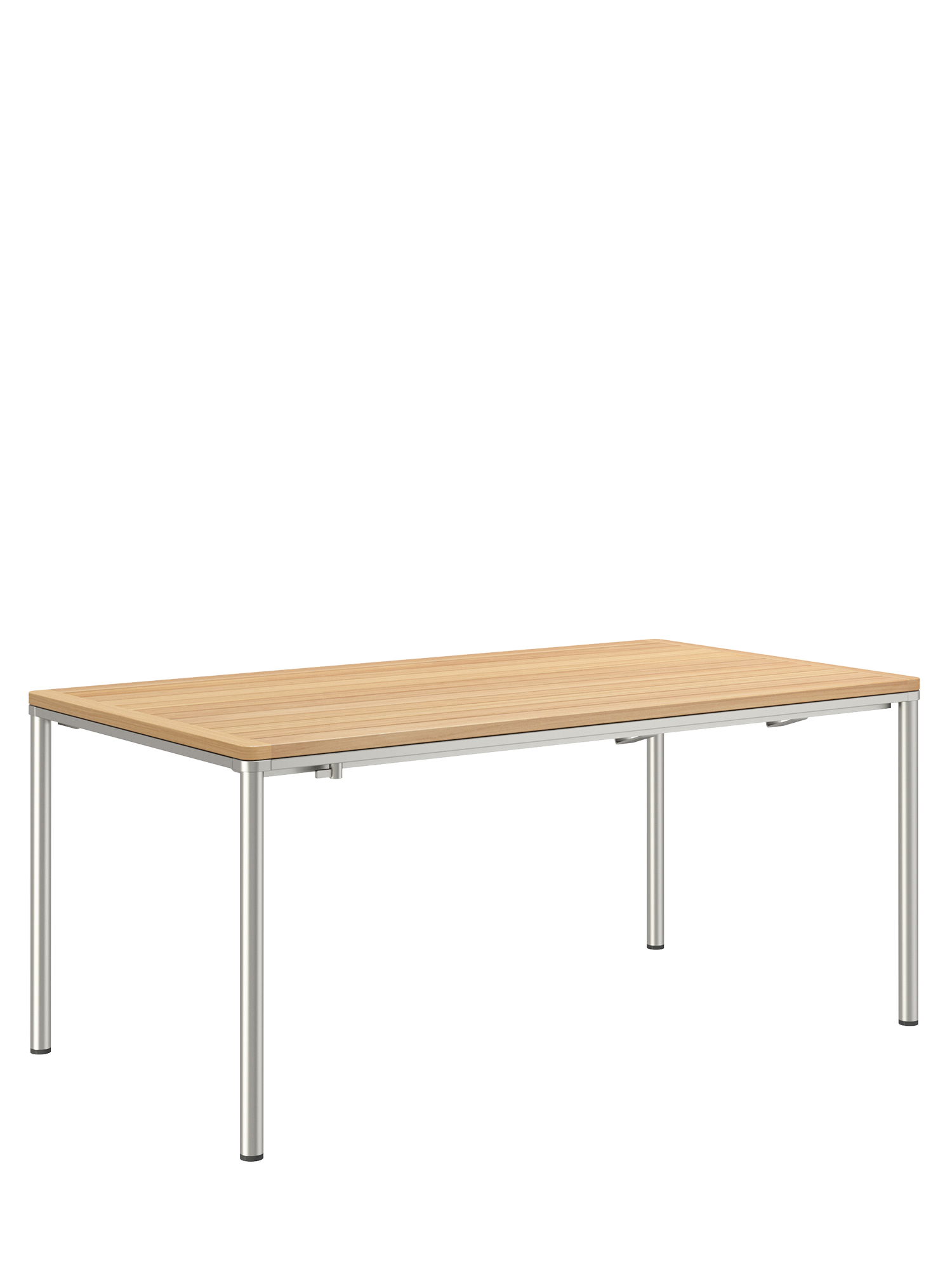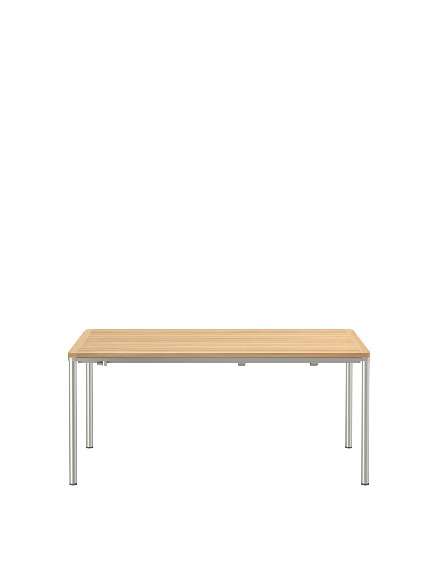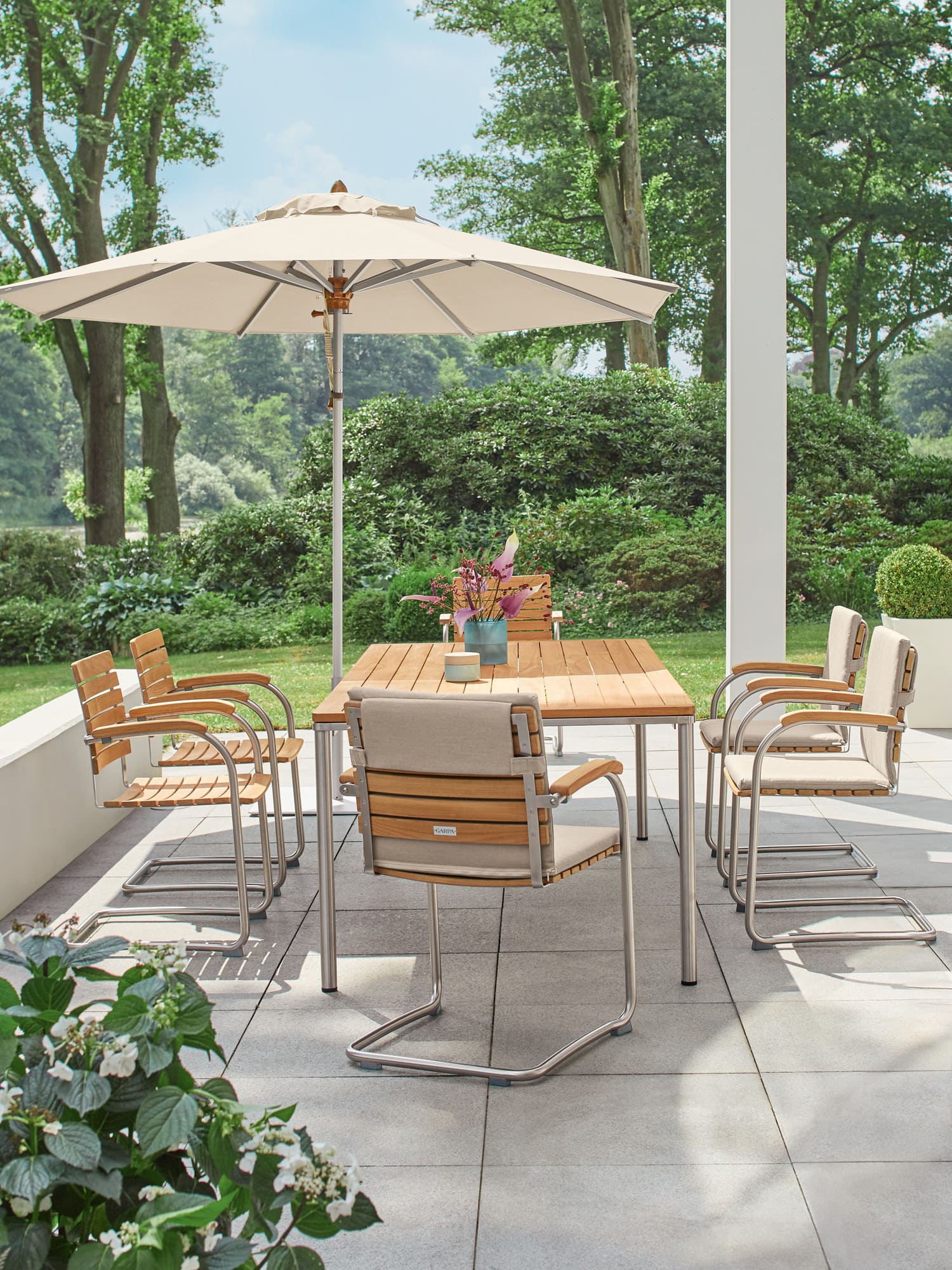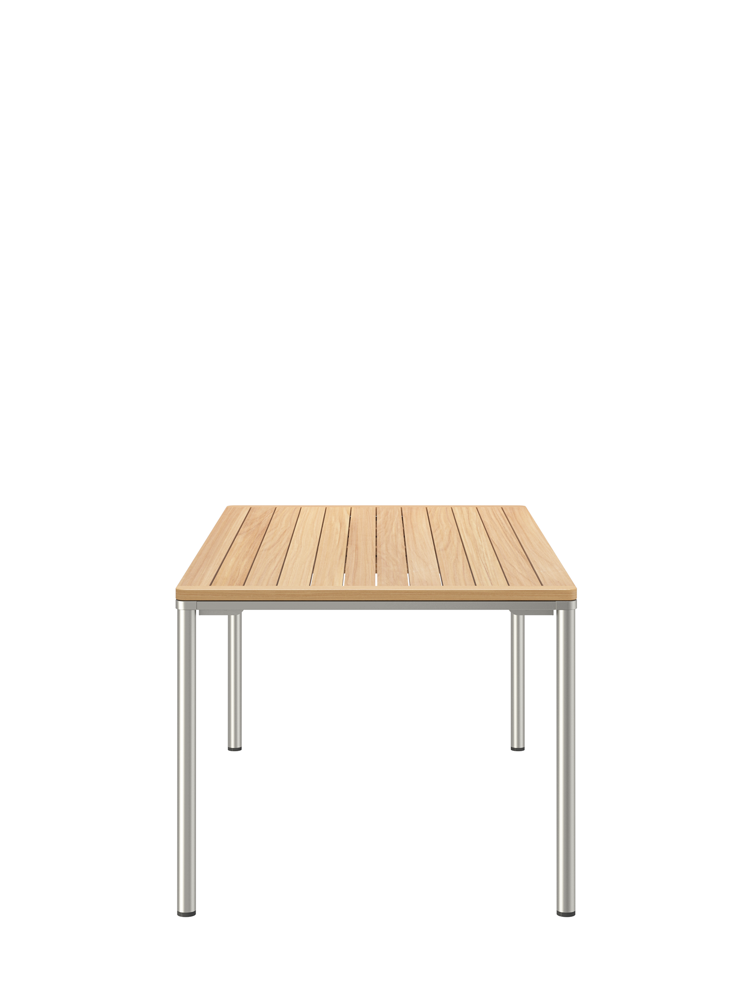 Das Edelstahlgestell der Portland Tische verbindet diese mit allen Stühlen aus gleichem Material. Vier schlanke Beine tragen eine Platte, die mit der Zarge darunter wie aus einem Guss wirkt und in den Ecken der Rundung der Beine folgt. Die Platte besteht aus Teakholz und verleiht dem Tisch damit eine natürliche Wärme.