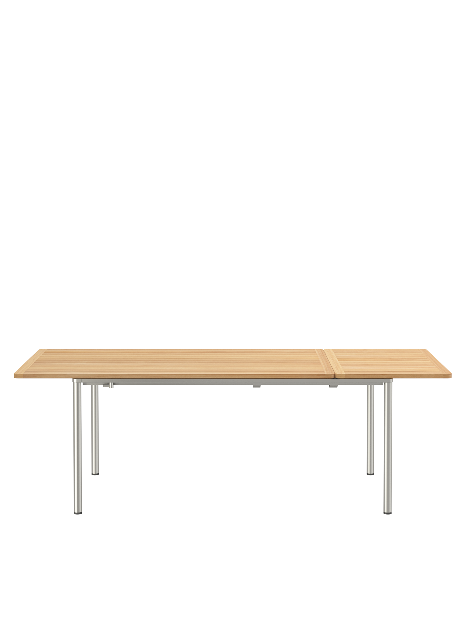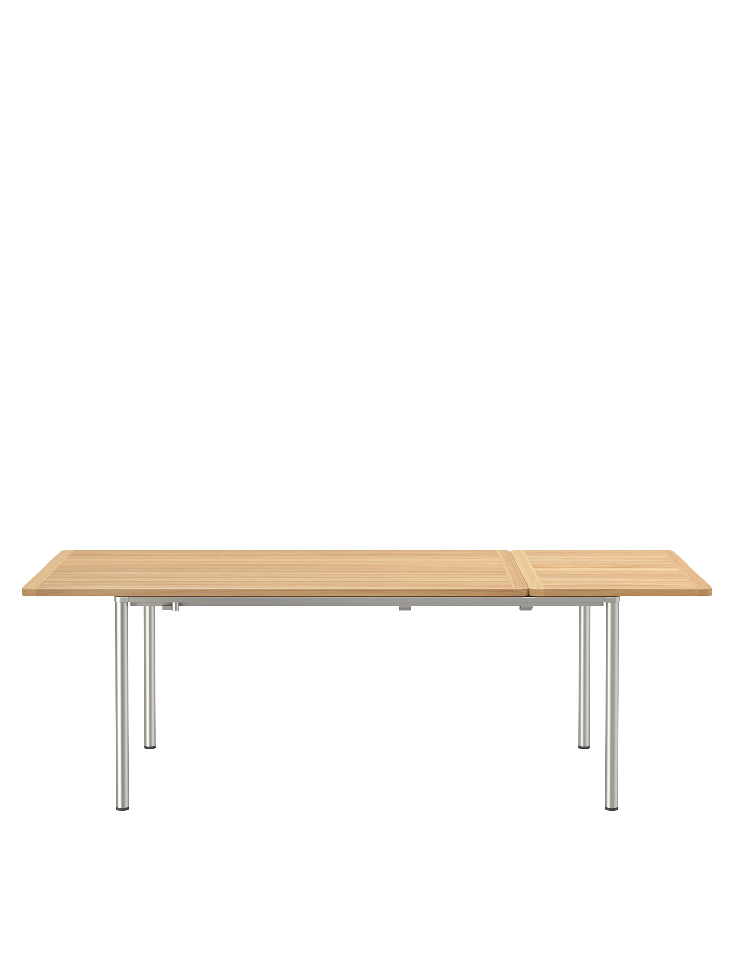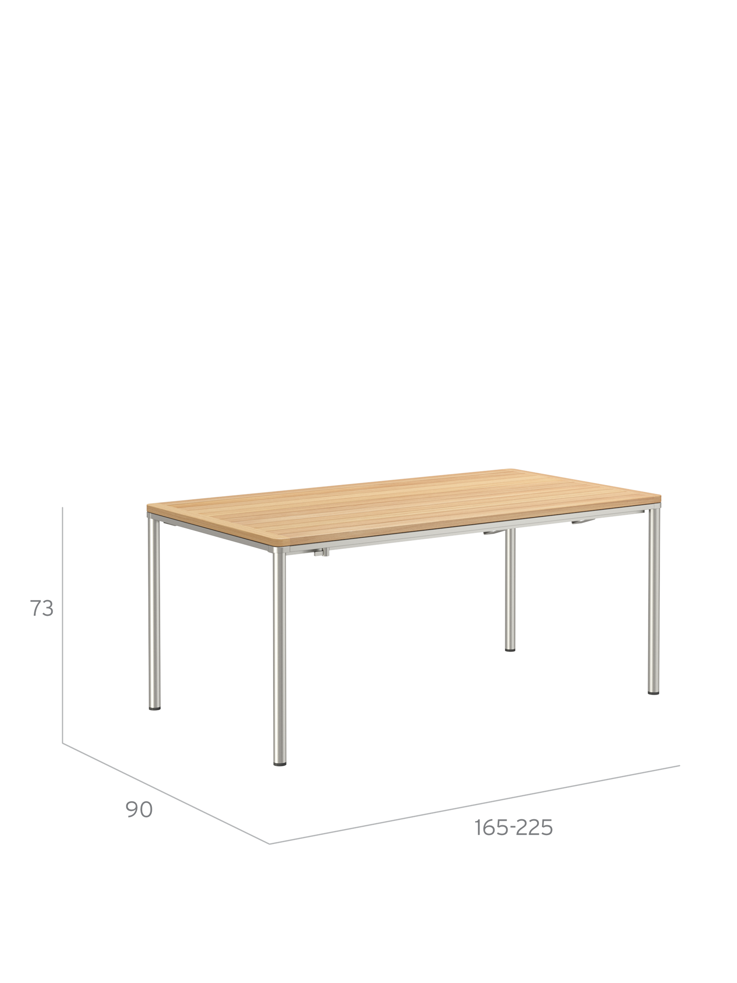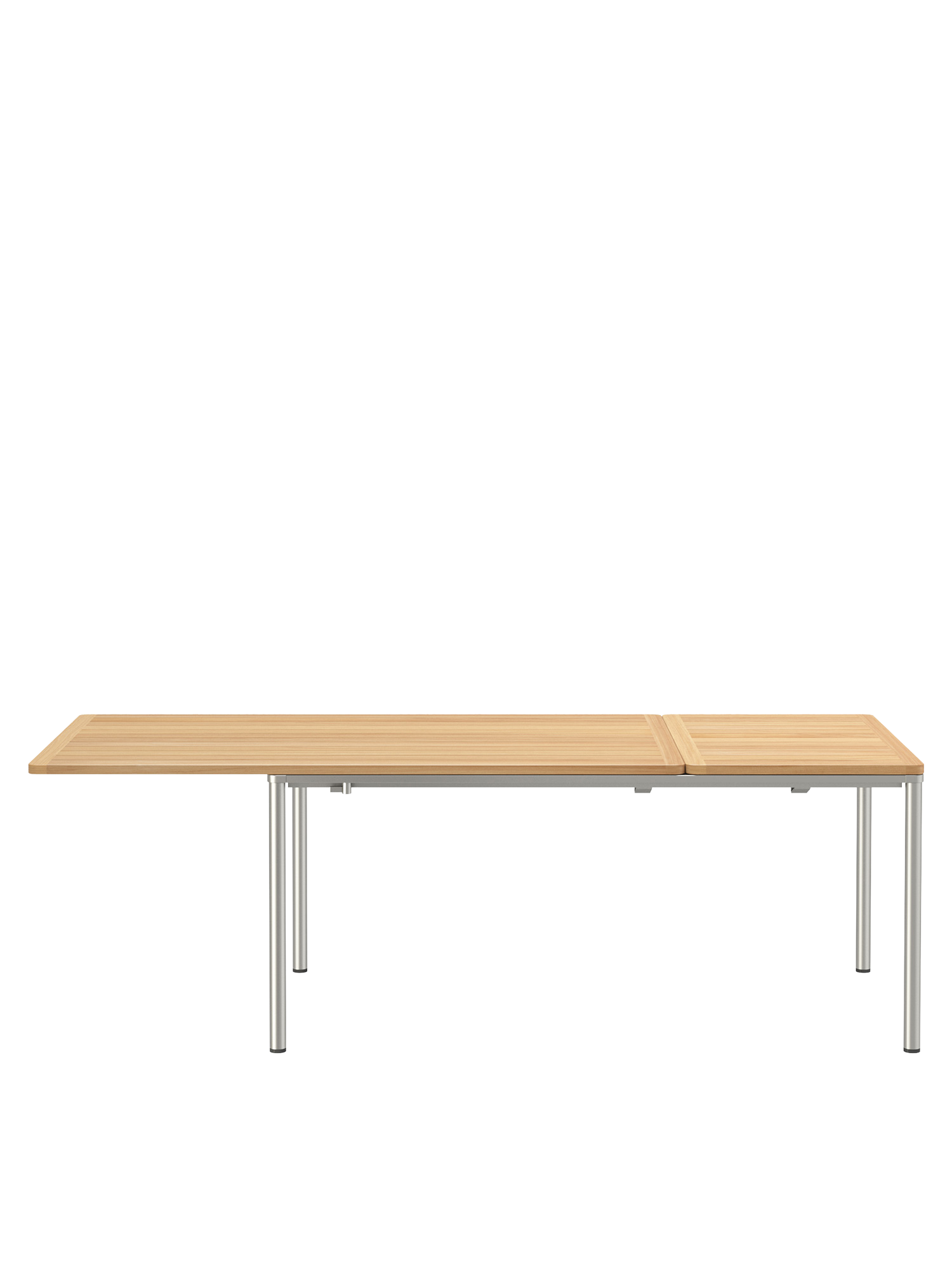 Die innovative und leichtgängige Ausziehmechanik der Portland Tische sorgt für einen fließenden Übergang vom Tisch zur Tafel. Beim mittleren und großen Modell der Serie lagert die Einlegeplatte im Tisch, beim kleinen Tisch wird sie in einer separaten Tasche verwahrt. Zur Erweiterung wird die Tischplatte leicht mit wenigen Handgriffen seitlich verschoben. Beim großen und mittleren Modell wird die Einlegeplatte so positioniert, dass die Tischplatte einen gleichen Überstand zu beiden Seiten hat oder aber auf einer Seite vollständig übersteht. In dieser Variante können alle Gäste längsseits sitzen und Beinfreiheit genießen. Beim kleinen Tisch ist die Platte immer mittig ausgerichtet.