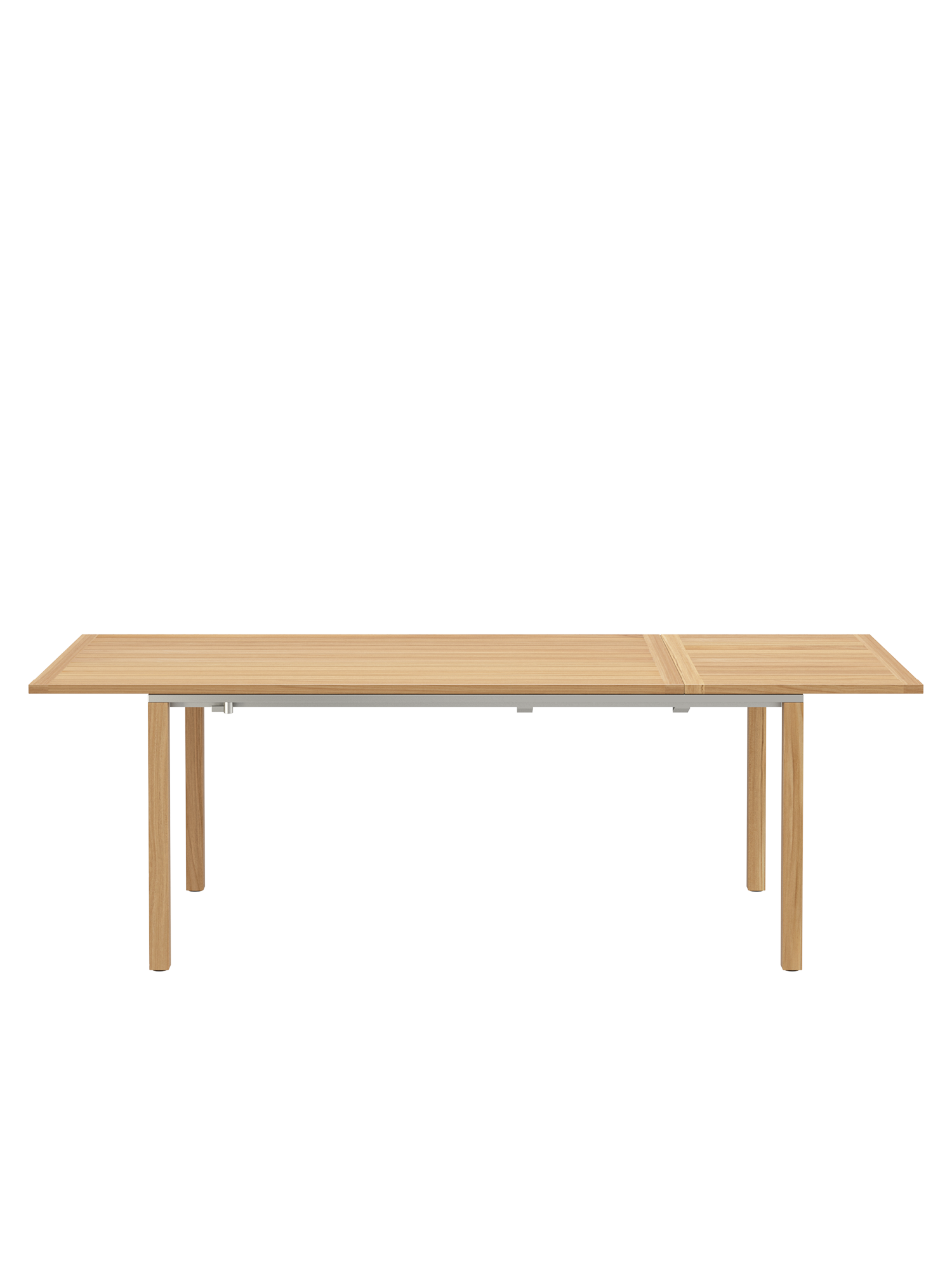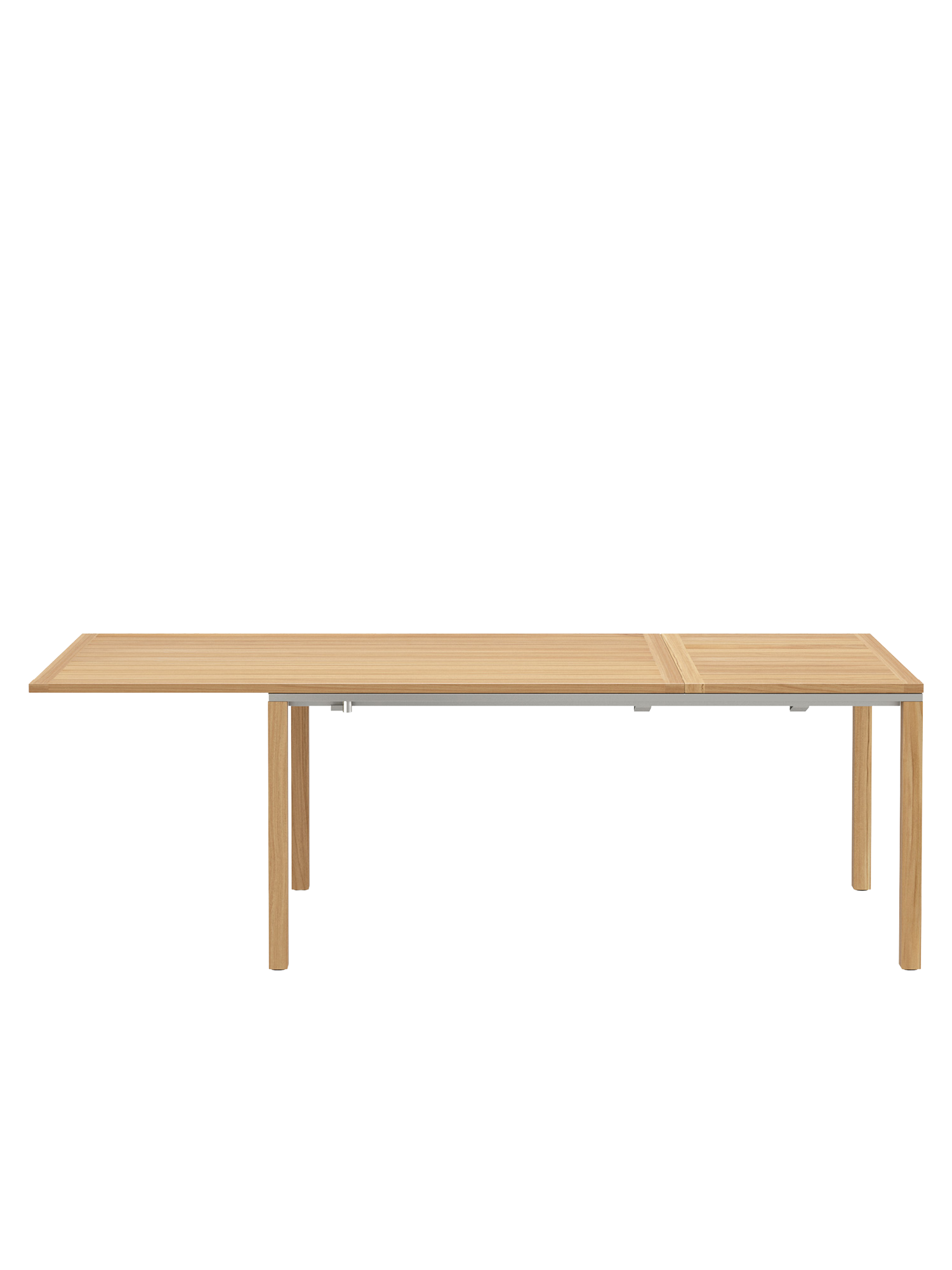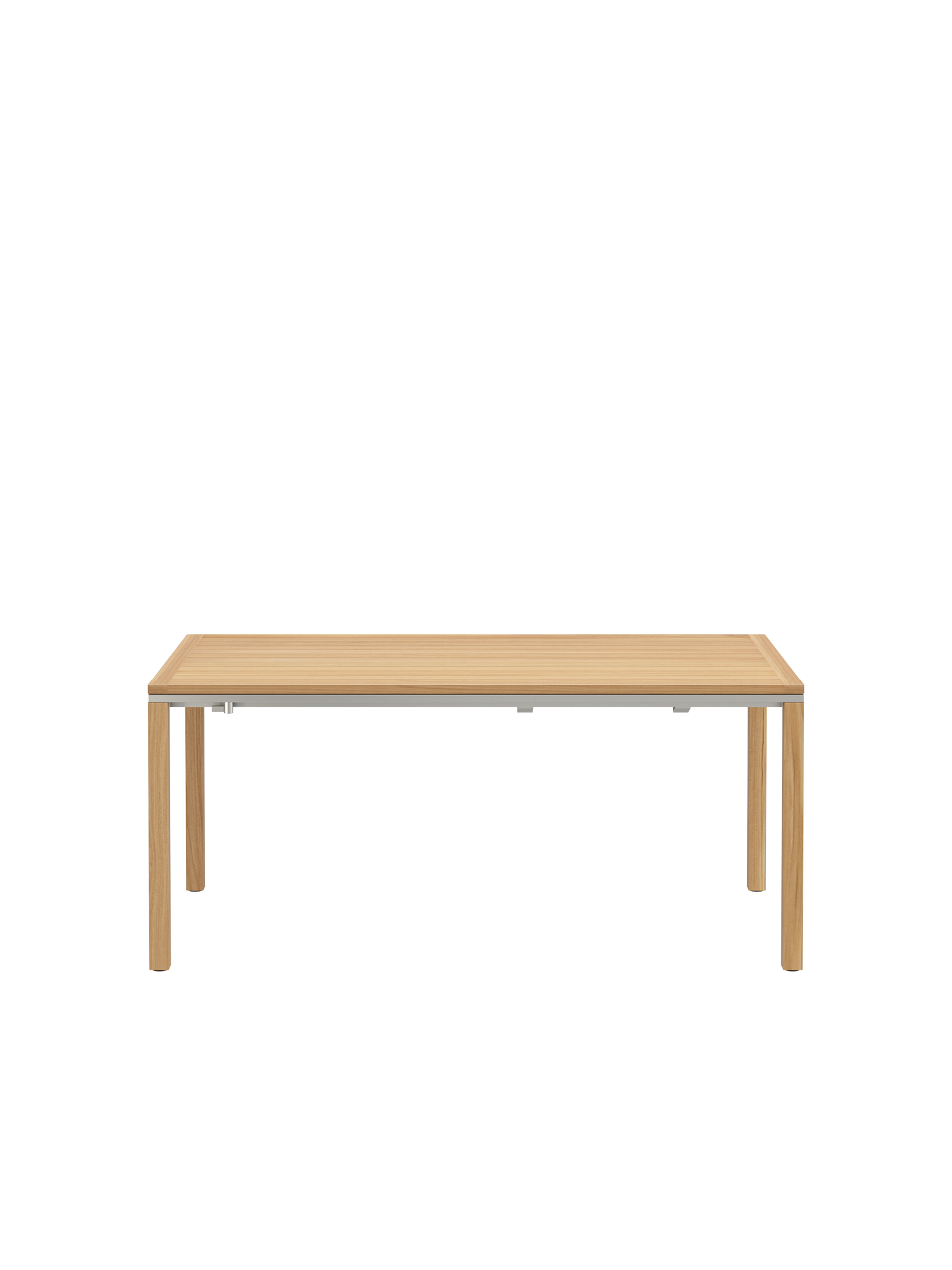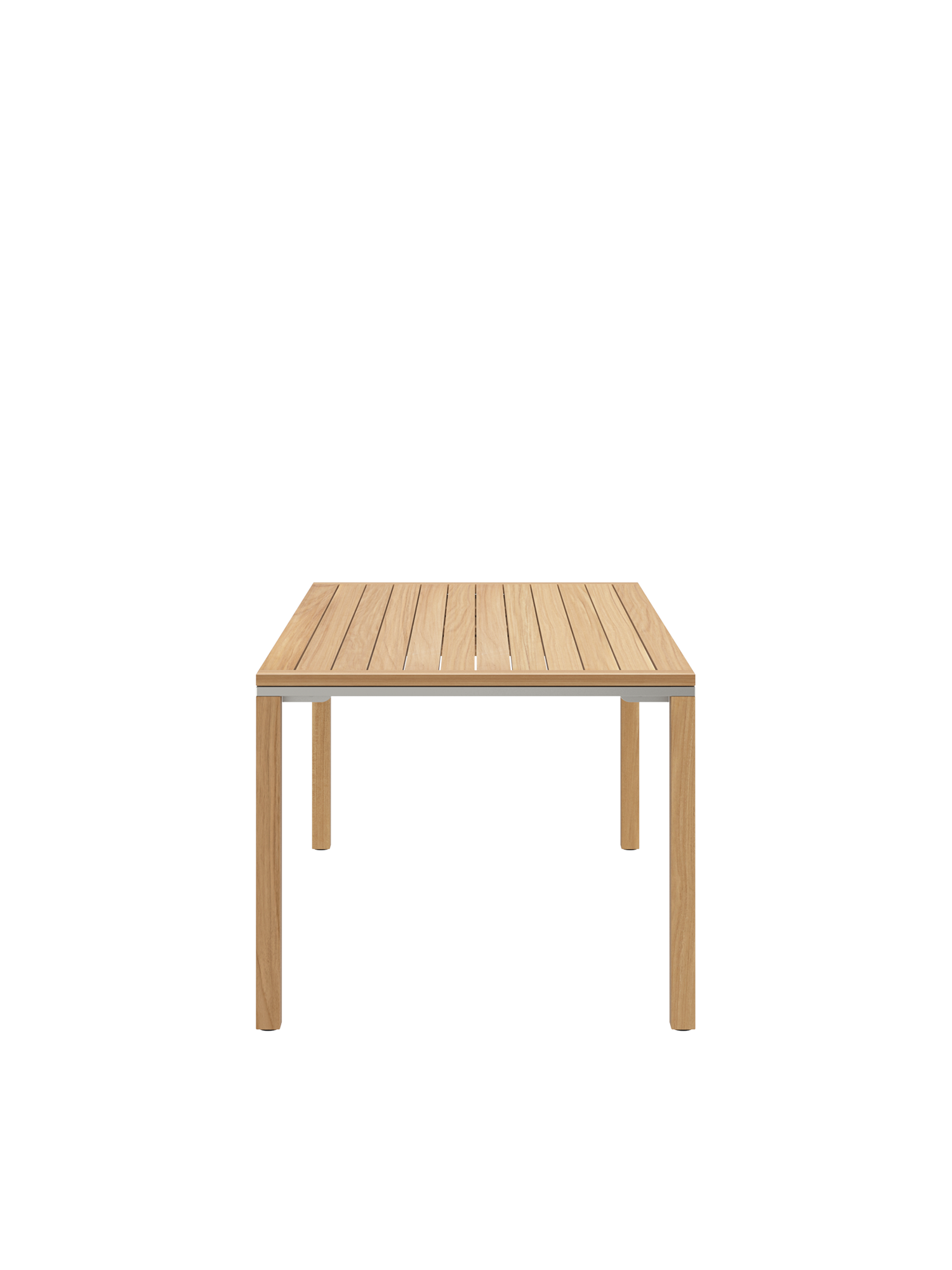 Die geradlinigen Tische verbinden massive Teakleisten mit einer umlaufenden Zarge aus Edelstahl.