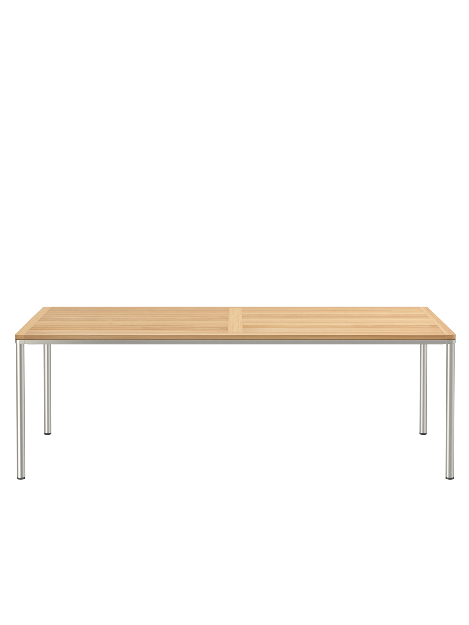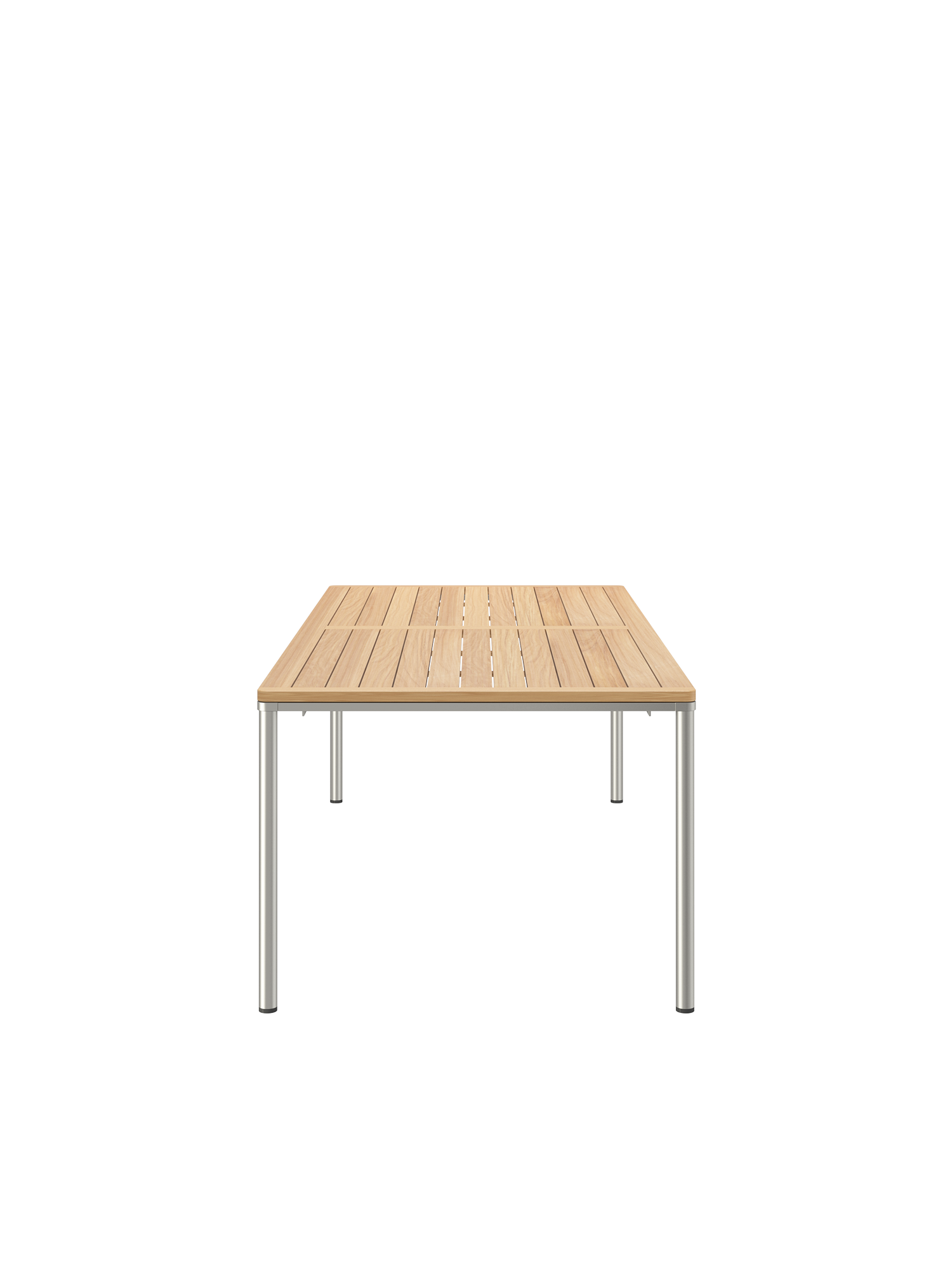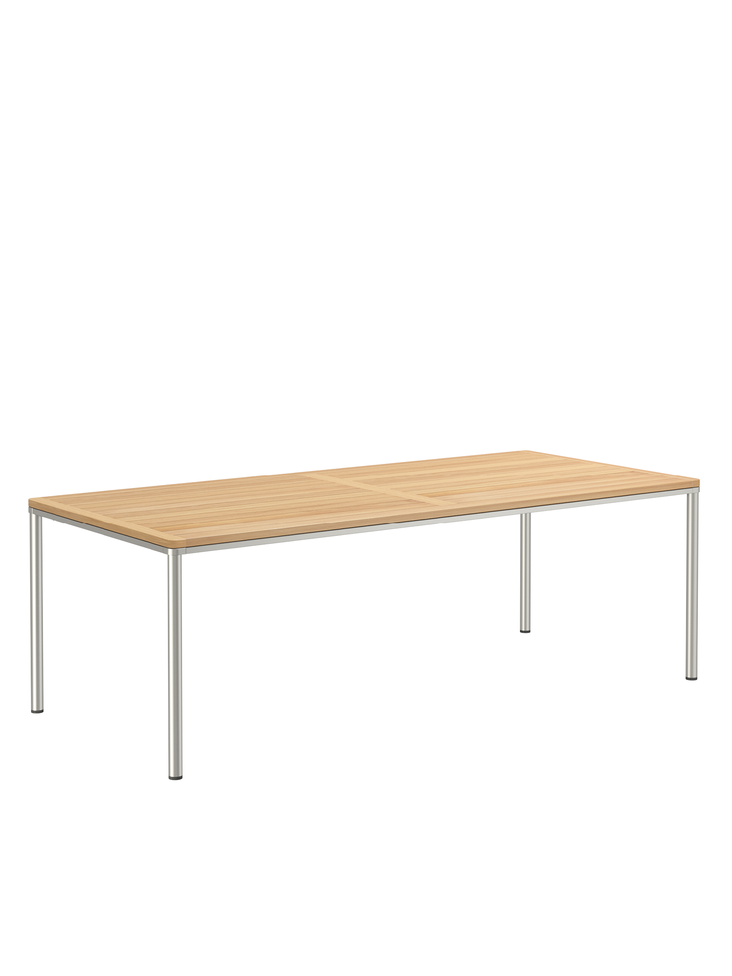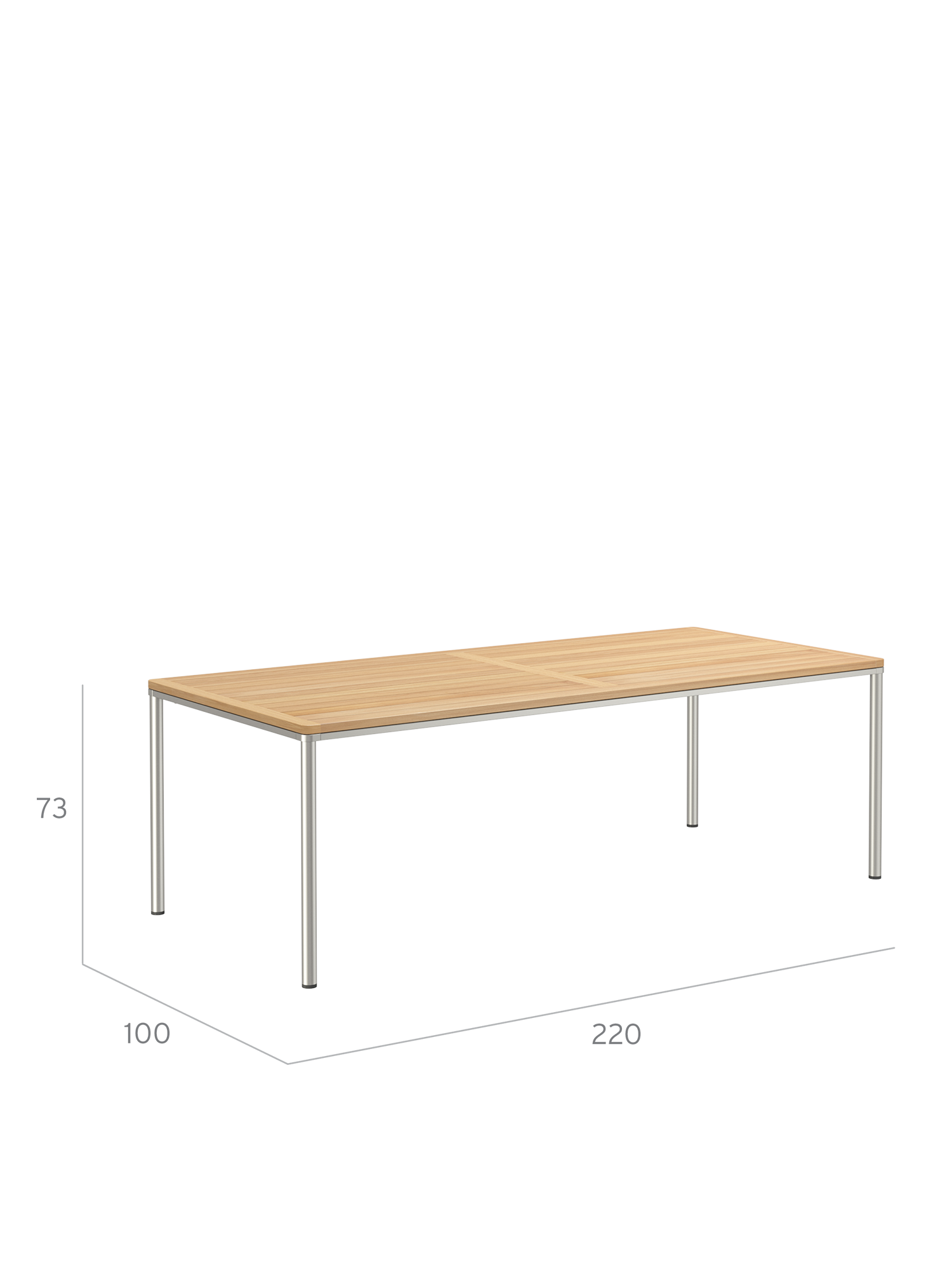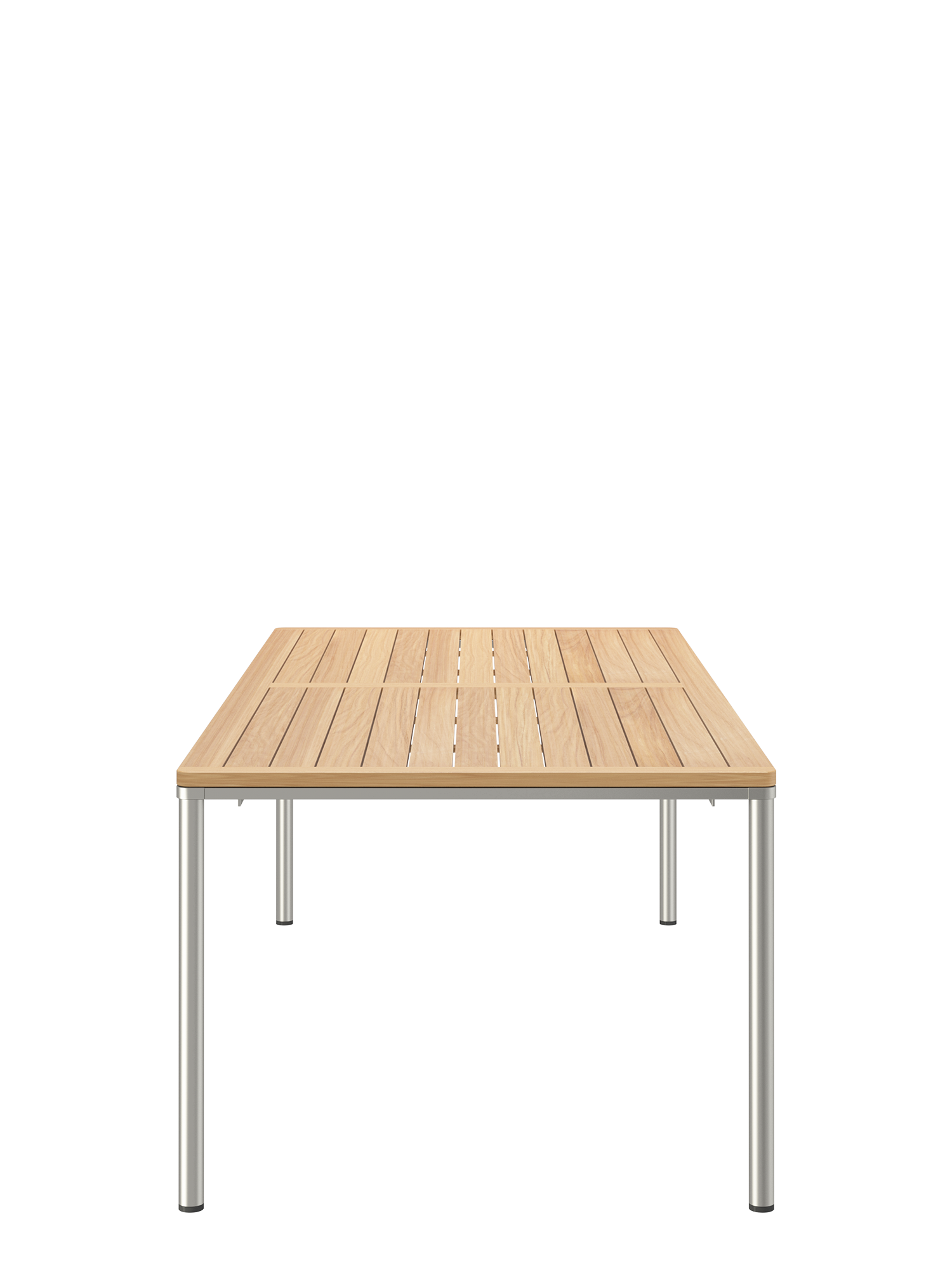 Eine umlaufende Zarge mit sanfter Rundung prägt das Design der Portland Tische. Sie sind der elegante Mittelpunkt jeder Gesellschaft. Die großzügigen Tischplatten aus Teakholz ruhen auf vier schlanken Beinen, das solide Edelstahlgestell harmoniert perfekt mit den Stühlen unserer modernen Möbelserien.