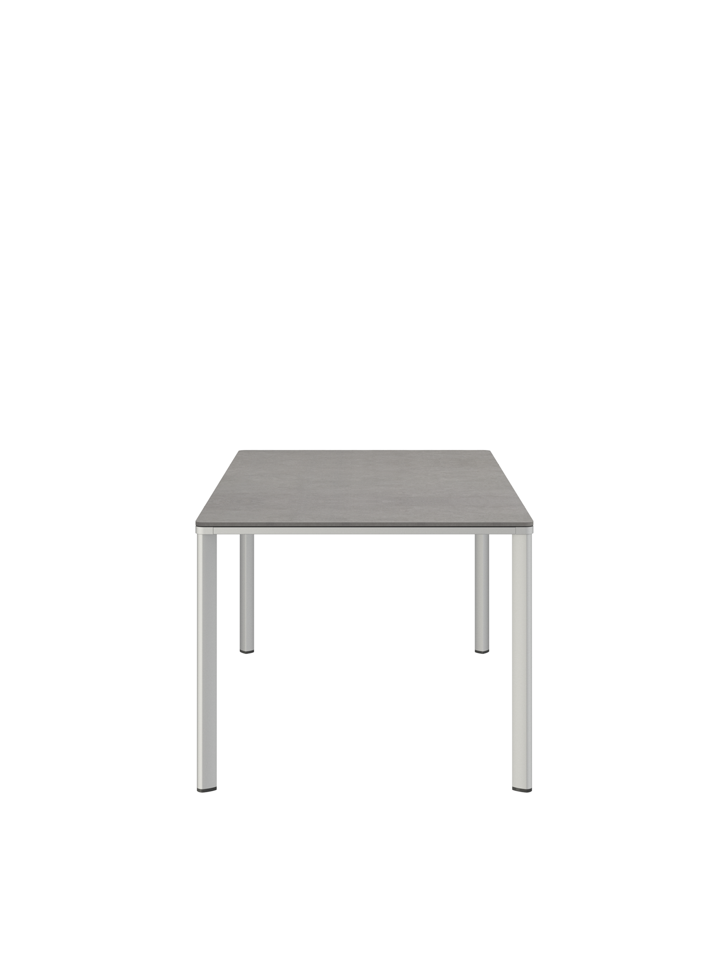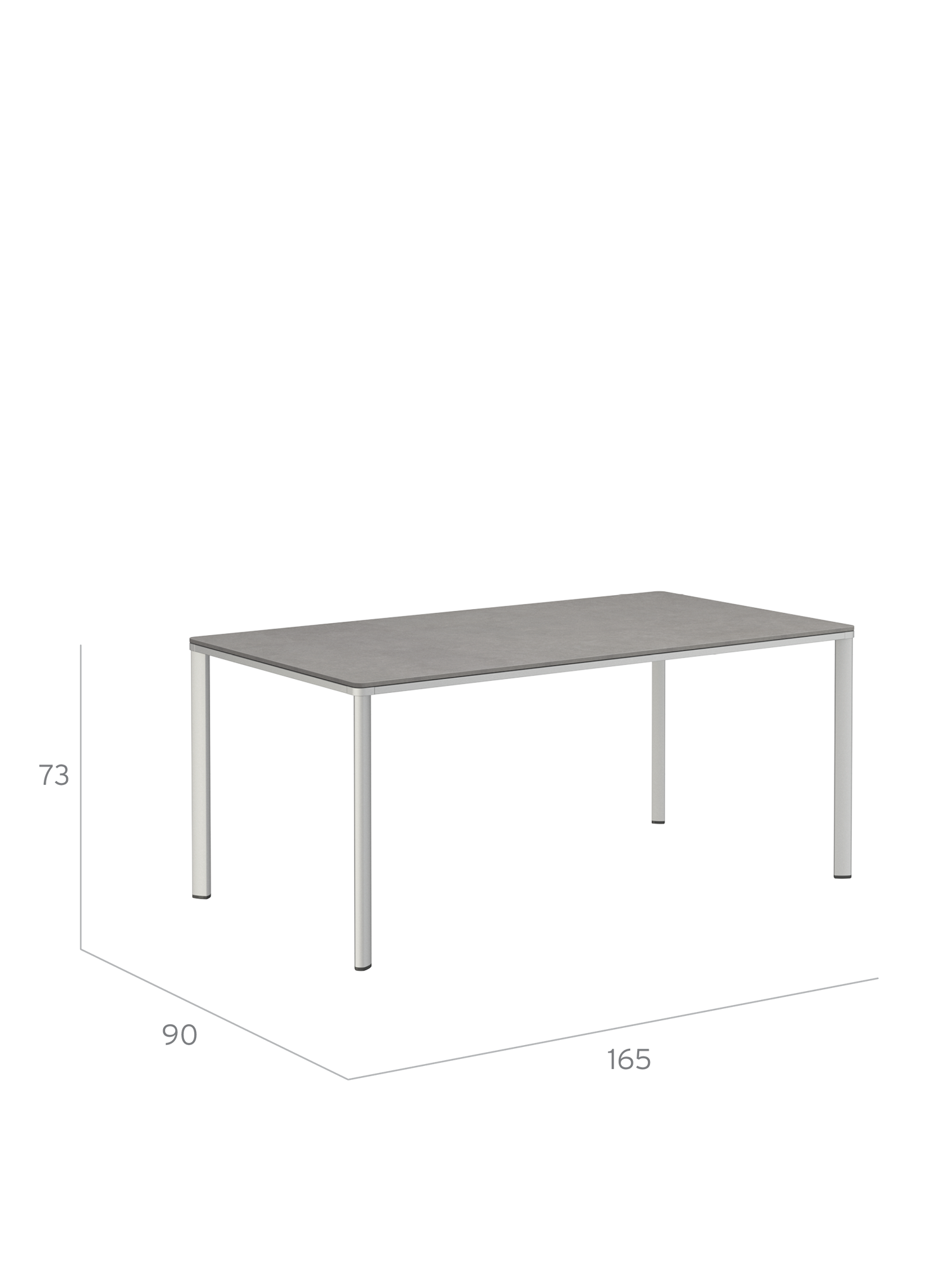 Das aufwendig eloxierte Silk Aluminiumgestell des Portland Tisches verbindet diesen mit den Stühlen der Temper Serie. Vier schlanke Beine tragen eine Platte, die mit der Zarge darunter wie aus einem Guss wirkt und in den Ecken der Rundung der Beine folgt. Die Oberfläche besteht aus pflegeleichten, wetterfestem Kunstharz im Farbton Shade.