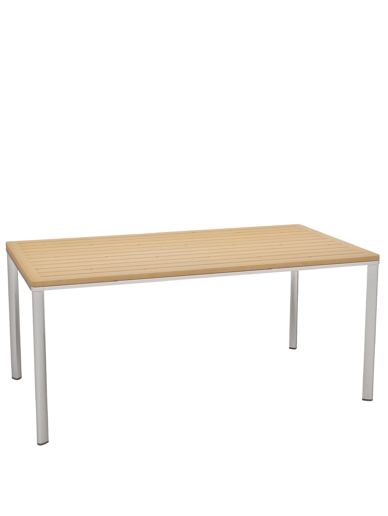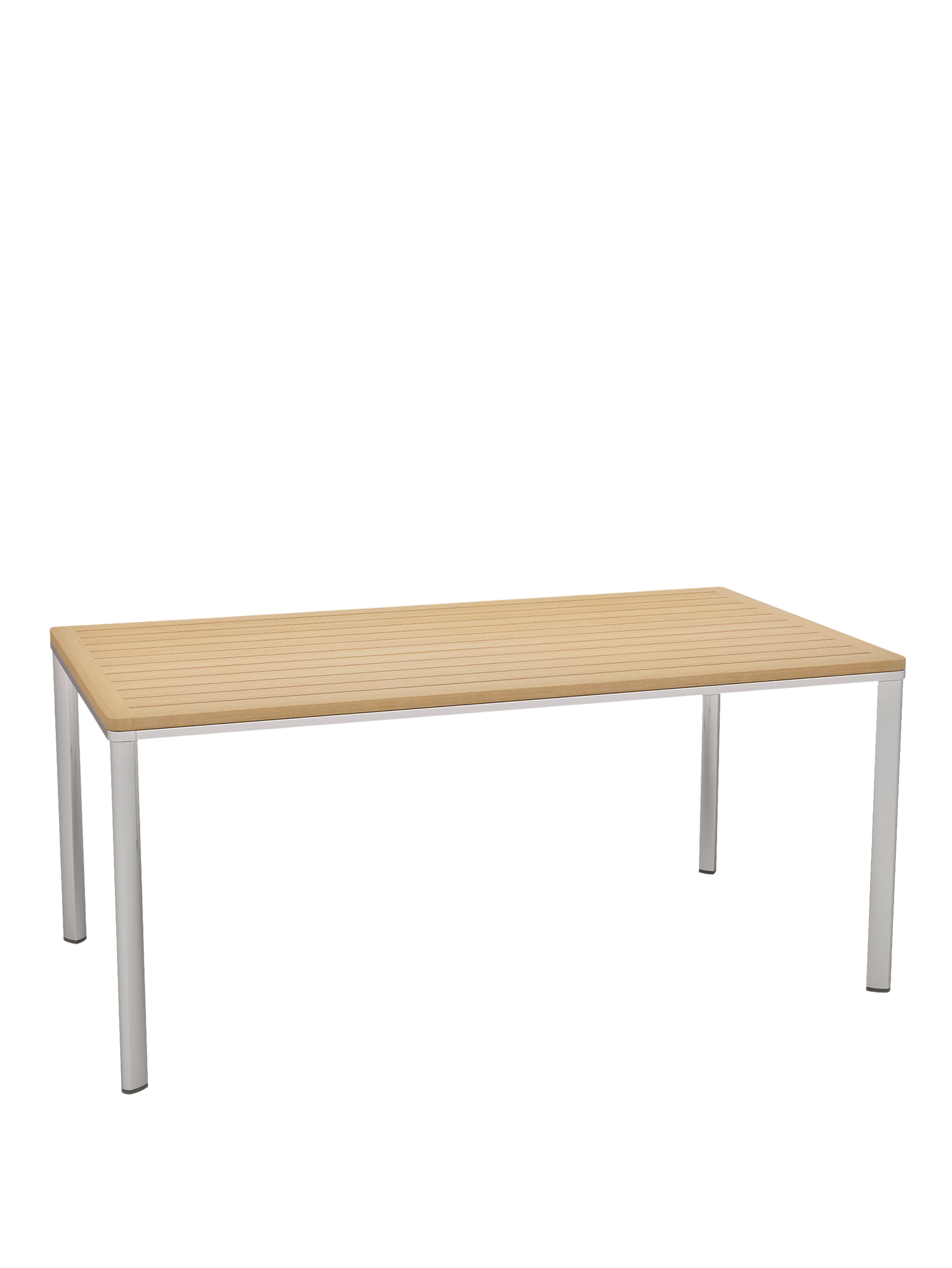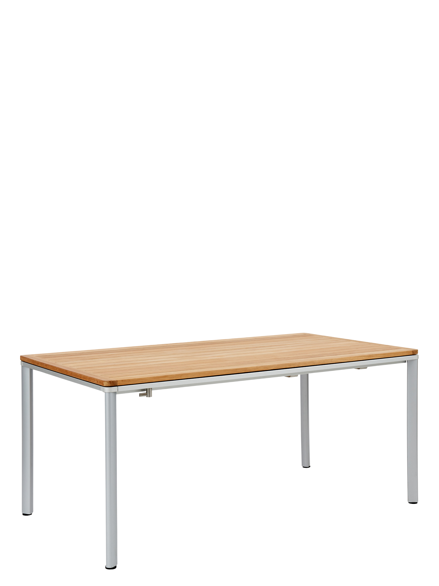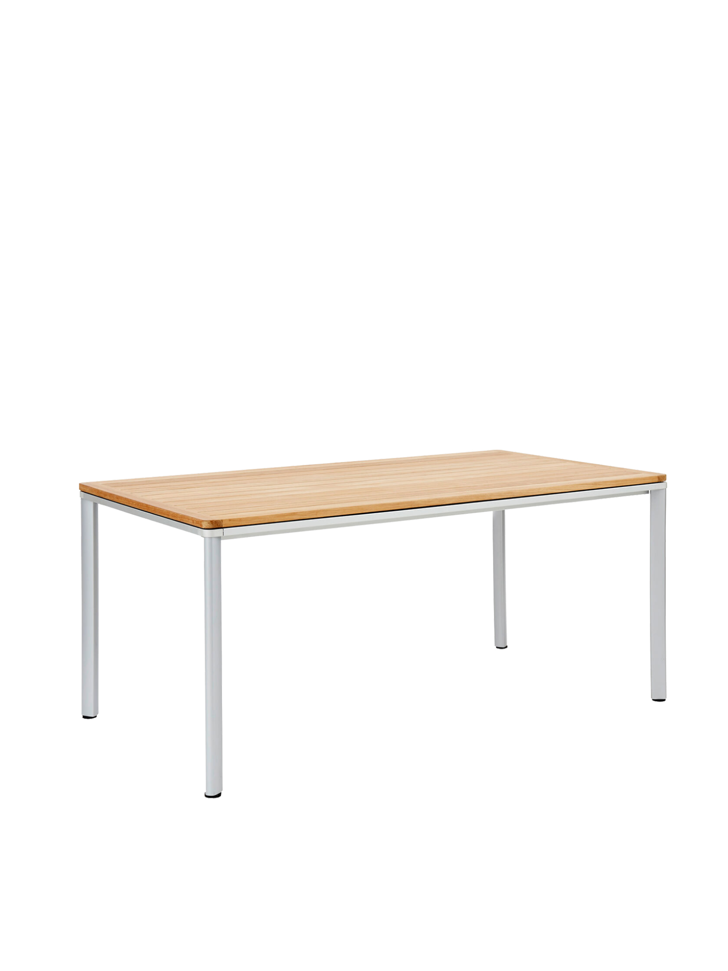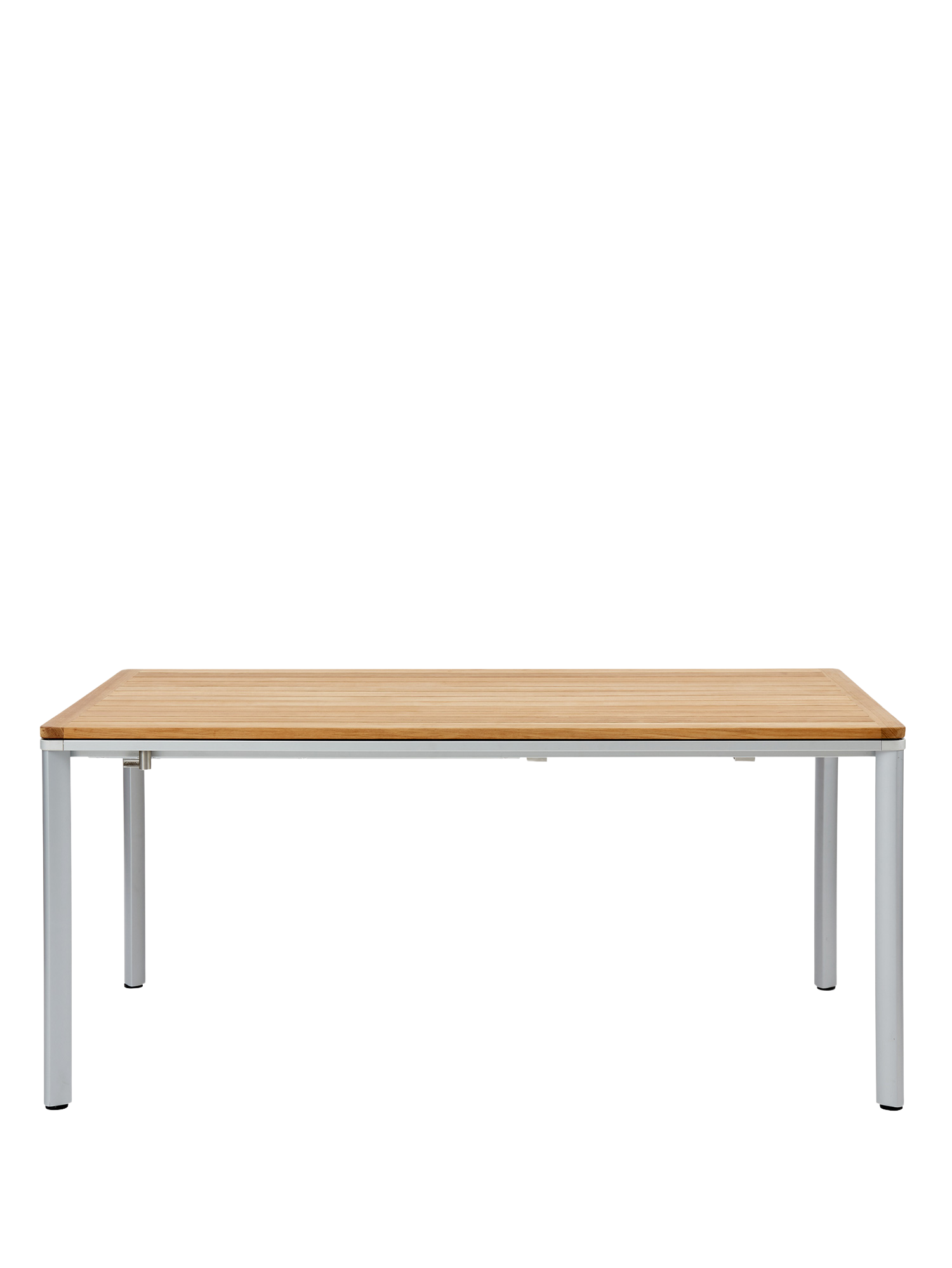 Eine umlaufende Zarge mit sanfter Rundung prägt das Design der vierbeinigen Portland Tische. Dabei lässt sie genügend Raum, um auch Stühle mit Armlehnen unter die Tischplatte zu schieben. Mit einer Tischoberfläche aus Teakleisten und einem Aluminiumgestell sind sie stilsichere Begleiter zu Stühlen der Serie Monterey.