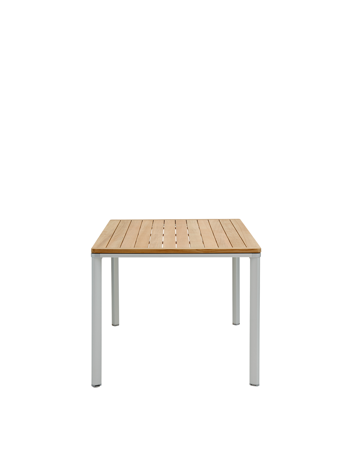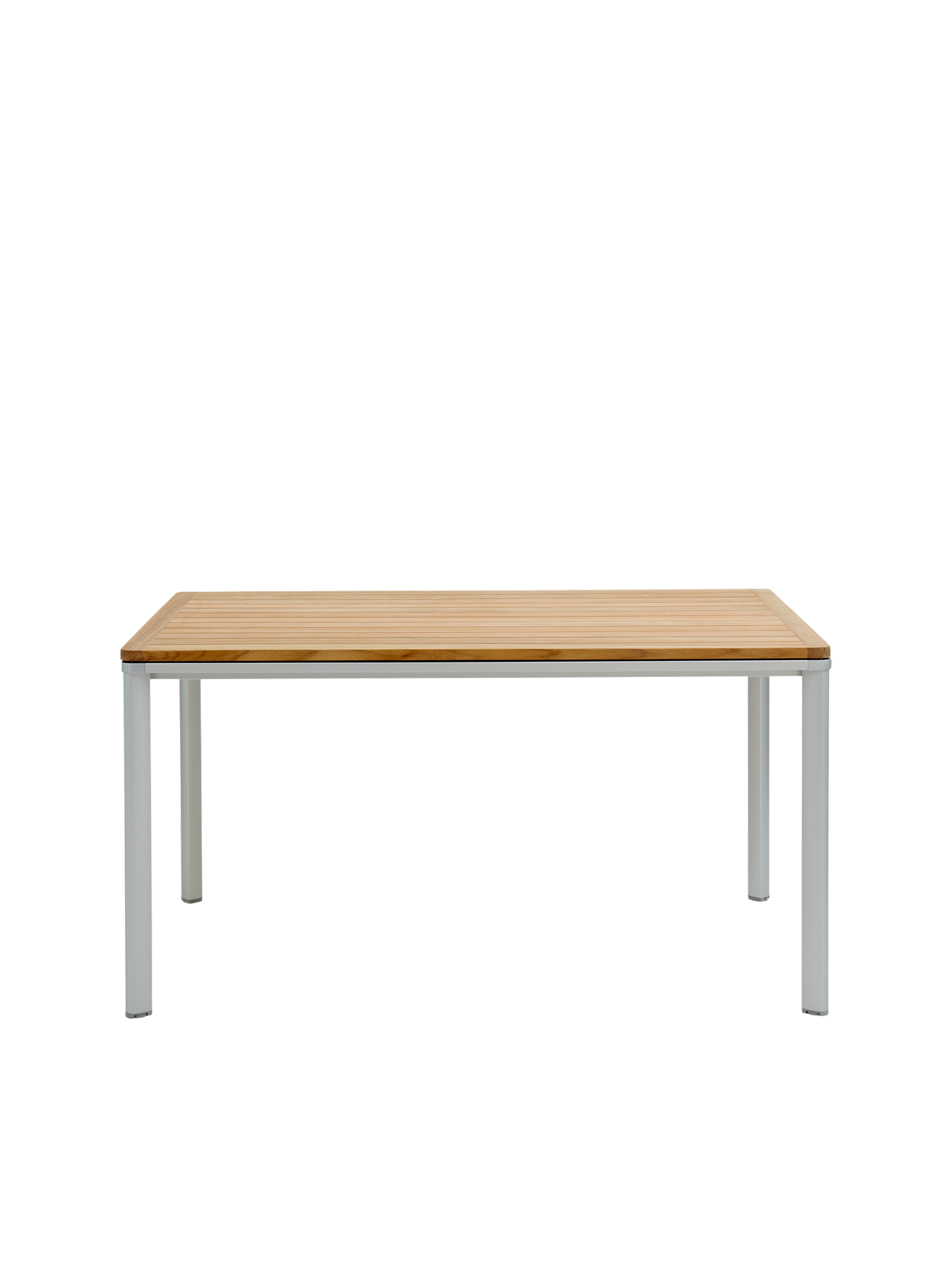 Eine umlaufende Zarge mit sanfter Rundung prägt das Design der vierbeinigen Portland Tische. Dabei lässt sie genügend Raum, um auch Stühle mit Armlehnen unter die Tischplatte zu schieben. Mit einer Tischoberfläche aus Teakleisten und einem Aluminiumgestell sind sie stilsichere Begleiter zu Stühlen der Serie Monterey.