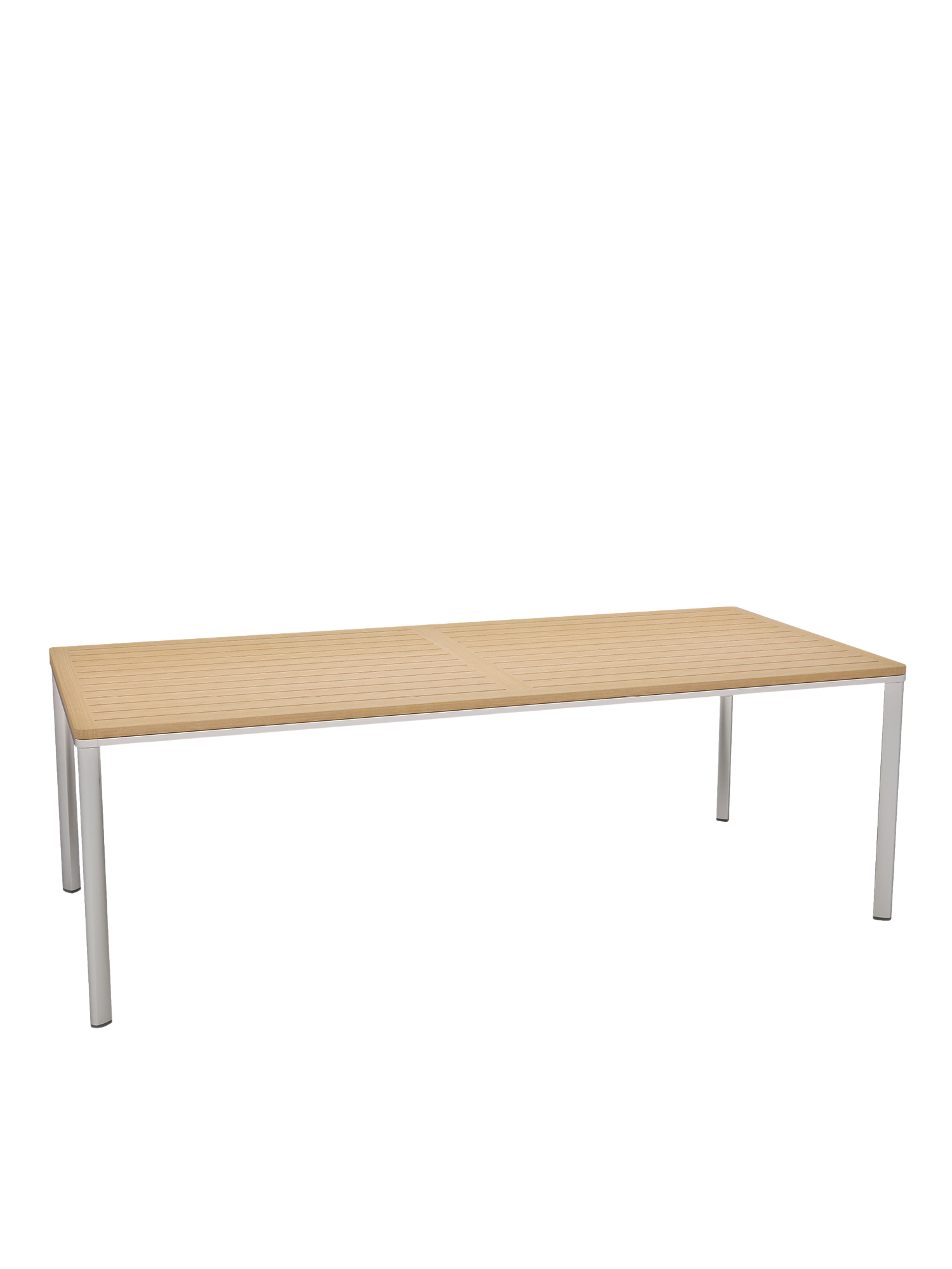 Eine umlaufende Zarge mit sanfter Rundung prägt das Design der vierbeinigen Portland Tische. Dabei lässt sie genügend Raum, um auch Stühle mit Armlehnen unter die Tischplatte zu schieben. Mit einer Tischoberfläche aus Teakleisten und einem Aluminiumgestell sind sie stilsichere Begleiter zu Stühlen der Serie Monterey.