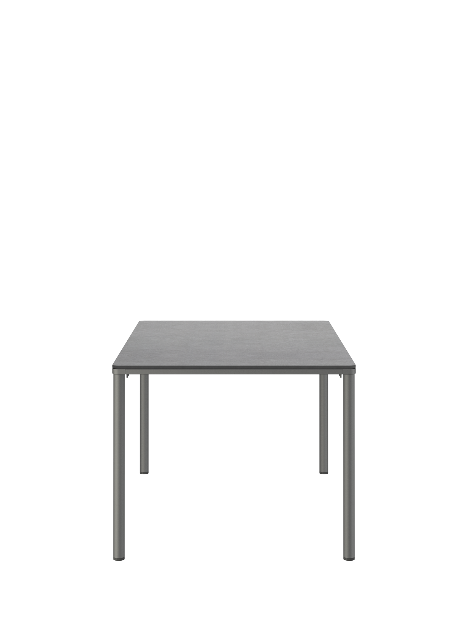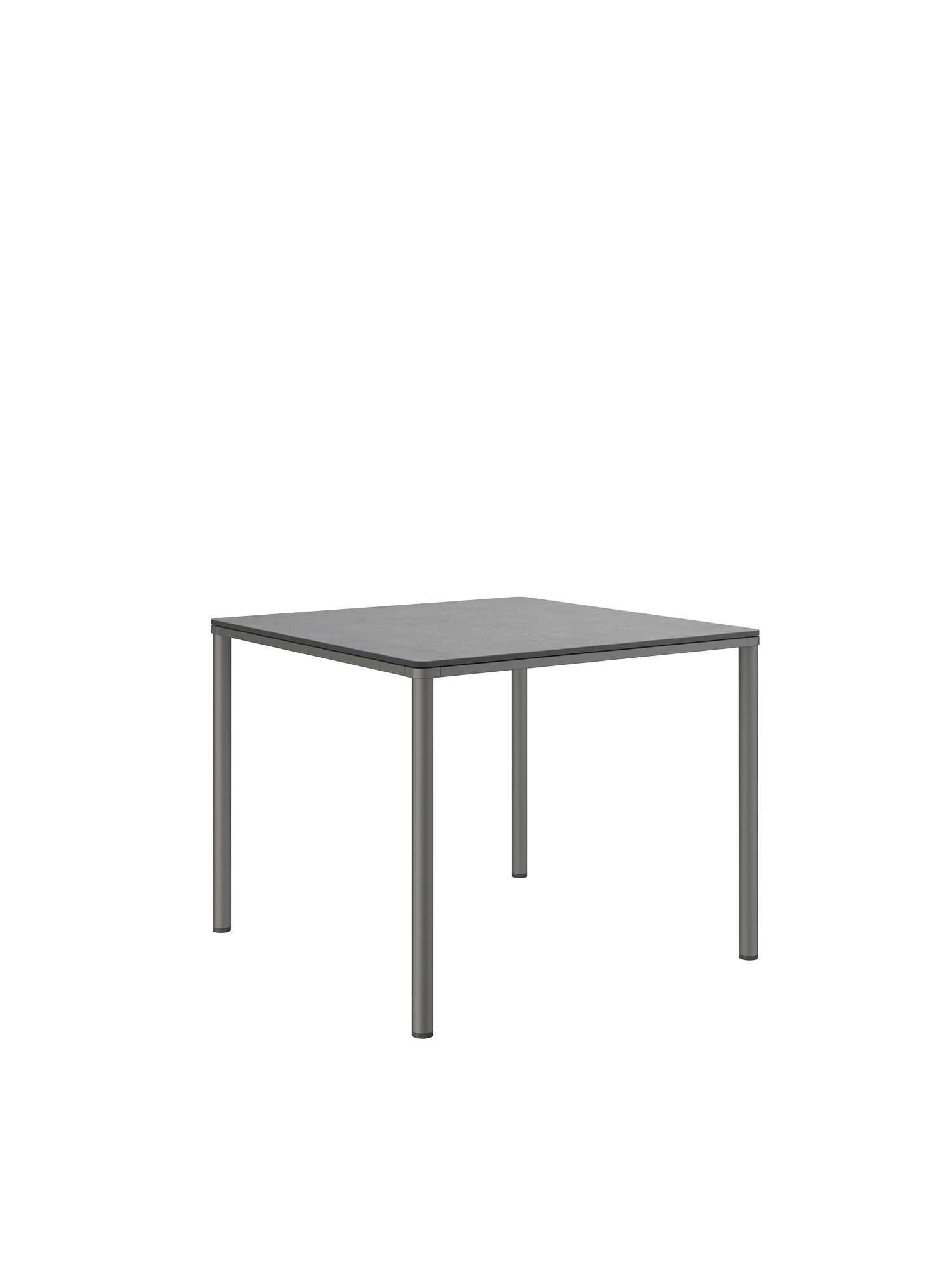 Das graphitfarben pulverbeschichtete Edelstahlgestell der Portland Tische verbindet diese mit allen Stühlen aus gleichem Material. Vier schlanke Beine tragen eine Platte, die mit der Zarge darunter wie aus einem Guss wirkt und in den Ecken der Rundung der Beine folgt. Die Oberfläche besteht aus wetterfestem Kunstharz im dunklen Farbton Shade.