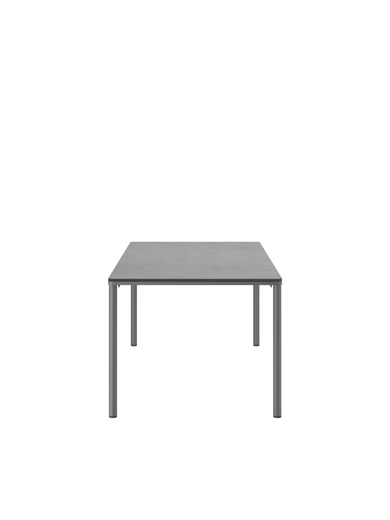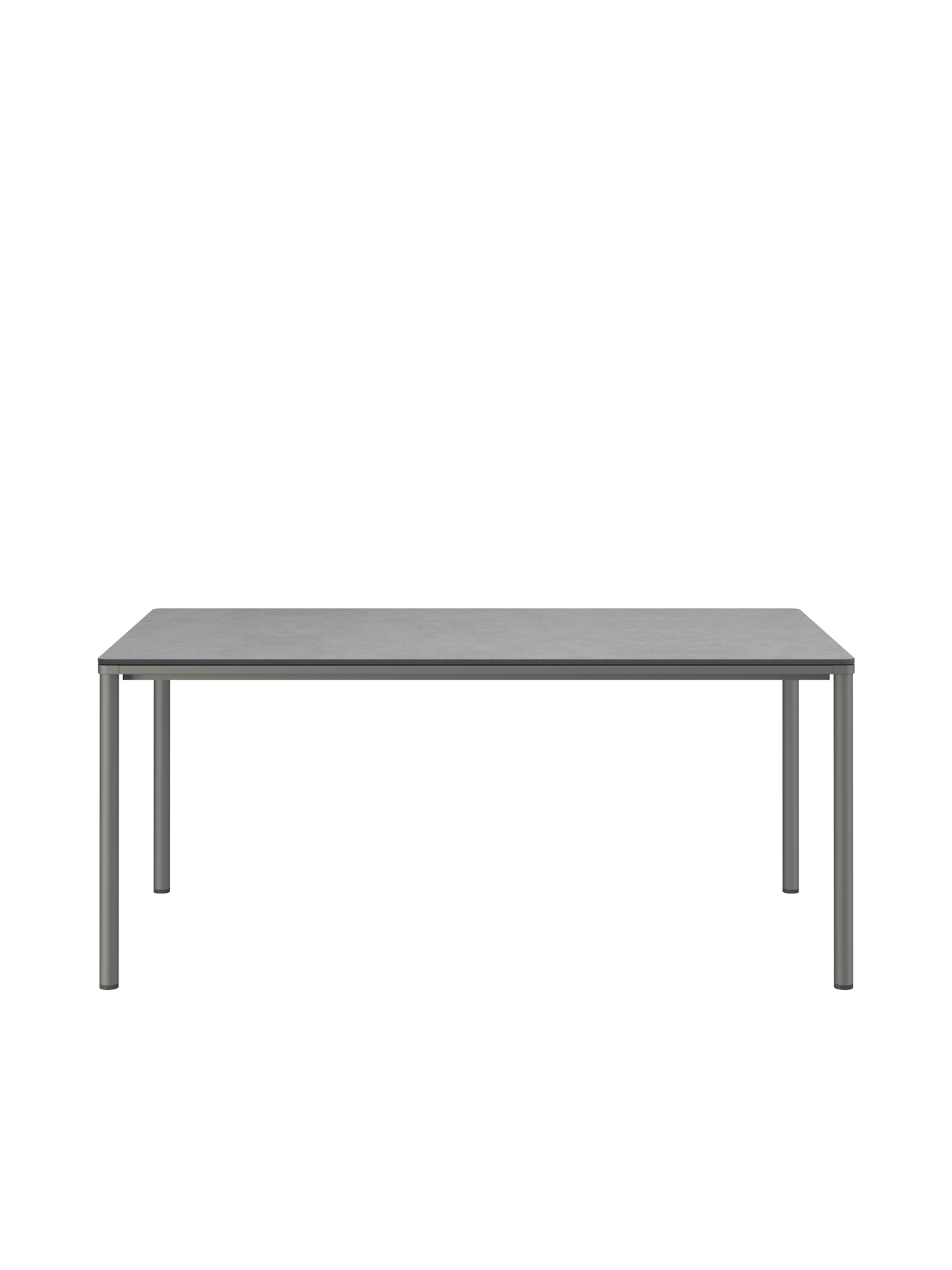 Das graphitgrau pulverbeschichtete Edelstahlgestell der Portland Tische verbindet diese mit allen Stühlen aus gleichem Material. Vier schlanke Beine tragen eine Platte, die mit der Zarge darunter wie aus einem Guss wirkt und in den Ecken der Rundung der Beine folgt. Die Oberfläche besteht aus hochwertigem Kunstharz.