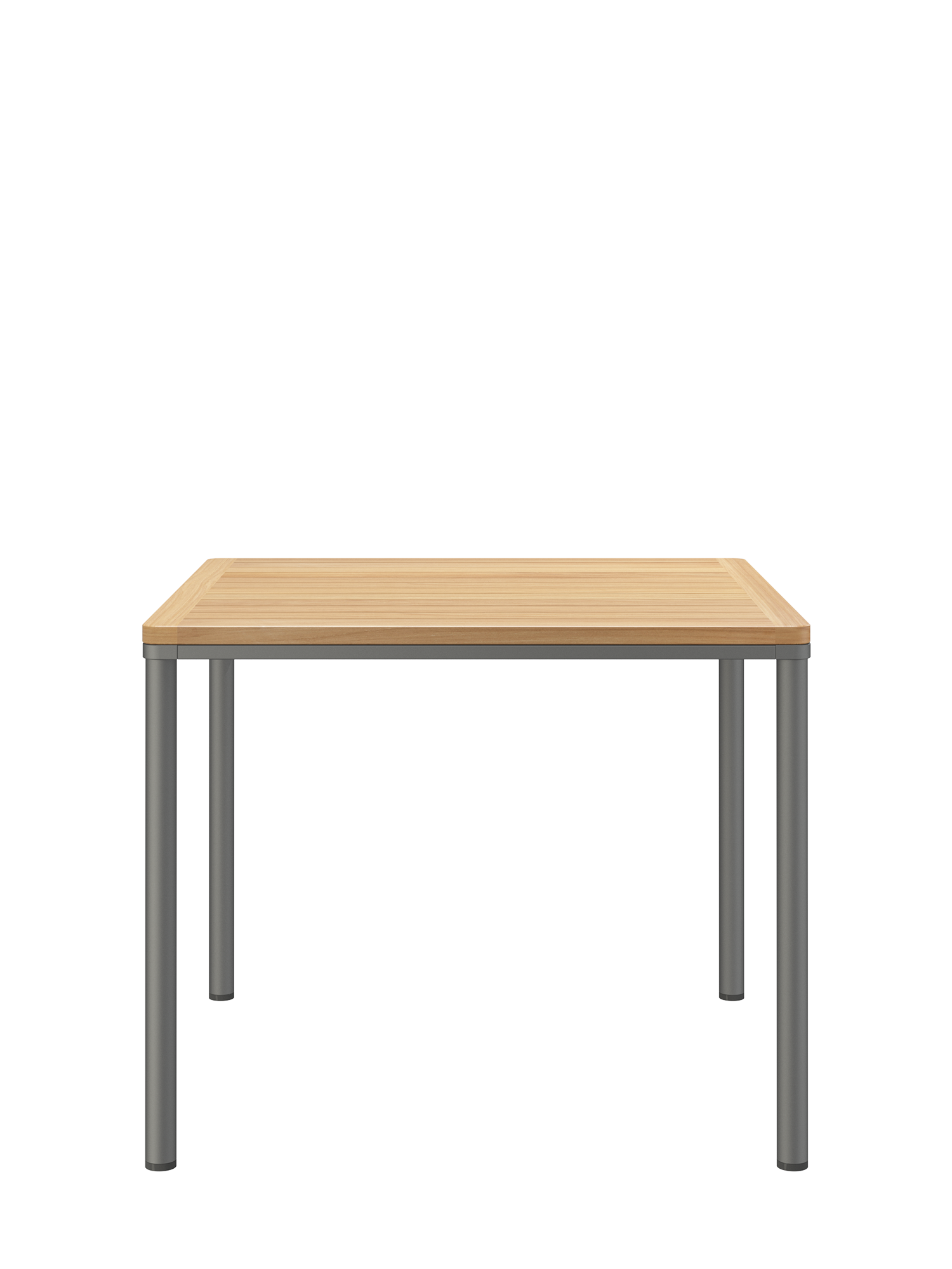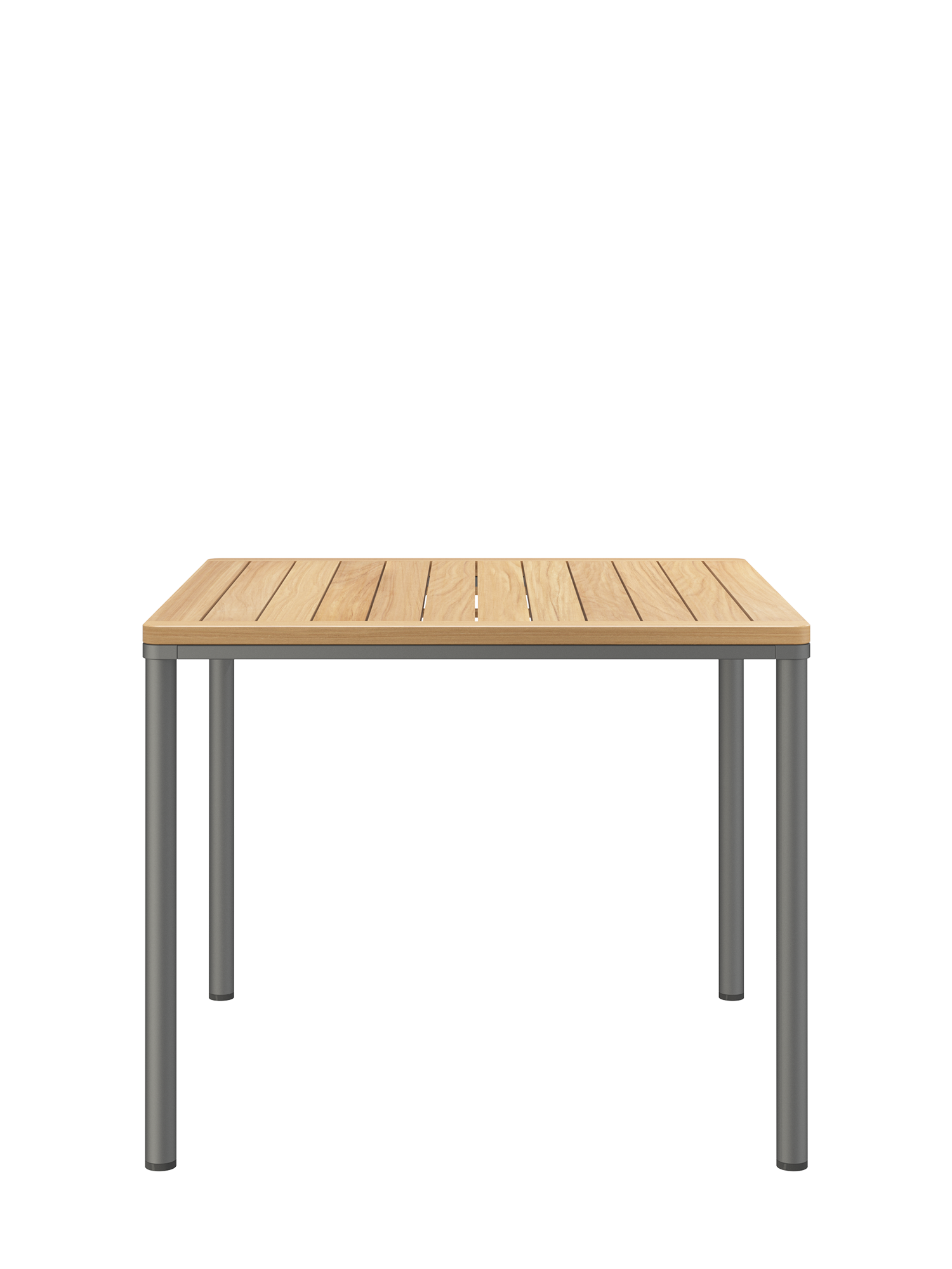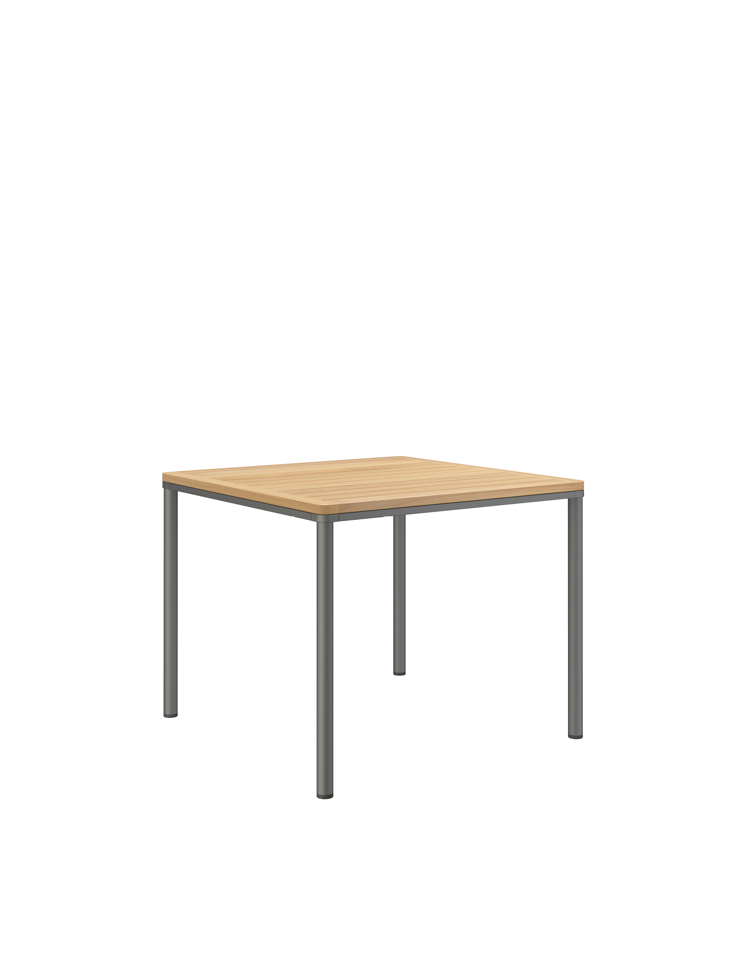 Das graphitgrau pulverbeschichtete Edelstahlgestell der Portland Tische verbindet diese mit allen Stühlen aus gleichem Material. Vier schlanke Beine tragen eine Platte, die mit der Zarge darunter wie aus einem Guss wirkt und in den Ecken der Rundung der Beine folgt. Die Oberfläche besteht aus wetterfestem Plantagenteakholz.