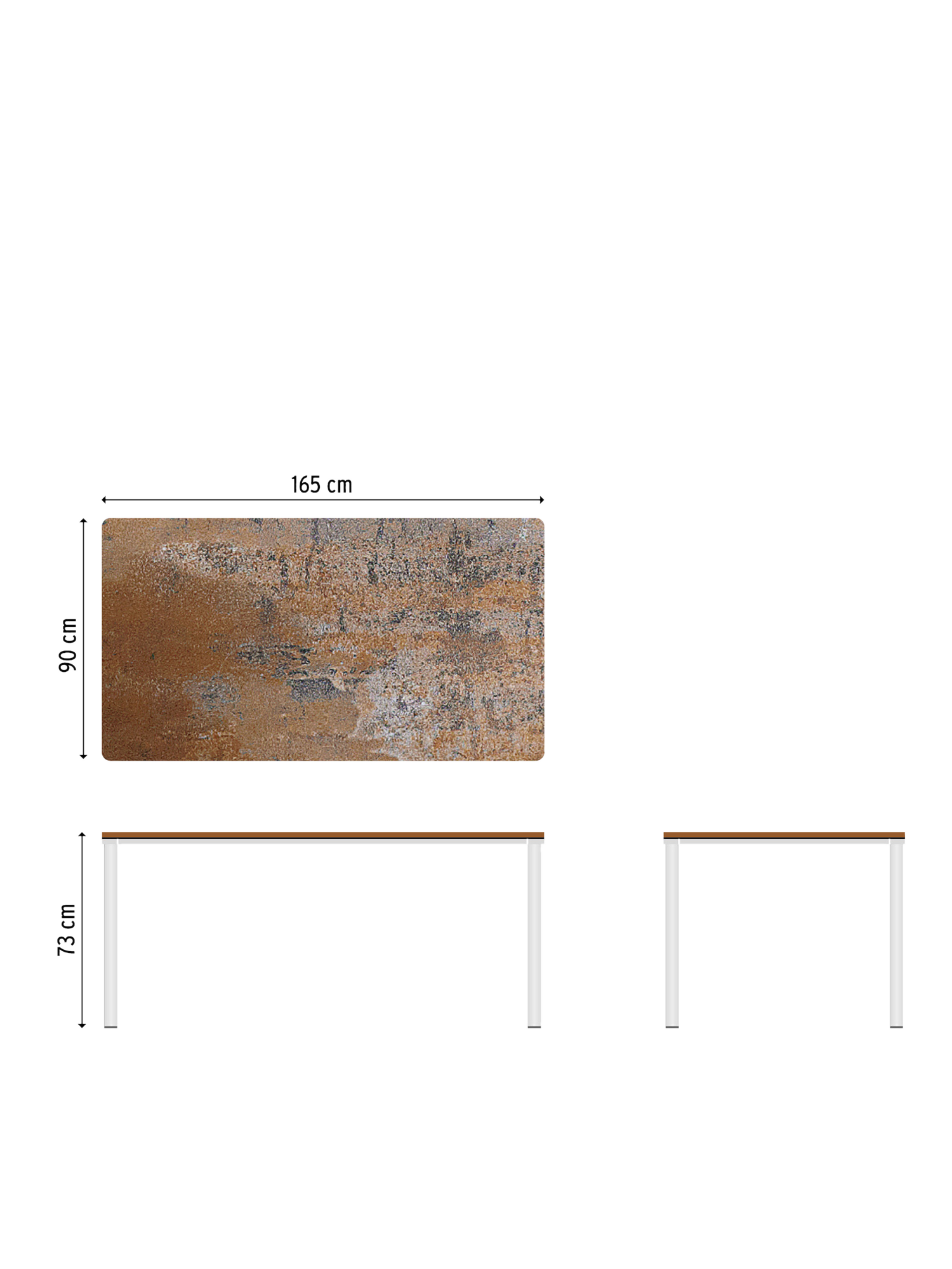 Das Edelstahlgestell der Portland Tische verbindet diese mit allen Stühlen aus gleichem Material. Vier schlanke Beine tragen eine Platte, die mit der Zarge darunter wie aus einem Guss wirkt und in den Ecken der Rundung der Beine folgt. Die Oberfläche besteht aus wetterfestem Kunstharz in einer patinierten Optik, die an verwittertes Eisen erinnert.