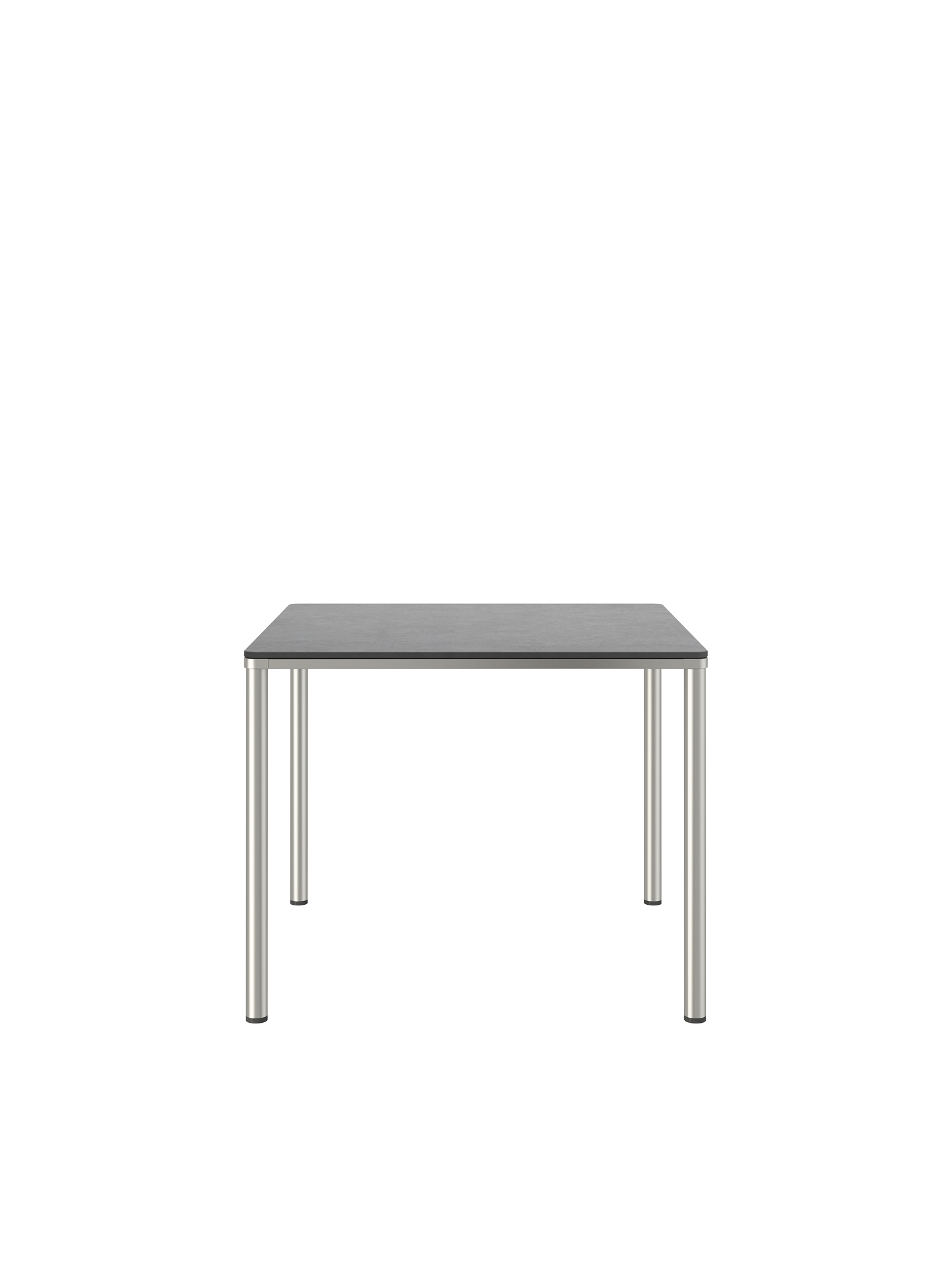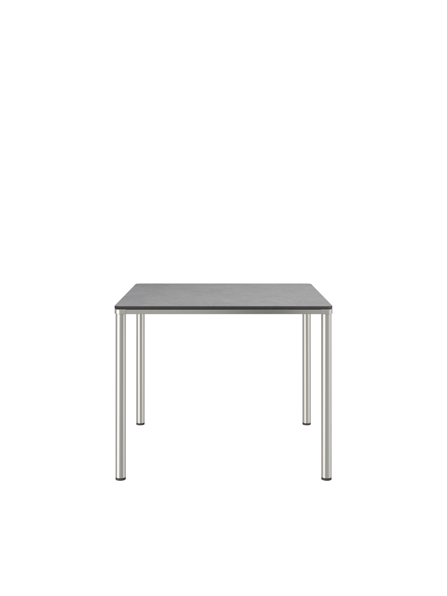Das Edelstahlgestell der Portland Tische verbindet diese mit allen Stühlen aus gleichem Material. Vier schlanke Beine tragen eine Platte, die mit der Zarge darunter wie aus einem Guss wirkt und in den Ecken der Rundung der Beine folgt. Die Oberfläche besteht aus wetterfestem Kunstharz im dunklen Farbton Shade.