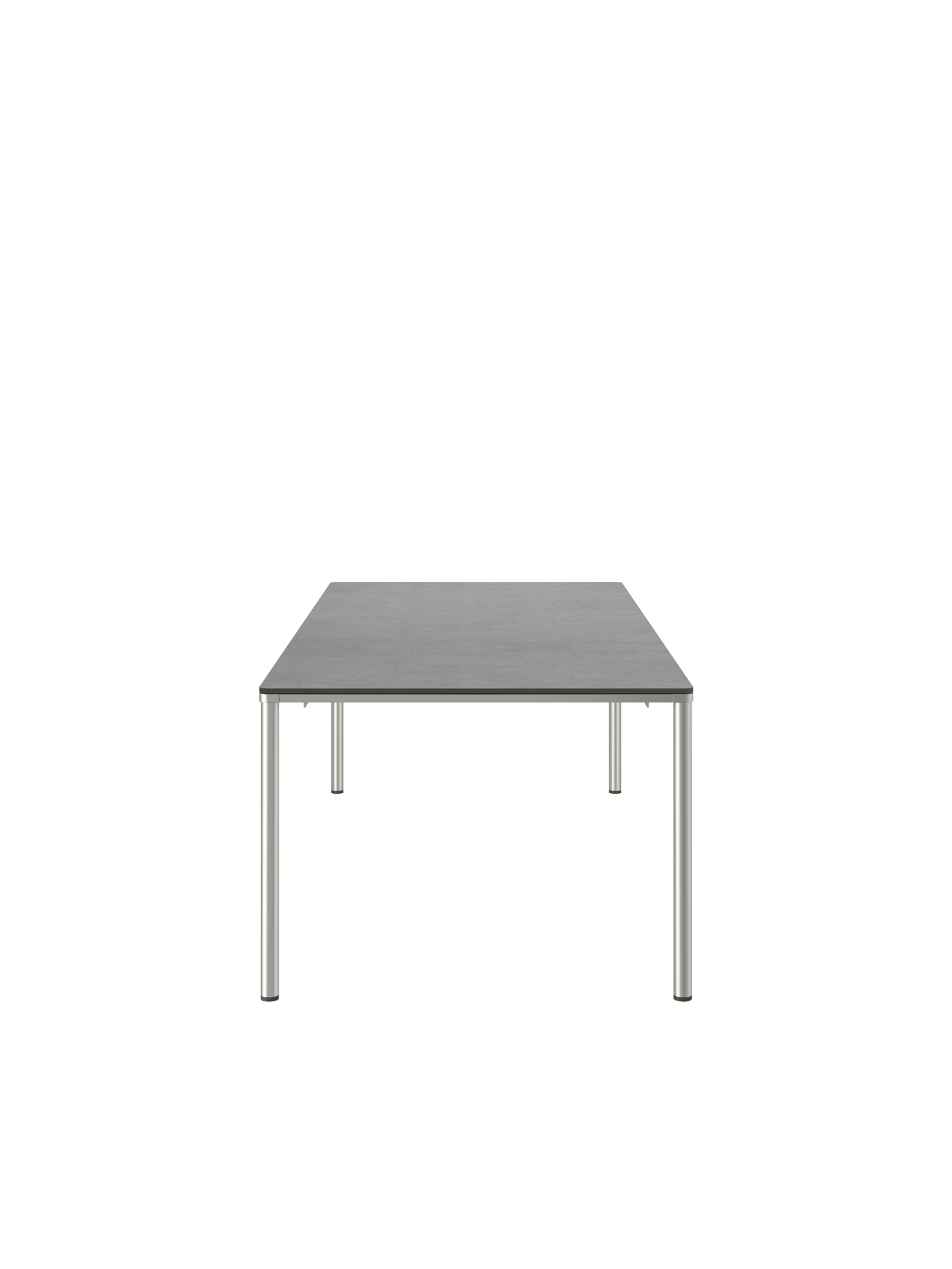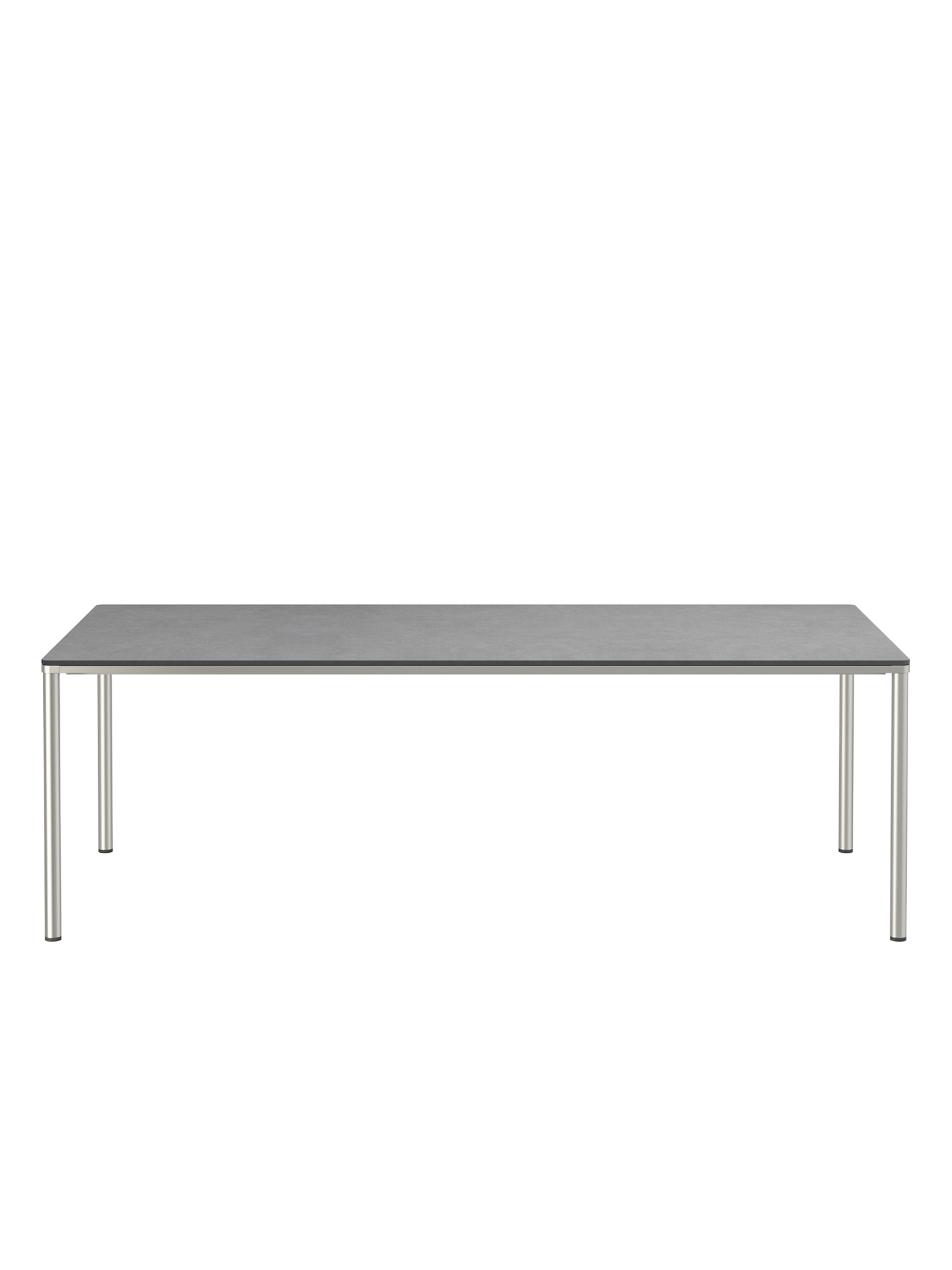 Eine umlaufende Zarge mit sanfter Rundung prägt das Design der Portlandtische. Sie sind der elegante Mittelpunkt jeder Gesellschaft. Die großzügigen Tischplatten aus Kunstharz ruhen auf vier schlanken Beinen, das solide Edelstahlgestell harmoniert perfekt mit den Stühlen unserer modernen Möbelserien.