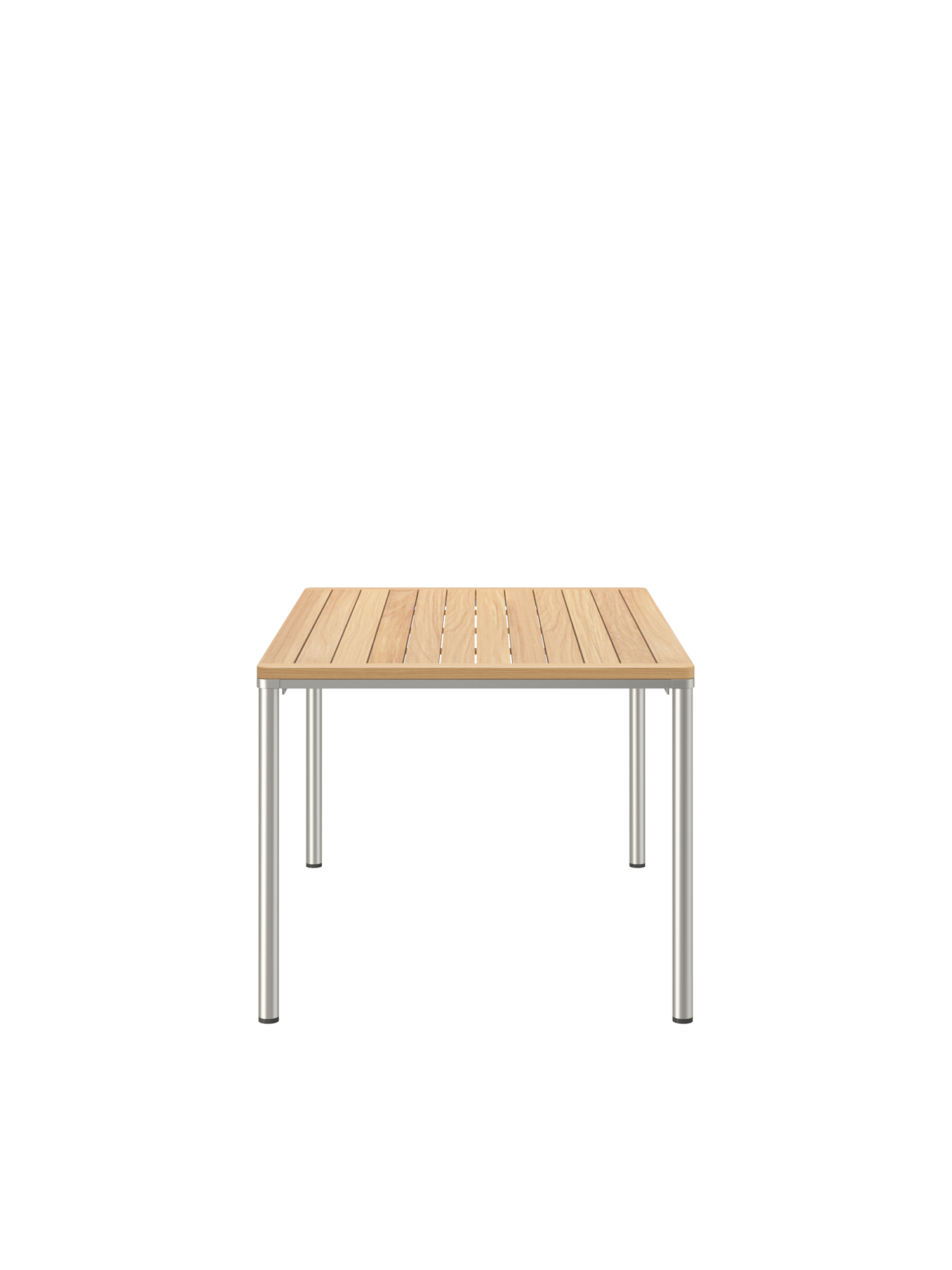 Die hochwertige Kombination aus einer Tischoberfläche aus Teakleisten und einem Gestell aus Edelstahl ermöglicht einen ganzjährigen Einsatz im Freien.