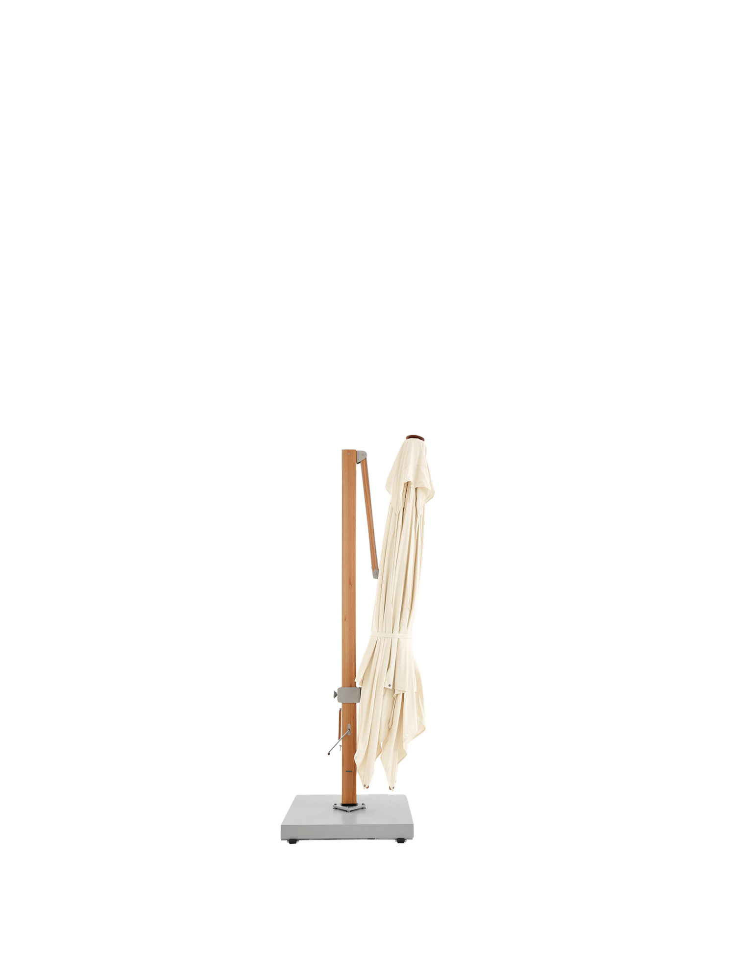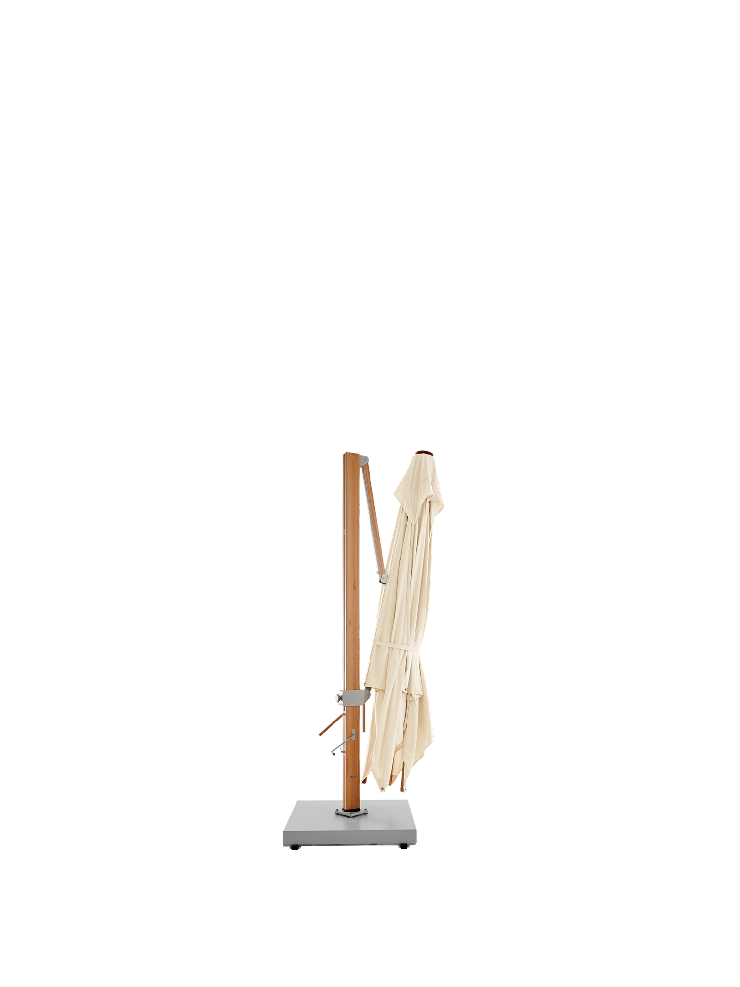 Seine Besonderheit: Ein Mast aus hochwertigem, wetterfestem Plantagenteak übernimmt die tragende Rolle. Das Schwebedach mit Windabzugshaube ist mit silbergrauem oder elfenbeinfarbenem, imprägniertem Polyacryl bespannt. Edelstahl setzt Akzente, Details aus pulverbeschichtetem Aluminium sind harmonisch auf den Farbton der Bespannungen abgestimmt.