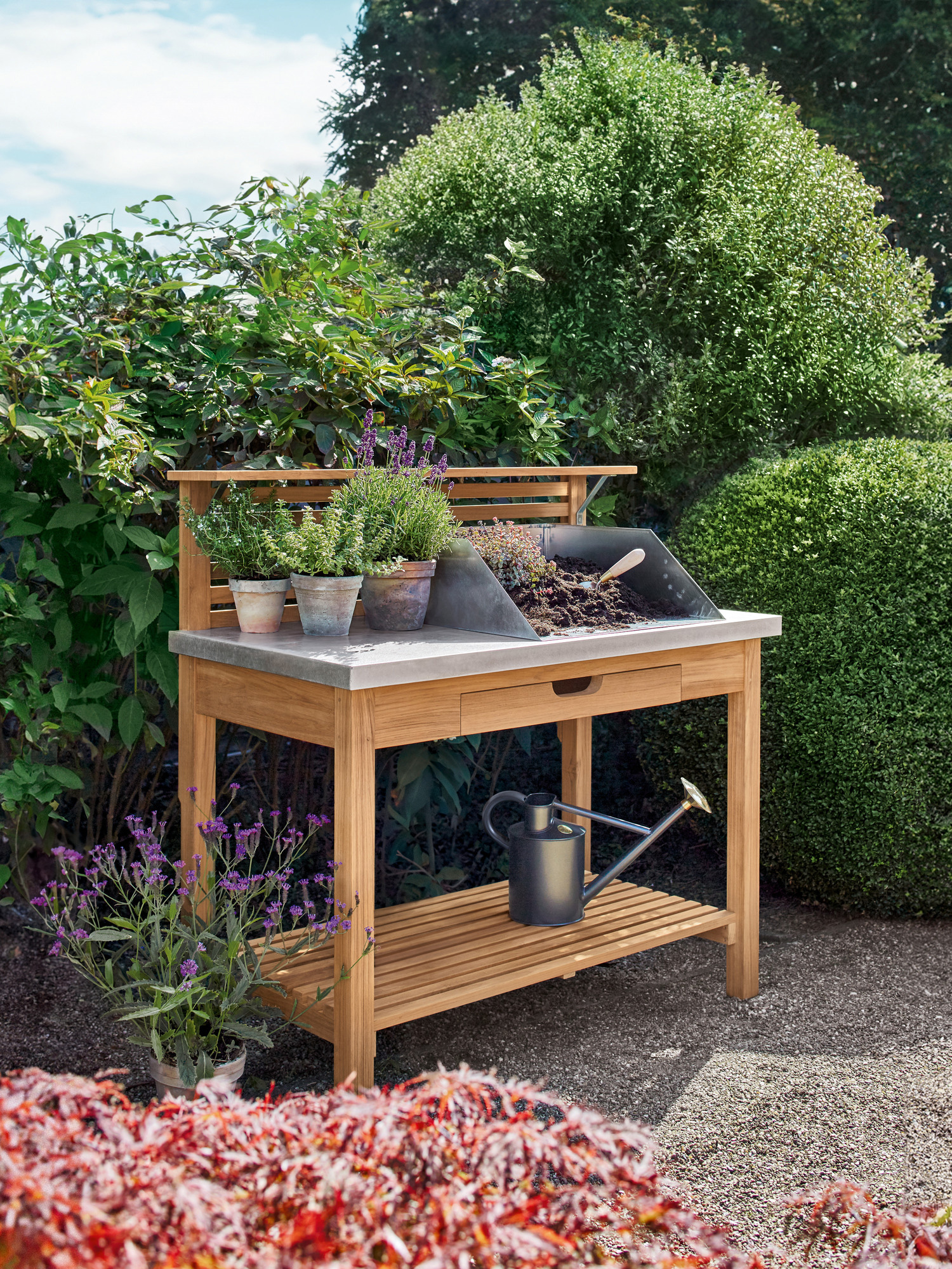 Der Pflanztisch aus massivem, wetterfestem Teak ist in England als unersetzliche "Potting Bench" berühmt. Er ist mit Zink ummantelt, was verhindert, dass beim Pikieren und Pflanzen Bakterien übertragen werden. Ein kleines Regal sowie der Bodenrost bieten Abstellfläche. Die Schublade eignet sich für kleine Geräte und Samentütchen. Eine Schale aus Titanzink zum Anmischen von Erde ist im Lieferumfang enthalten.