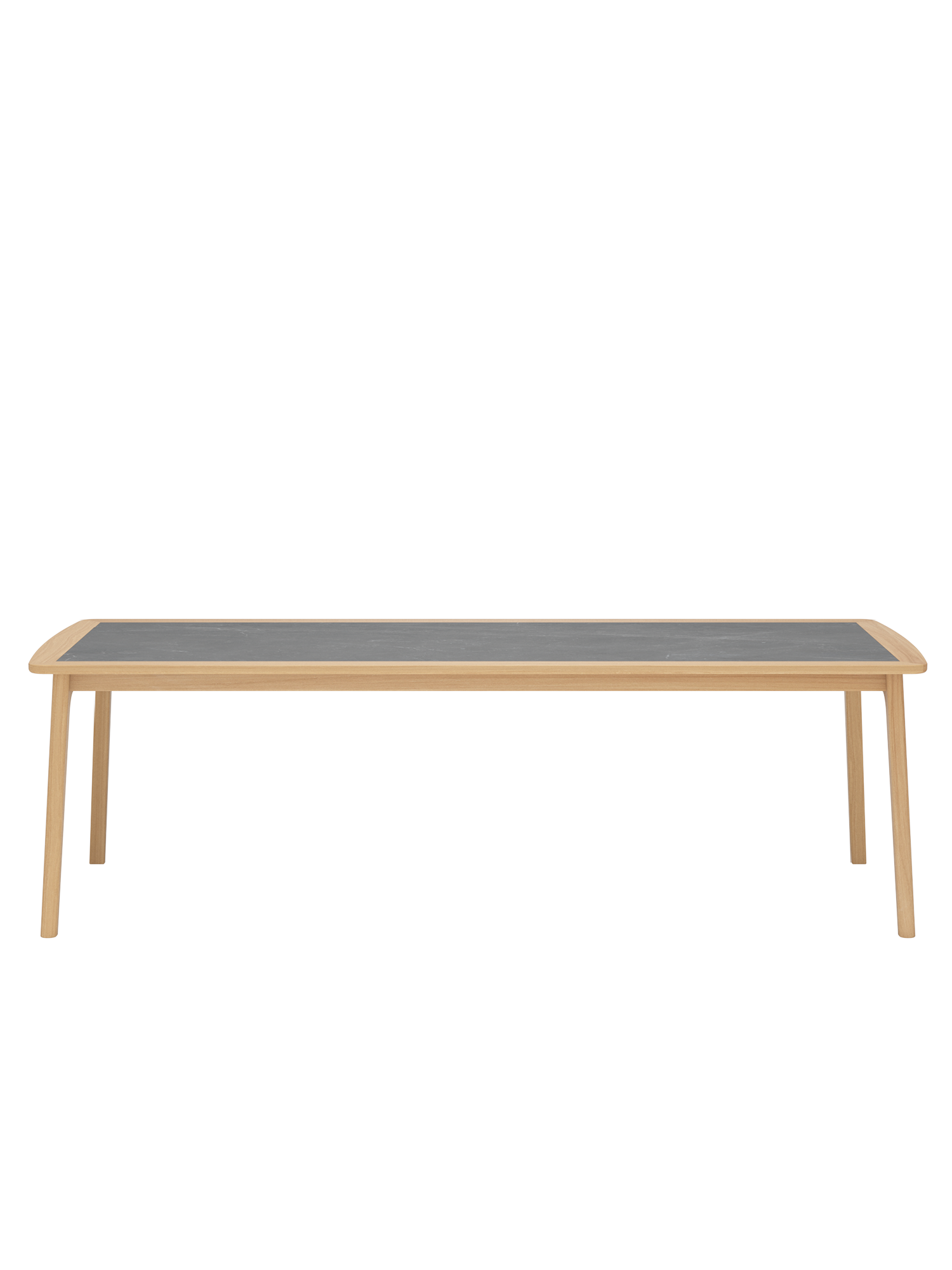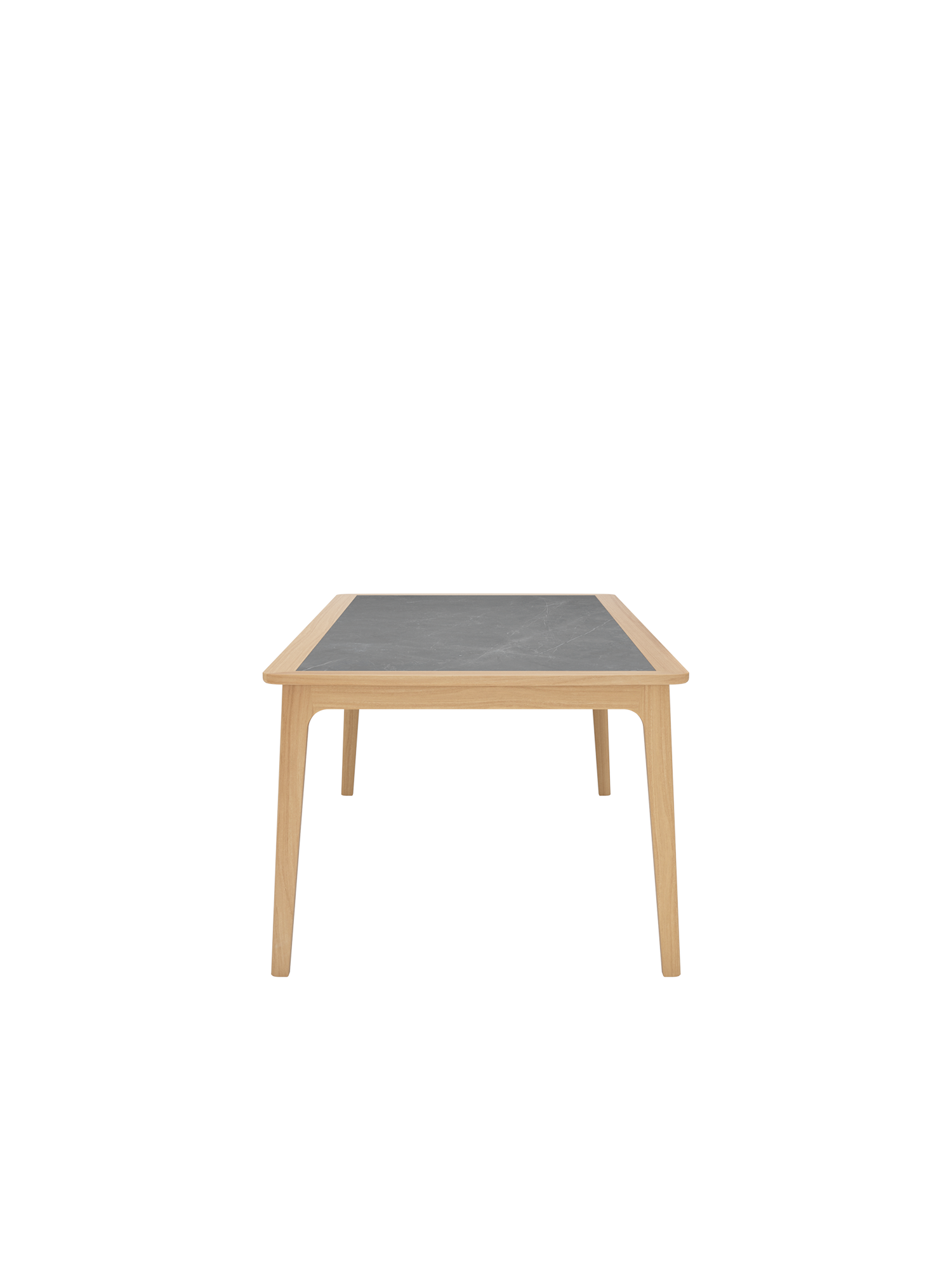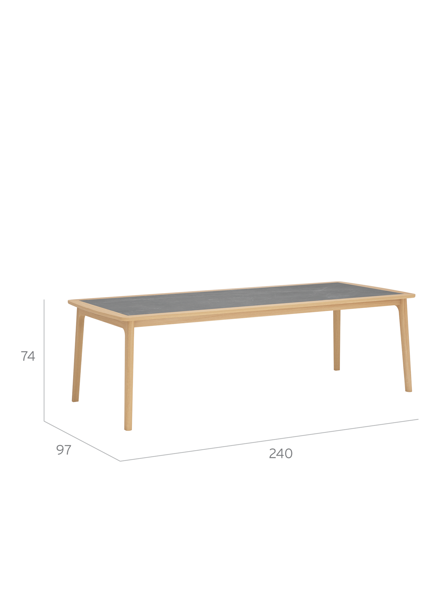 Die Oberfläche des geradlinigen Esstisches besteht aus einer frostfesten, mattgrauen Keramik mit eleganter Maserung. Ihre dezente Marmorierung macht aus jeder Tischplatte ein Unikat. Die Tischplatte wird in den umlaufenden Rahmen aus hochwertigem Plantagenteak eingelegt.