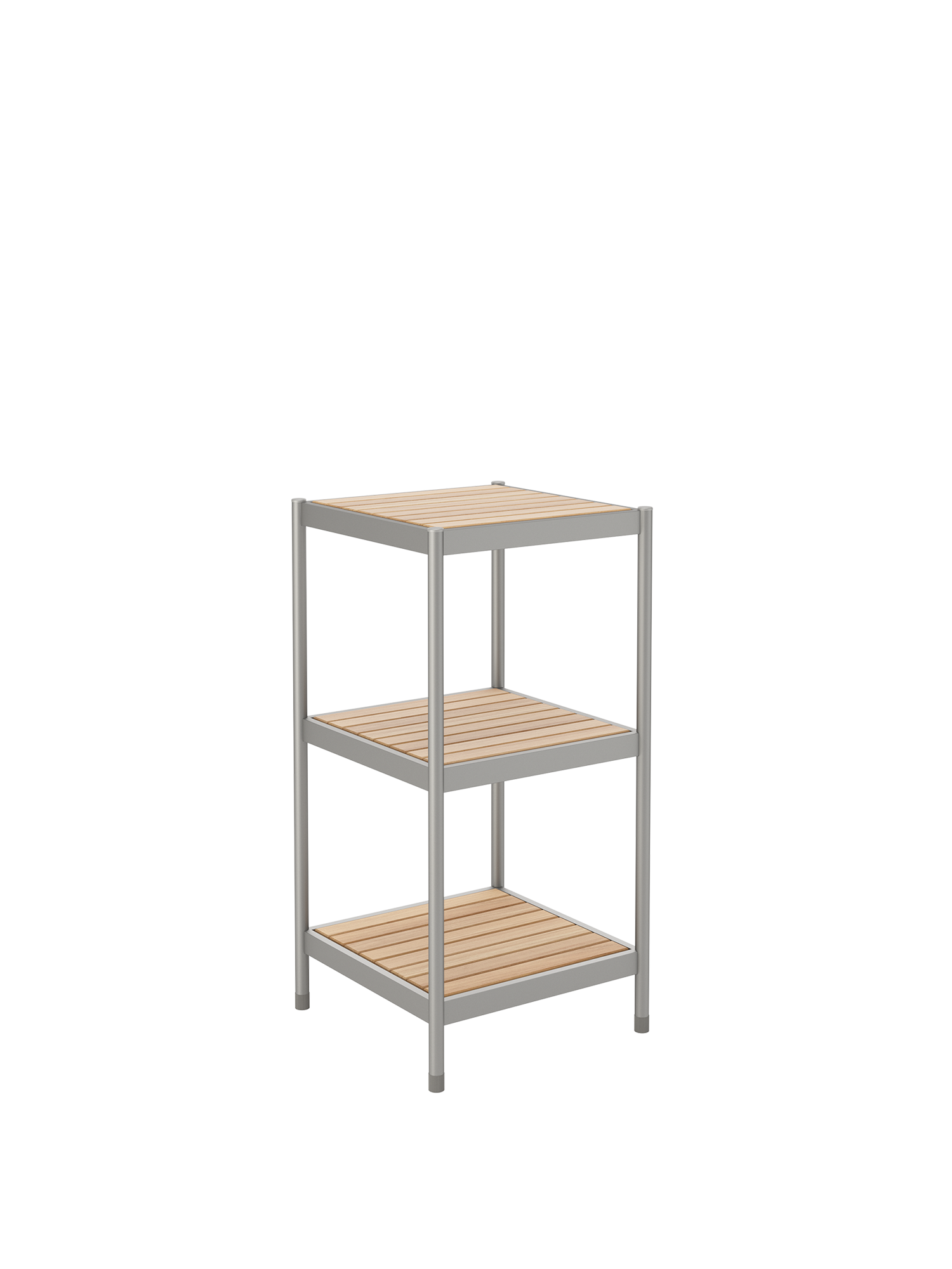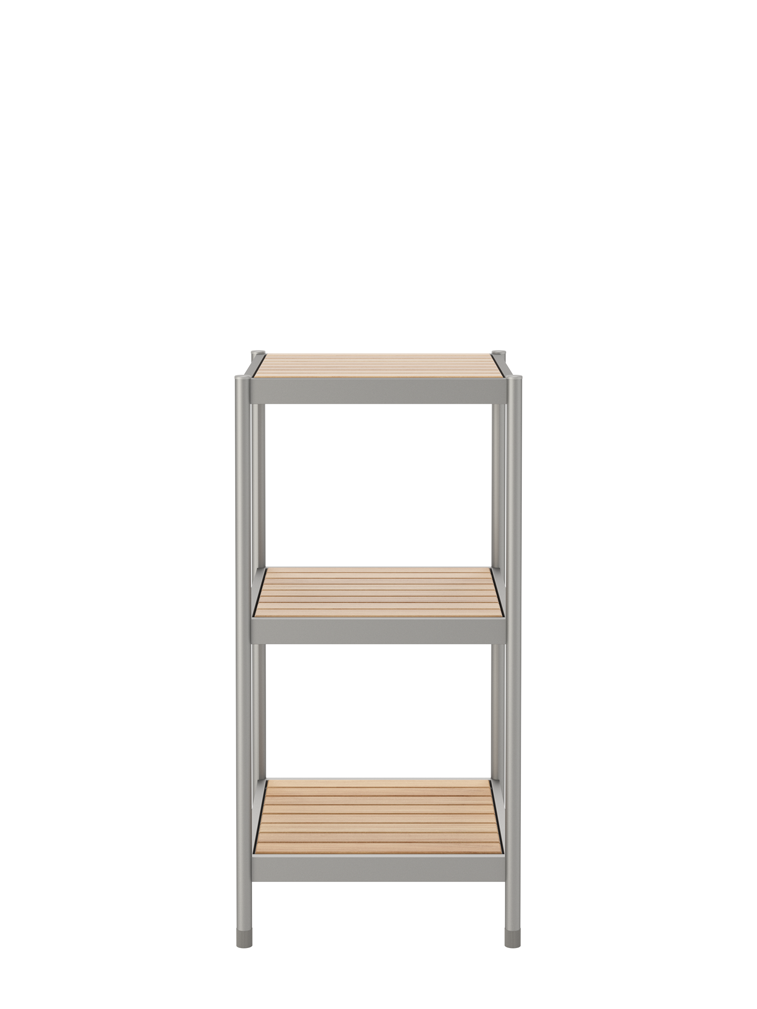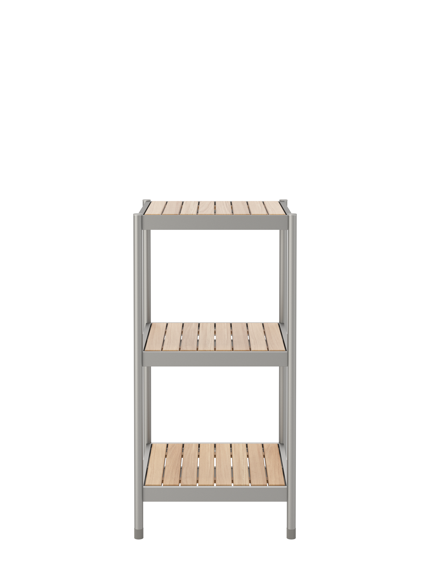 Das wetterfeste Gartenregal aus eloxiertem Aluminium fügt sich mit seinem reduzierten Design und einem sanft changierenden Farbton harmonisch in jede Umgebung. Als Solitär, als schmales Element in einer Reihe oder als Ecklösung lässt es sich ganz nach Wunsch auch mit weiteren Modulen der Rana Kollektion zusammenstellen. Auf drei Ebenen, deren separat zu bestellende Einlegeböden aus verschiedenen Materialien frei wählbar sind, bietet es praktische Ablagefläche für Geschirr, Accessoires oder Utensilien für die Outdoor-Küche. Höhenversteller an den Beinen gleichen Unebenheiten im Boden aus.