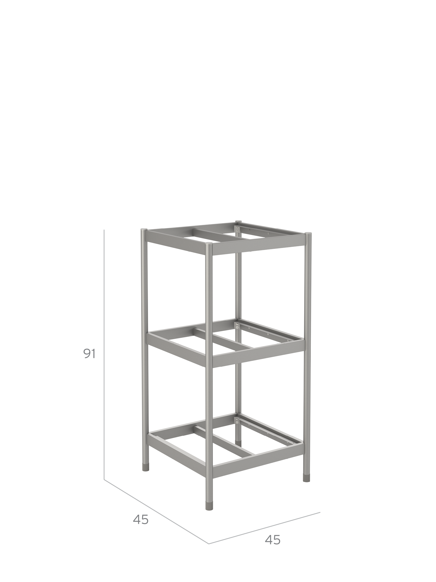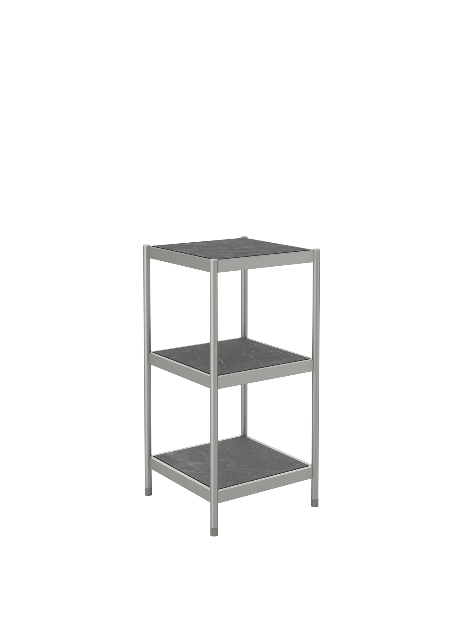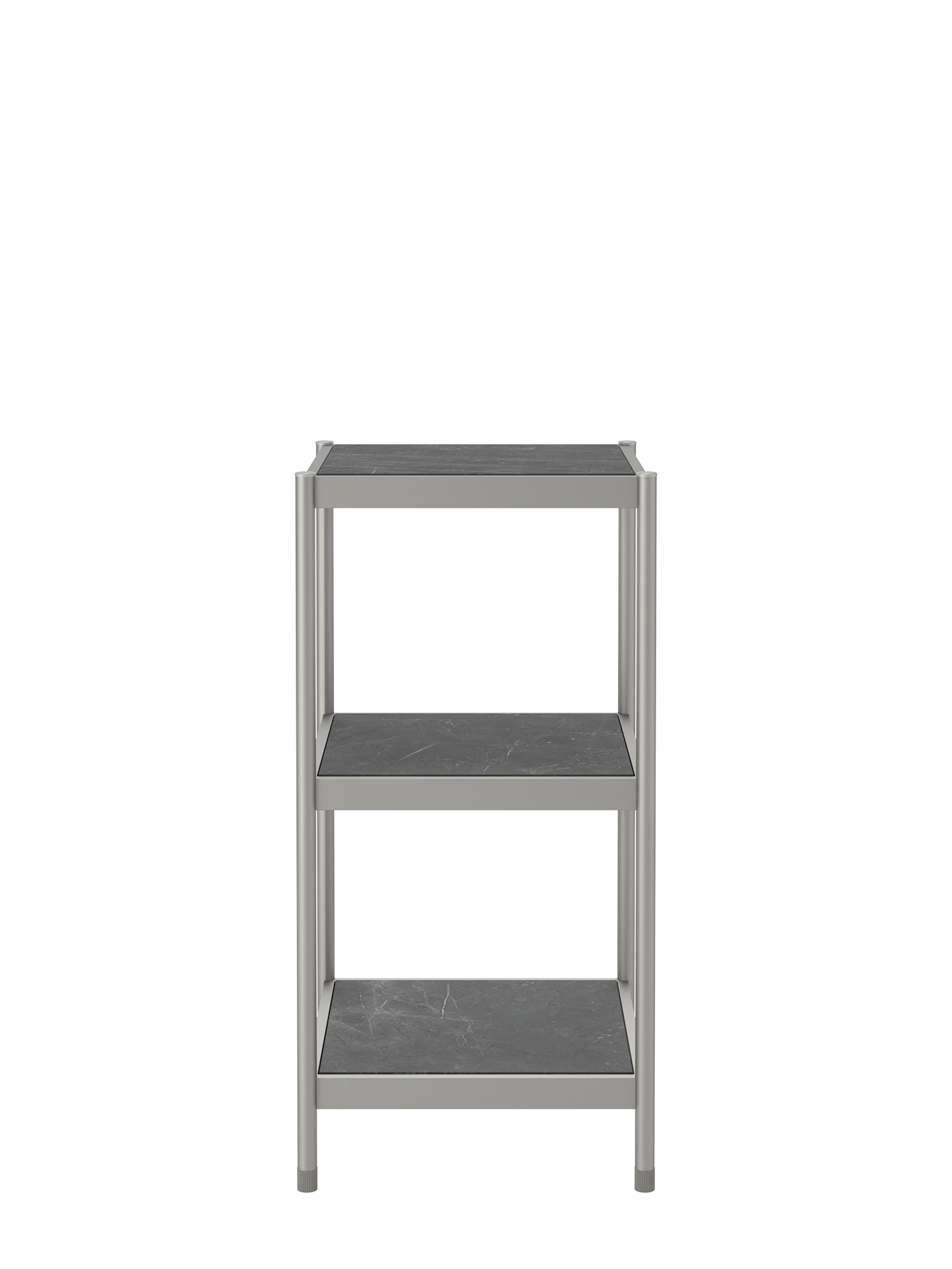 Das wetterfeste Gartenregal aus eloxiertem Aluminium fügt sich mit seinem reduzierten Design und einem sanft changierenden Farbton harmonisch in jede Umgebung. Als Solitär, als schmales Element in einer Reihe oder als Ecklösung lässt es sich ganz nach Wunsch auch mit weiteren Modulen der Rana Kollektion zusammenstellen. Auf drei Ebenen, deren separat zu bestellende Einlegeböden aus verschiedenen Materialien frei wählbar sind, bietet es praktische Ablagefläche für Geschirr, Accessoires oder Utensilien für die Outdoor-Küche. Höhenversteller an den Beinen gleichen Unebenheiten im Boden aus.