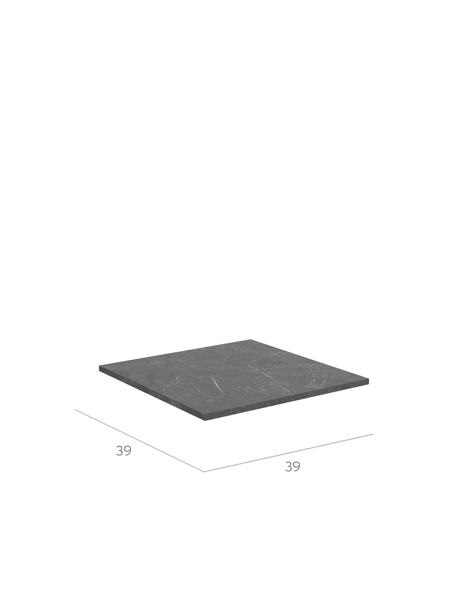 Der Einlegeboden aus fein gemaserter Keramik harmoniert perfekt mit dem eloxierten Aluminiumrahmen des passenden Rana Regals.