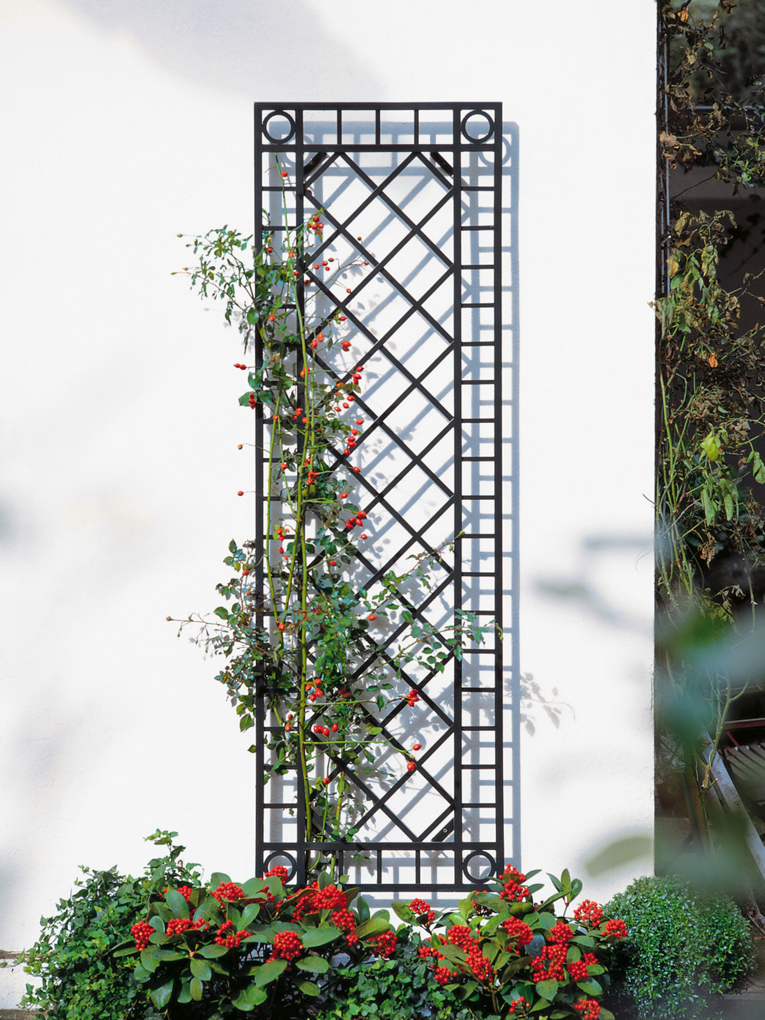 Edle Kletterhilfe für Pflanzen zur Verschönerung Ihres Mauerwerks. Die Rankwand besteht aus wetterfestem Aluminium, das dunkelgrün pulverbeschichtet ist. Starke Halterungen am Rücken geben den Abstand zum Mauerwerk vor, so dass die Pflanzen auch Luft finden. Die Rankwände sind in zwei Breiten erhältlich. Bitte beachten Sie, dass die Montage nicht durch unsere Vertragsspedition ausgeführt werden kann.