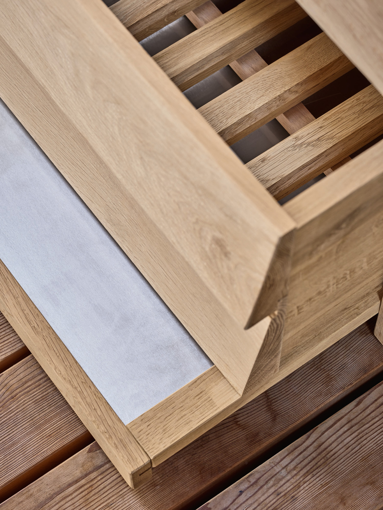 Da die Horde aus unbehandelter Eiche nicht wasserfest ist und Obst und Gemüse nicht in der Sonne aufbewahrt werden sollten, empfehlen wir die Aufstellung unter einem Dach – z. B. im Schuppen oder in der Garage. Die Schmutzfanglade mit einem Bodenblech aus Aluminium kann für die Reinigung herausgezogen werden.
