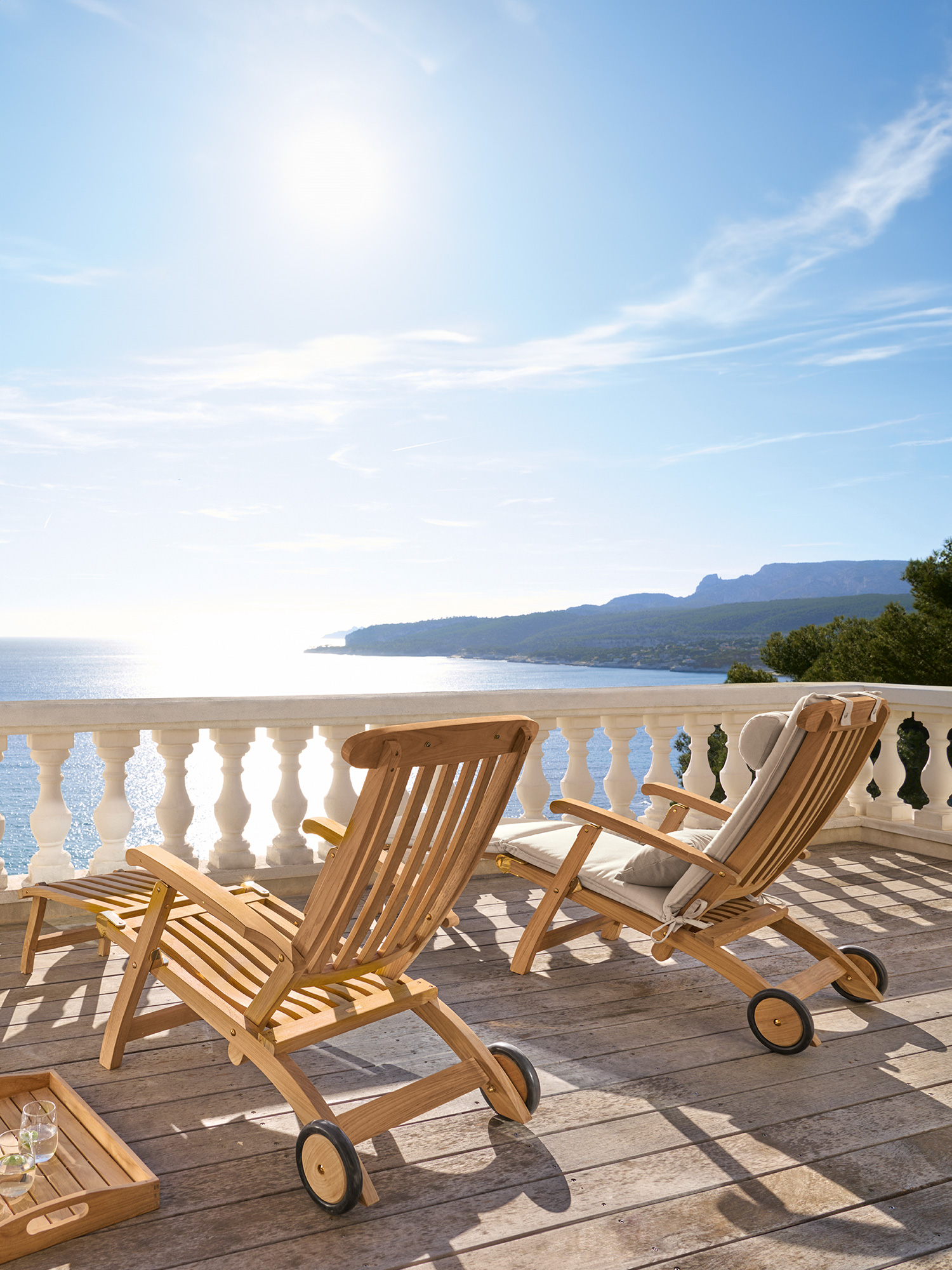 Die Teakleisten der Sitz- und Rückenfläche sind nach den Körperlinien geformt, die Armlehnen sanft gerundet - sie sorgen für den besonderen Komfort, der unseren Deck Chair auszeichnet.